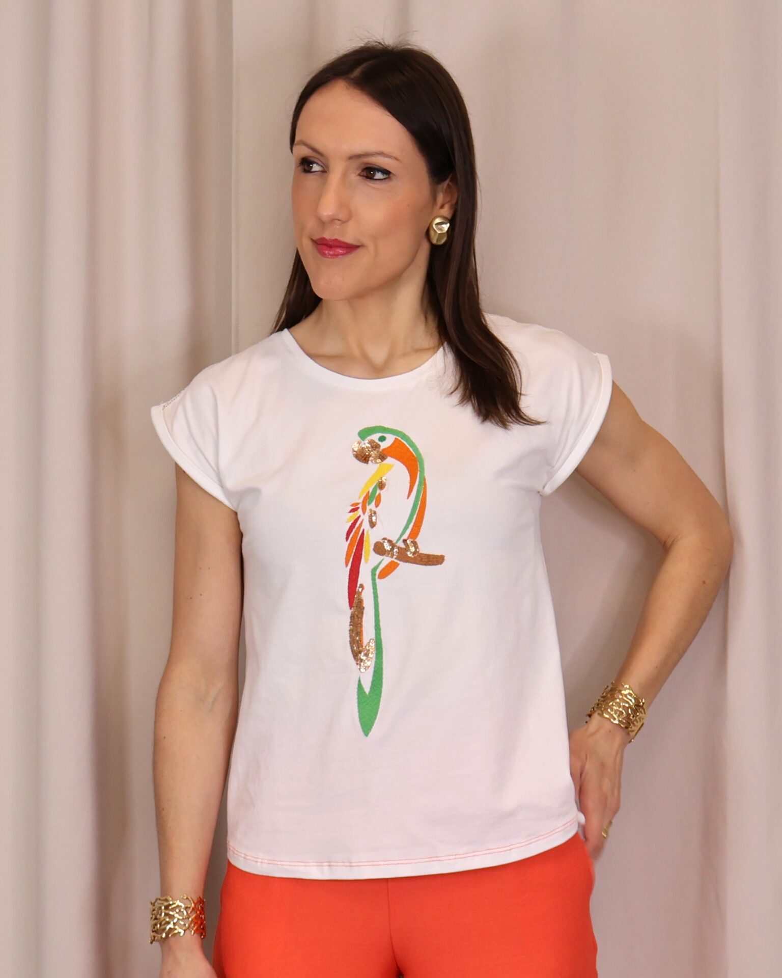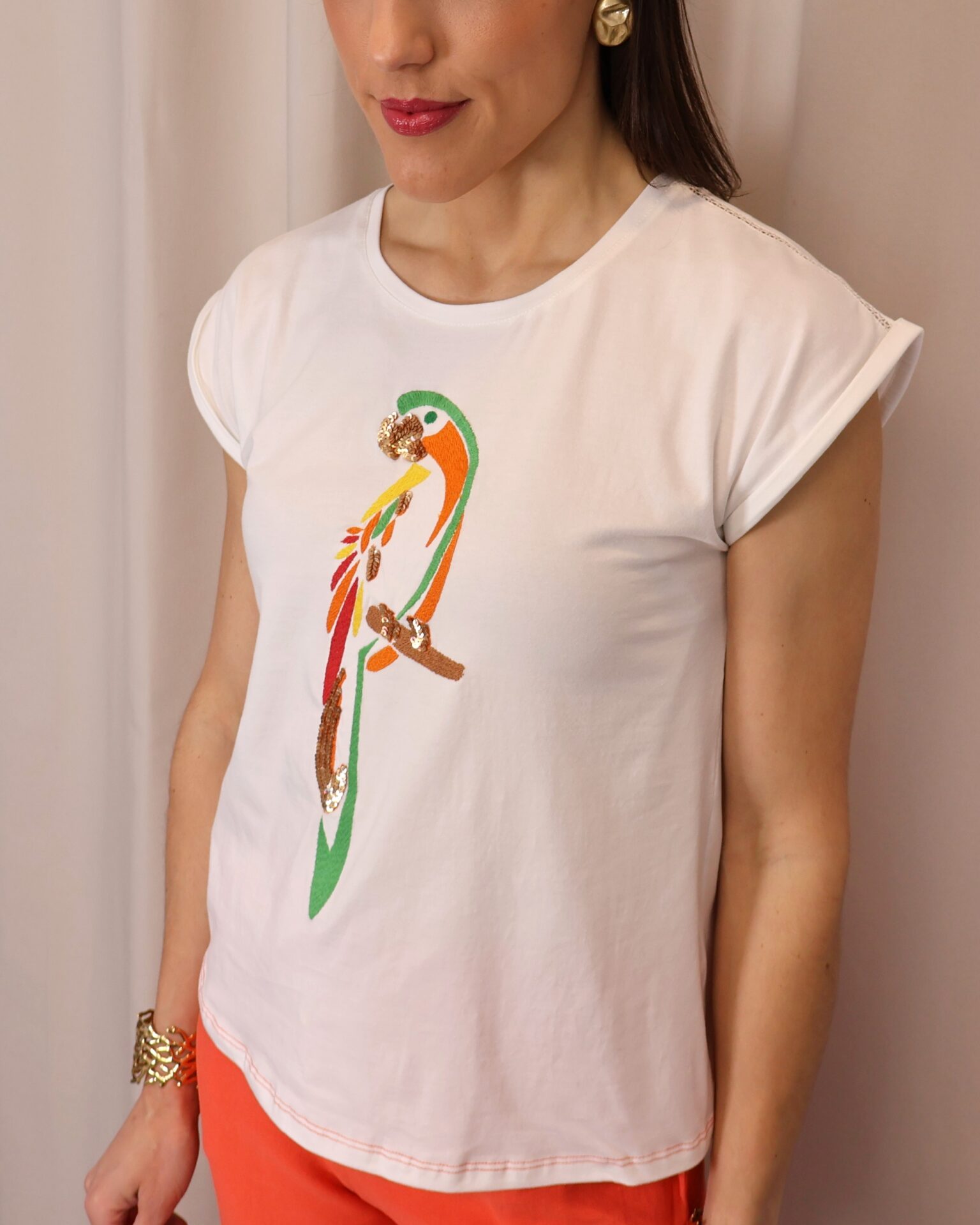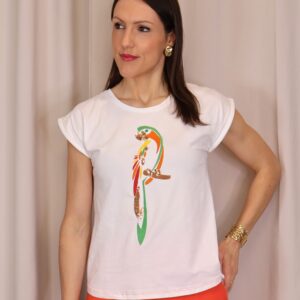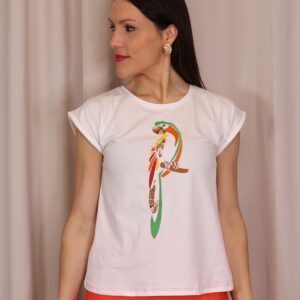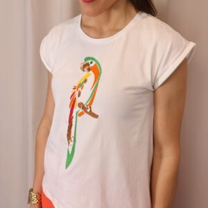 Camiseta de mujer en color blanco, confeccionada en tejido suave y cómodo que aporta ligereza para el día a día. Presenta un diseño de manga corta con acabado ligeramente vuelto y cuello redondo clásico. Destaca por su original estampado frontal de loro en tonos vibrantes como verde, naranja y rojo, con detalles decorativos que aportan un toque llamativo y diferente. Su corte recto la convierte en una prenda versátil, ideal para combinar con looks casuales o dar un toque divertido a conjuntos más neutros.