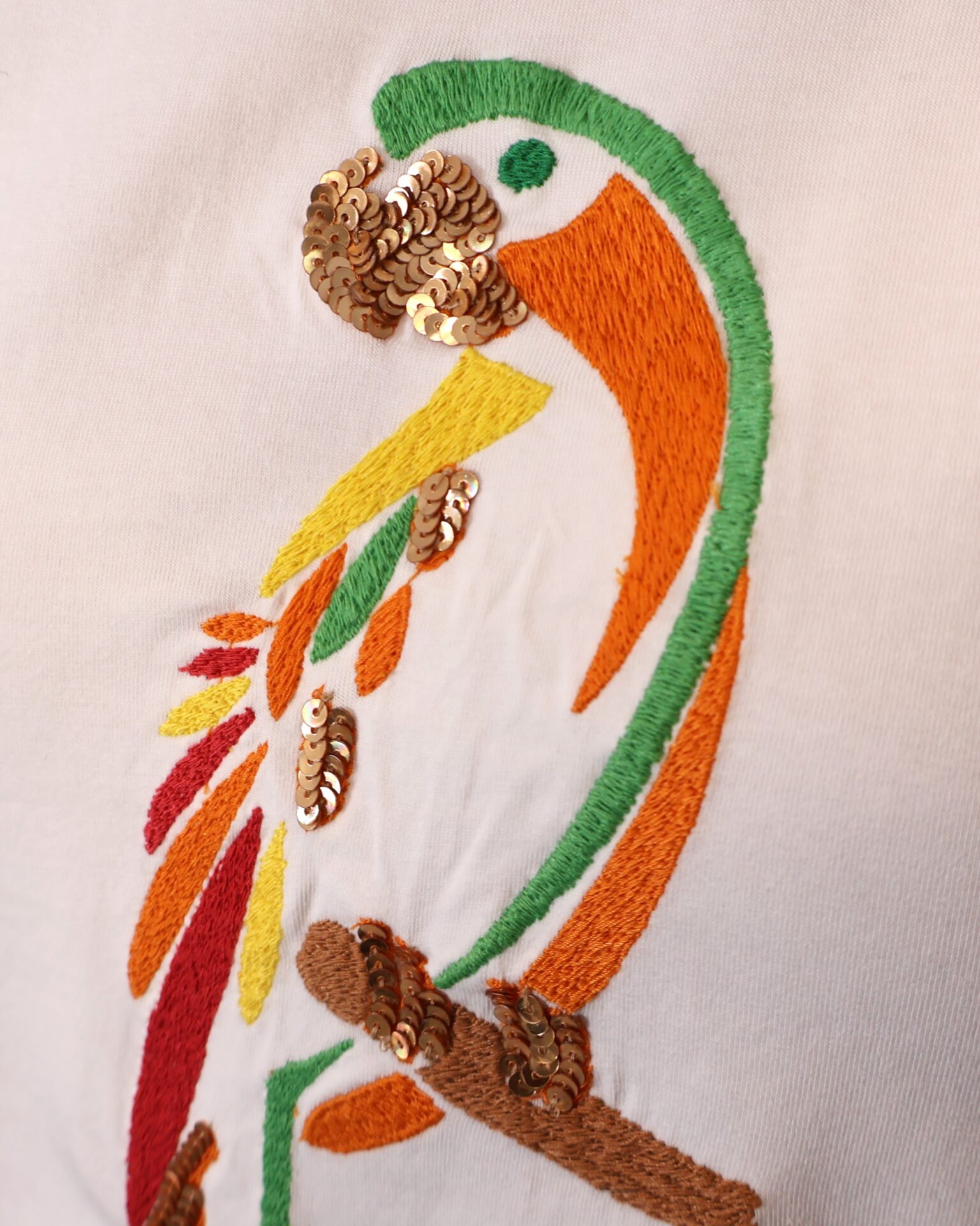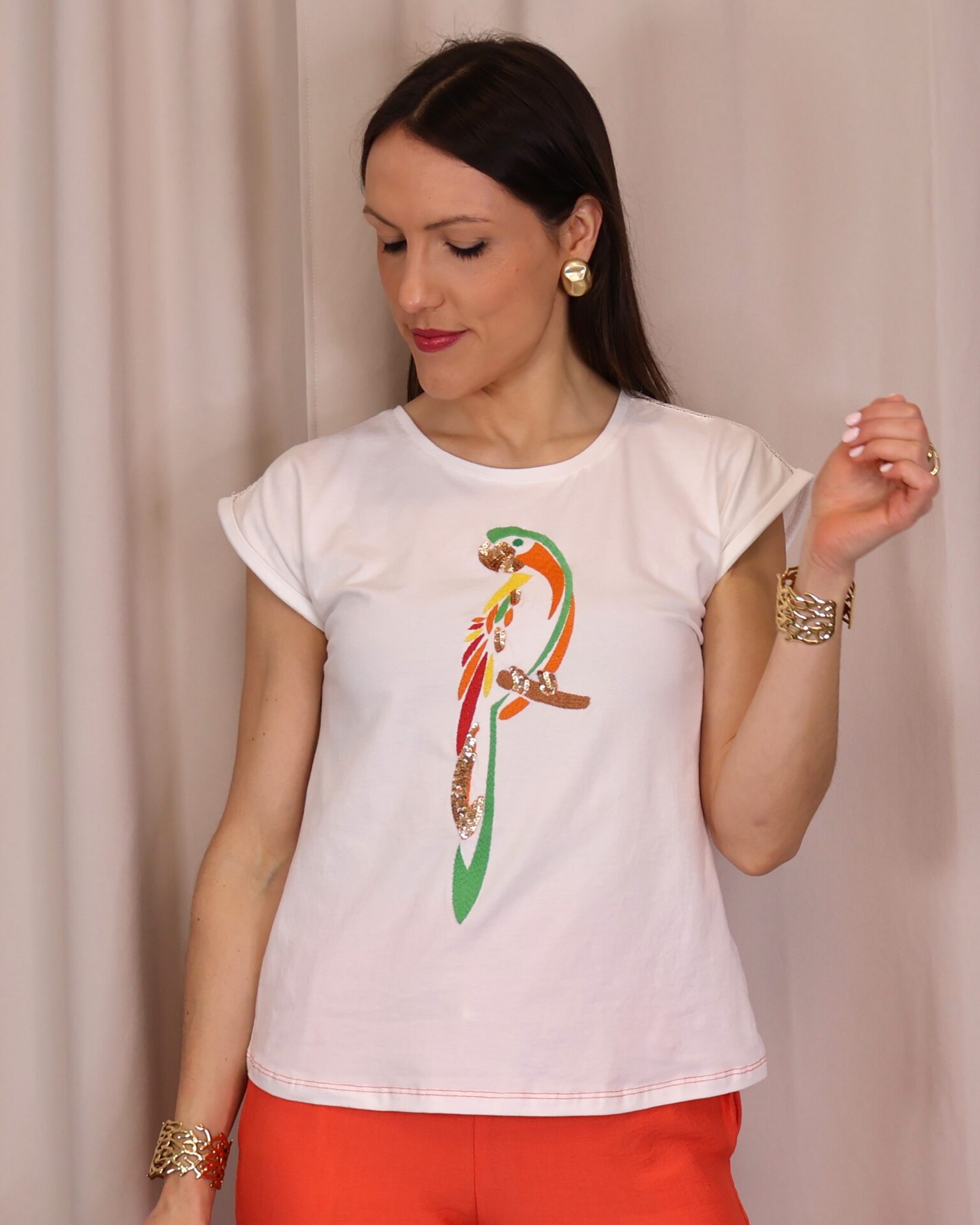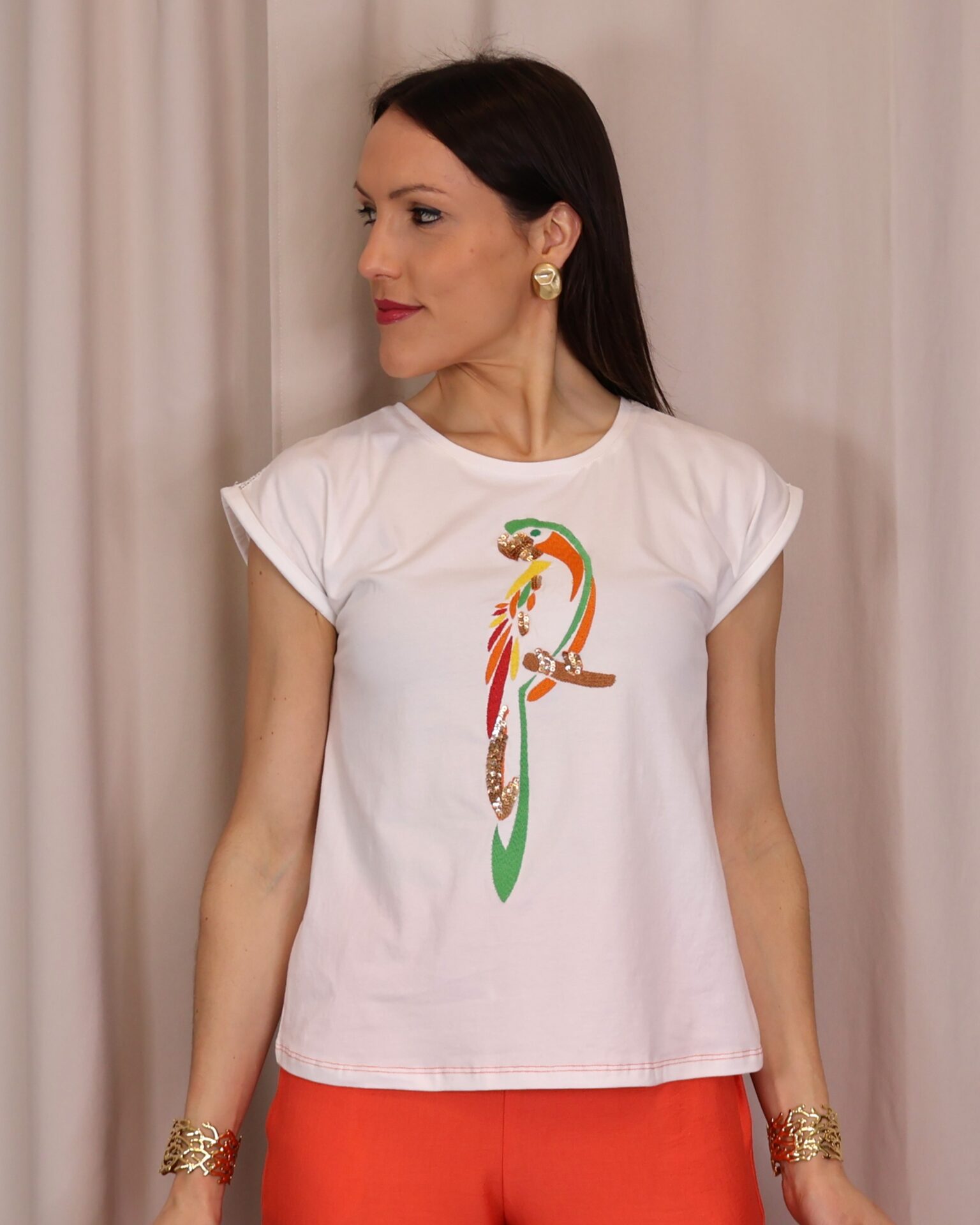 Camiseta de mujer en color blanco, confeccionada en tejido suave y cómodo que aporta ligereza para el día a día. Presenta un diseño de manga corta con acabado ligeramente vuelto y cuello redondo clásico. Destaca por su original estampado frontal de loro en tonos vibrantes como verde, naranja y rojo, con detalles decorativos que aportan un toque llamativo y diferente. Su corte recto la convierte en una prenda versátil, ideal para combinar con looks casuales o dar un toque divertido a conjuntos más neutros.