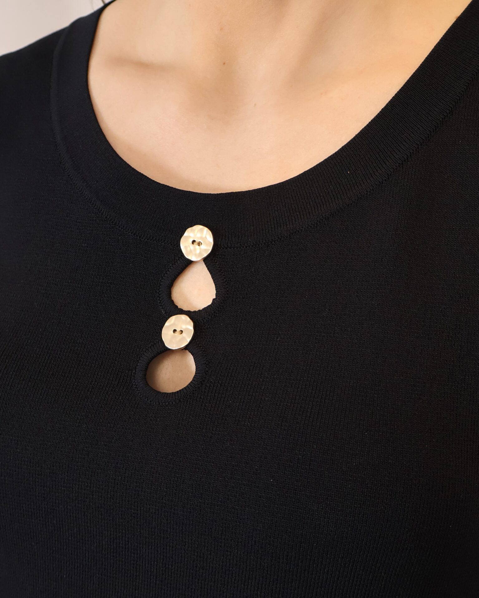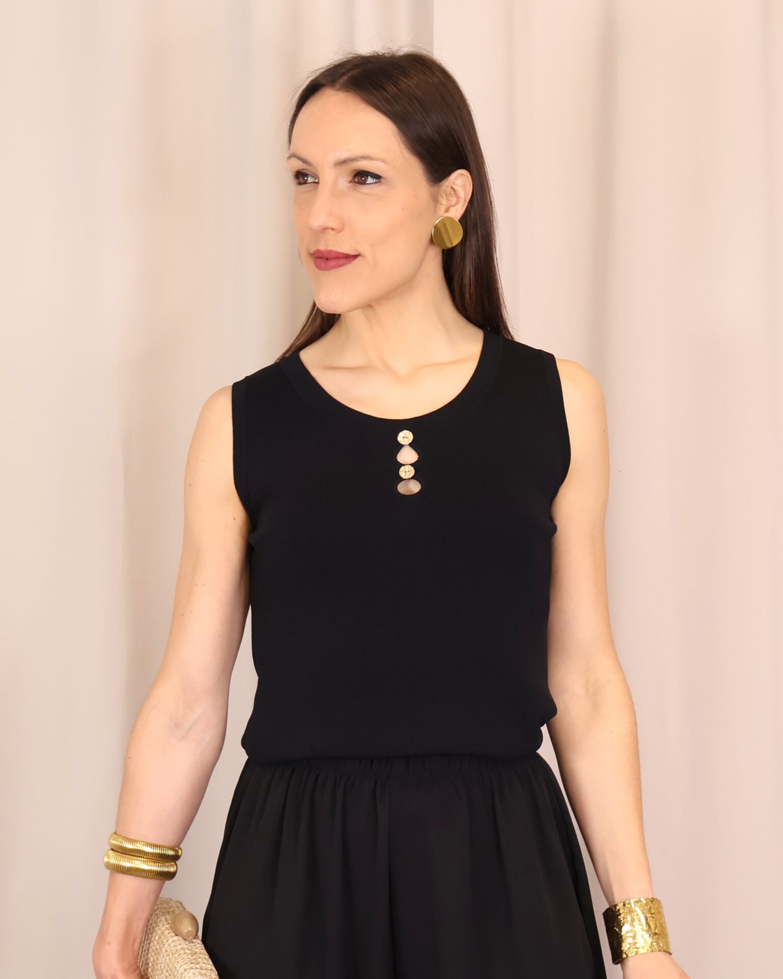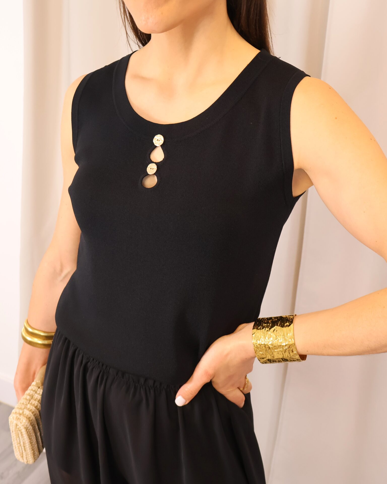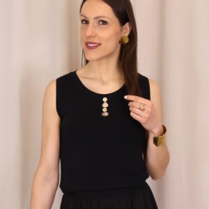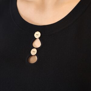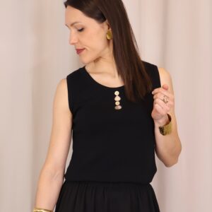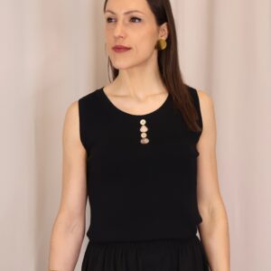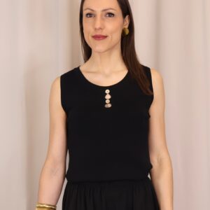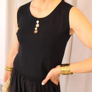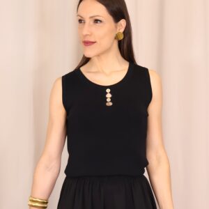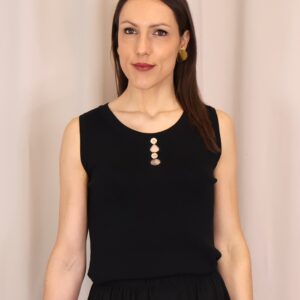 Top de punto fino en color negro, con tejido suave que se adapta a la silueta ofreciendo comodidad y una caída elegante. Su diseño sin mangas lo convierte en una prenda versátil, ideal para llevar sola o bajo una blazer. Destaca el cuello redondo con botones en disposición vertical, que aportan luz y crean sutiles aberturas tipo cut-out para un toque moderno y femenino. Con acabados limpios y estética minimalista, es un básico imprescindible para looks tanto formales como casual-chic.