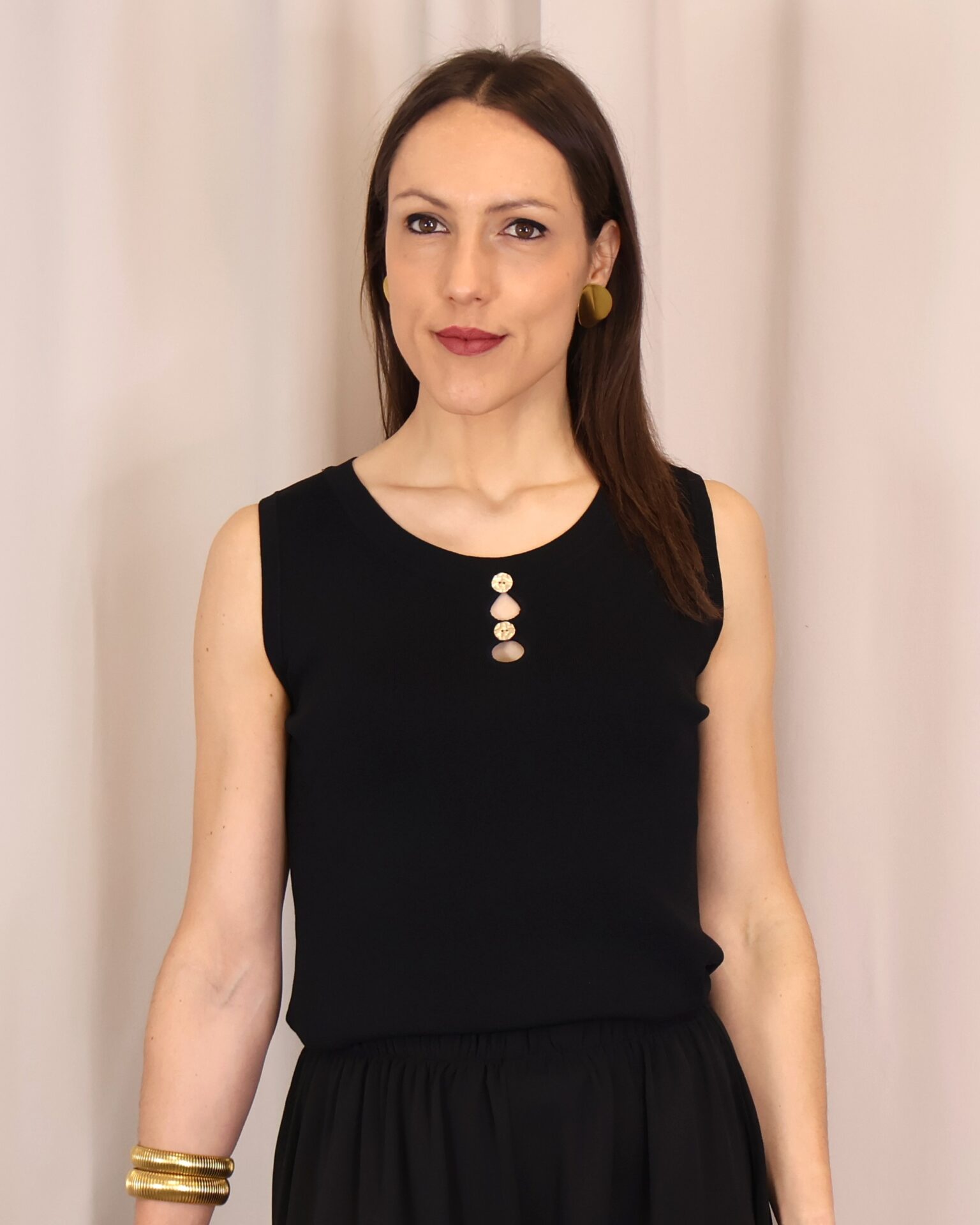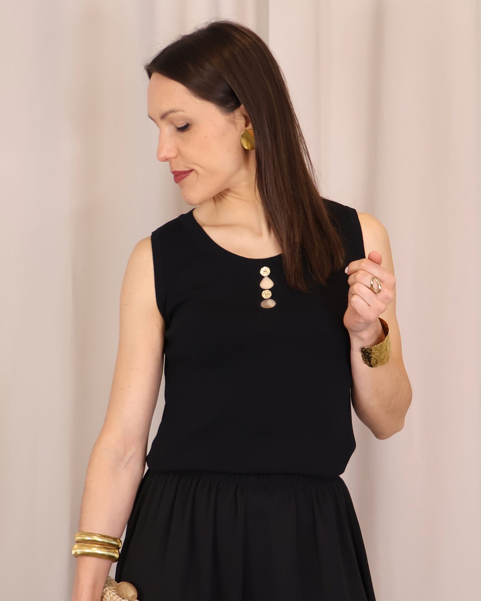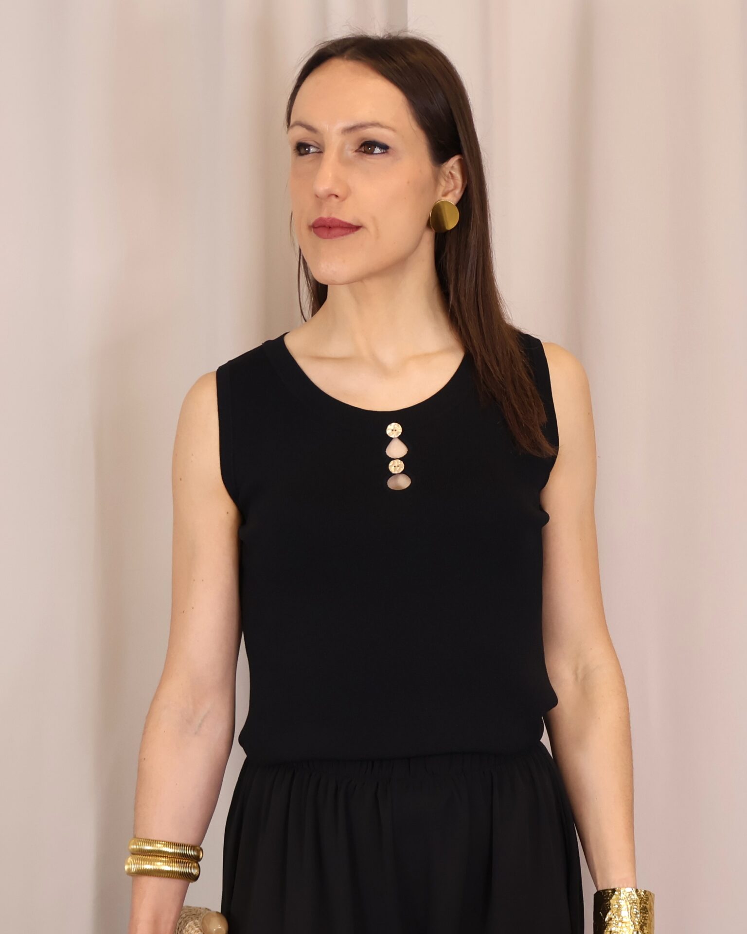 Top de punto fino en color negro, con tejido suave que se adapta a la silueta ofreciendo comodidad y una caída elegante. Su diseño sin mangas lo convierte en una prenda versátil, ideal para llevar sola o bajo una blazer. Destaca el cuello redondo con botones en disposición vertical, que aportan luz y crean sutiles aberturas tipo cut-out para un toque moderno y femenino. Con acabados limpios y estética minimalista, es un básico imprescindible para looks tanto formales como casual-chic.