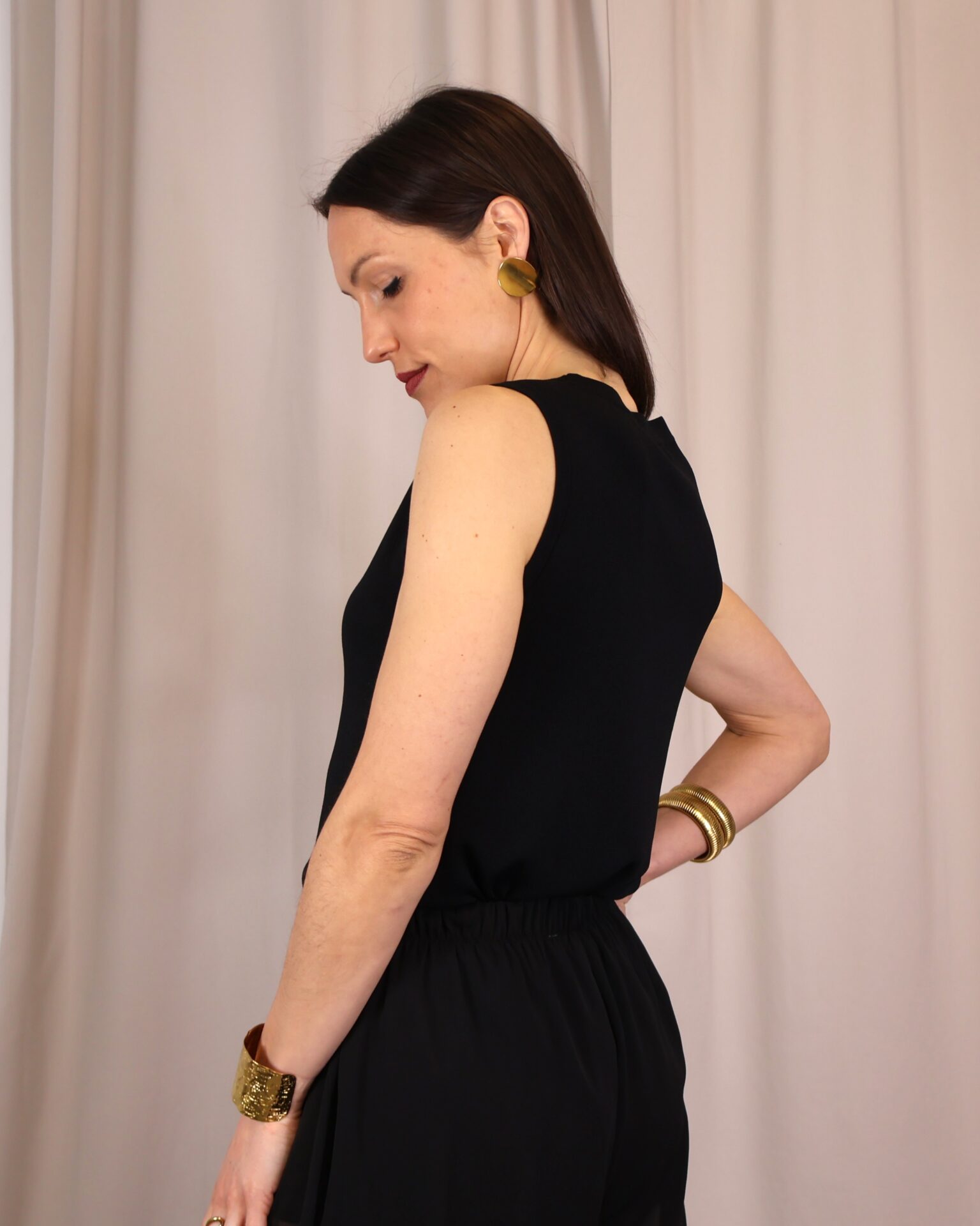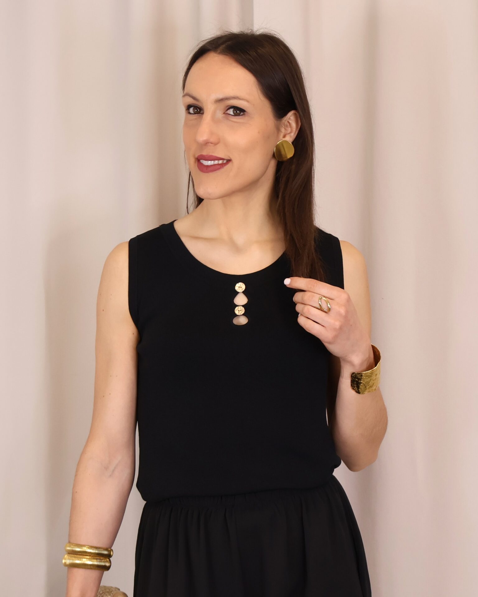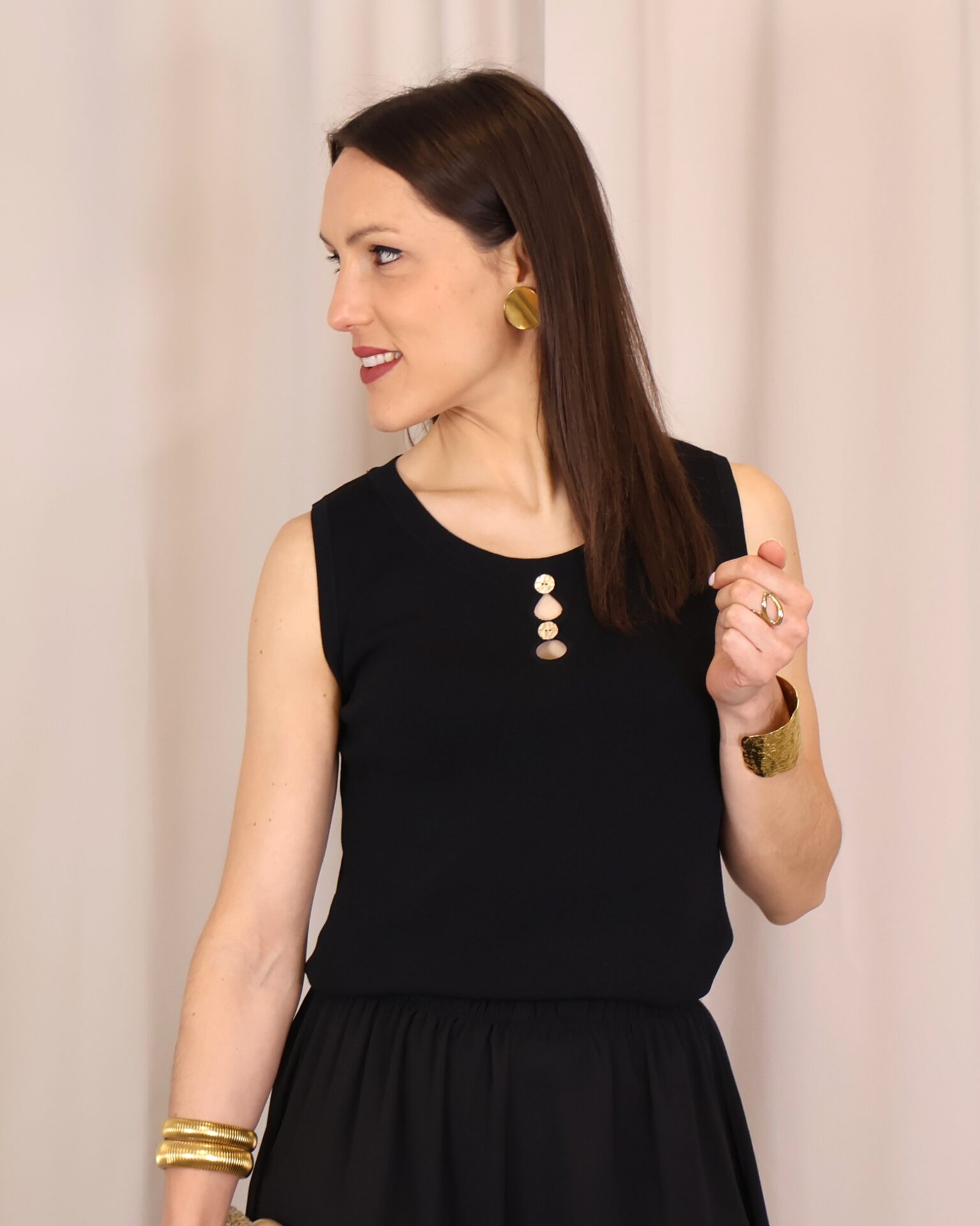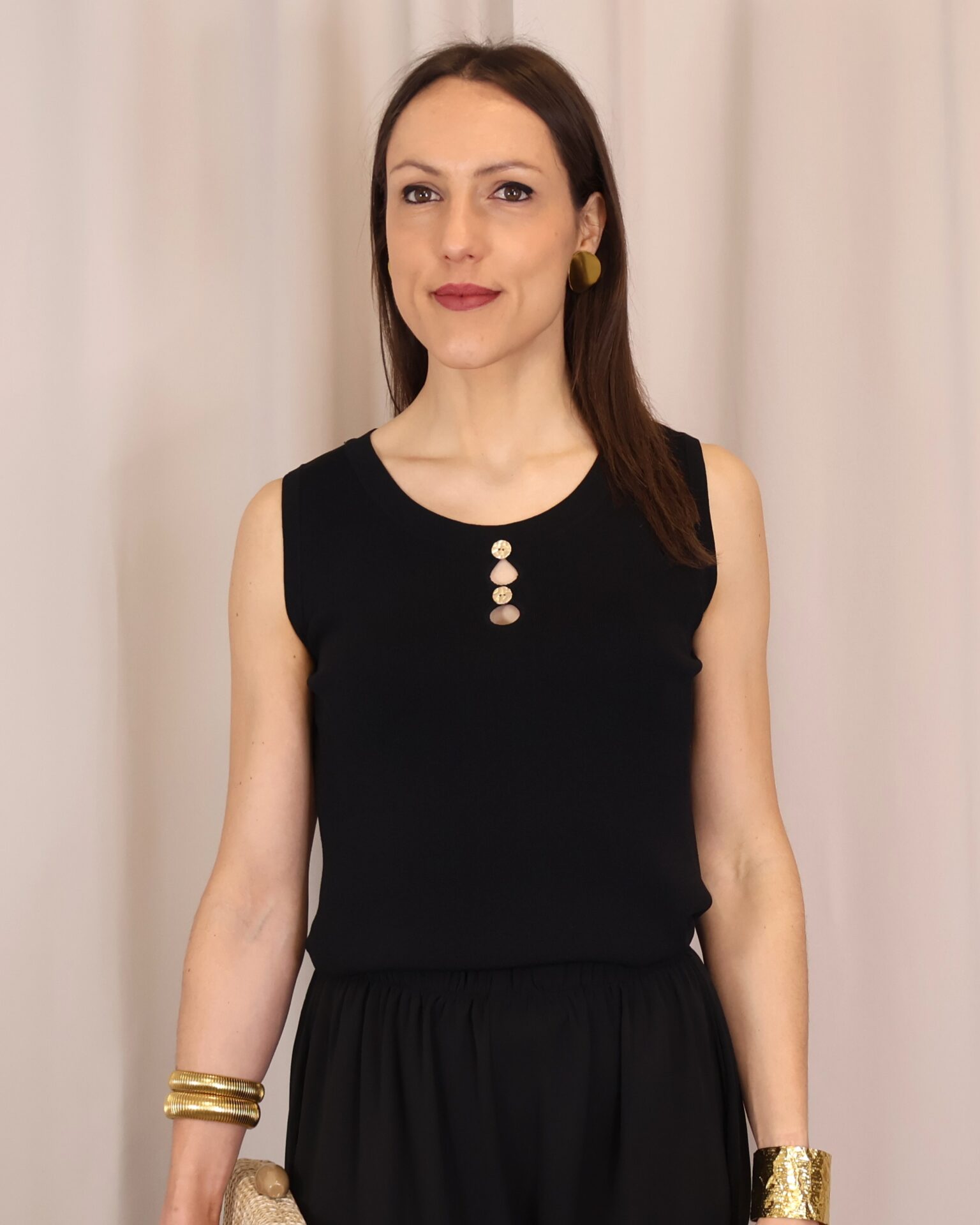 Top de punto fino en color negro, con tejido suave que se adapta a la silueta ofreciendo comodidad y una caída elegante. Su diseño sin mangas lo convierte en una prenda versátil, ideal para llevar sola o bajo una blazer. Destaca el cuello redondo con botones en disposición vertical, que aportan luz y crean sutiles aberturas tipo cut-out para un toque moderno y femenino. Con acabados limpios y estética minimalista, es un básico imprescindible para looks tanto formales como casual-chic.