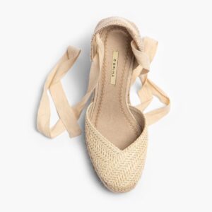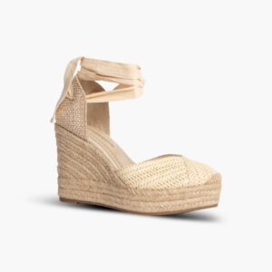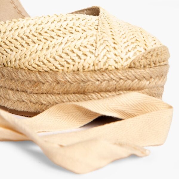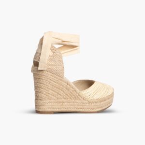 Plataforma tipo valenciana, con cuña de yute. Corte trenzado. Cierre mediante lazo atado al tobillo.