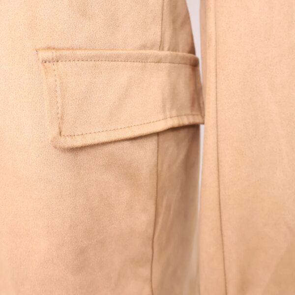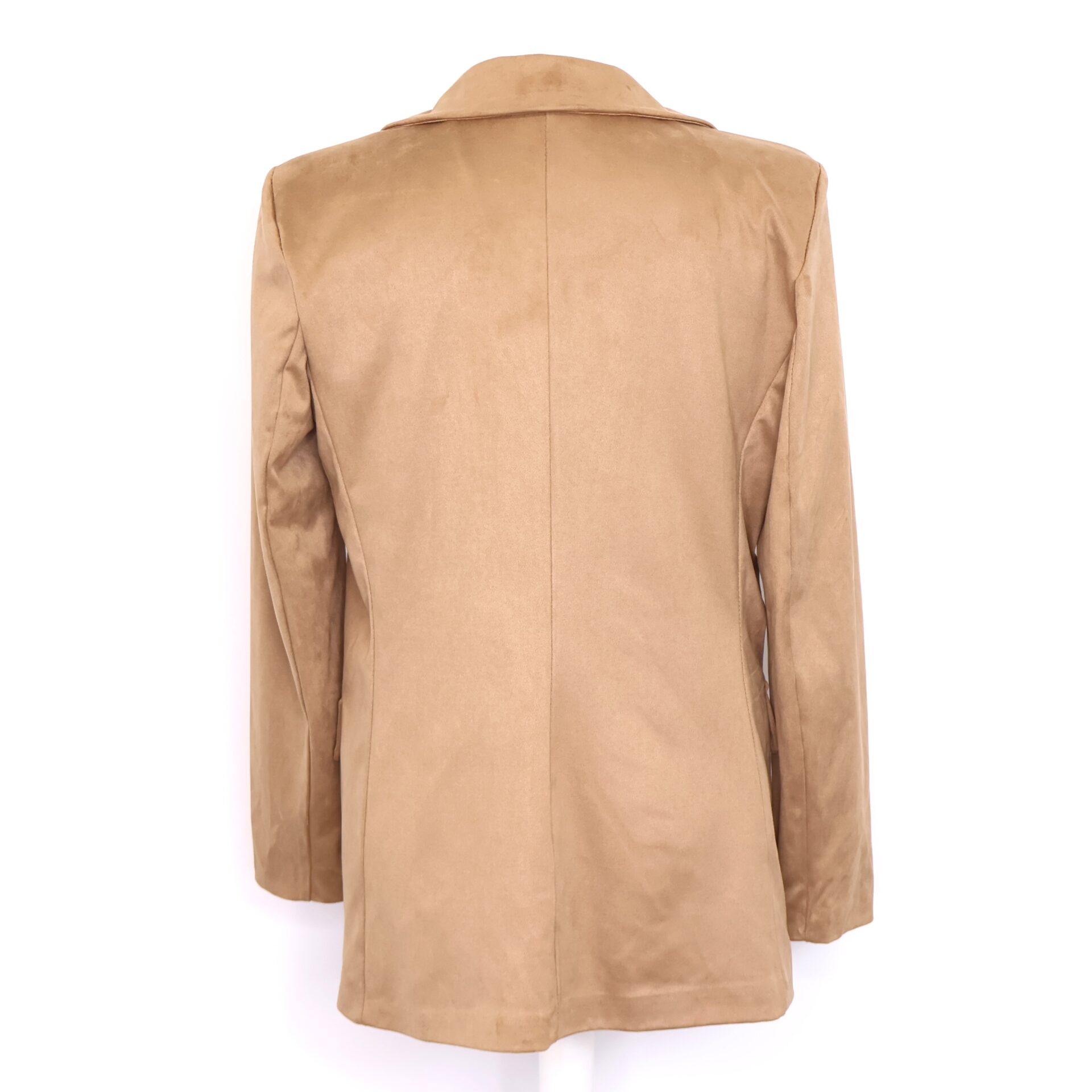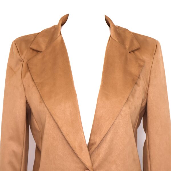 Blazer en color camel de corte recto con cuello solapa. Con hombreras y bolsillos delanteros decorativos. Cierre con un botón.