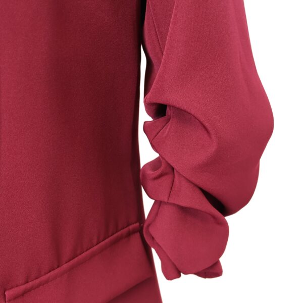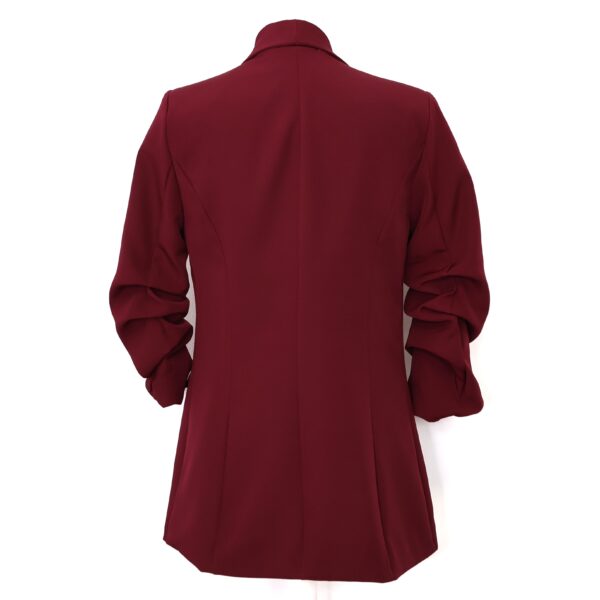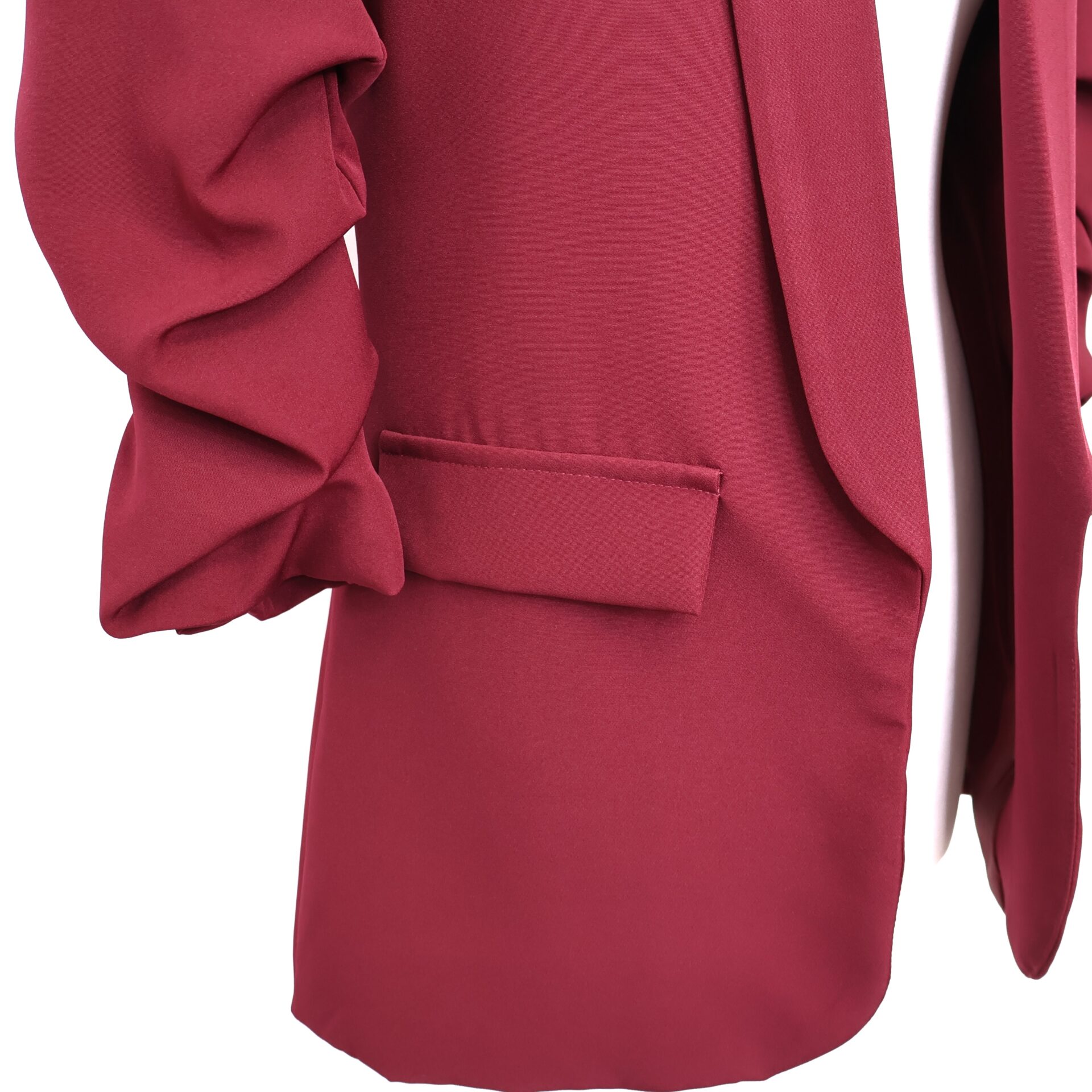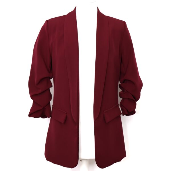 Blazer abierta de color burdeos. Cuello solapa, hombreras y forro interior. Bolsillos delanteros decorativos. Corte entallado y media manga fruncida.