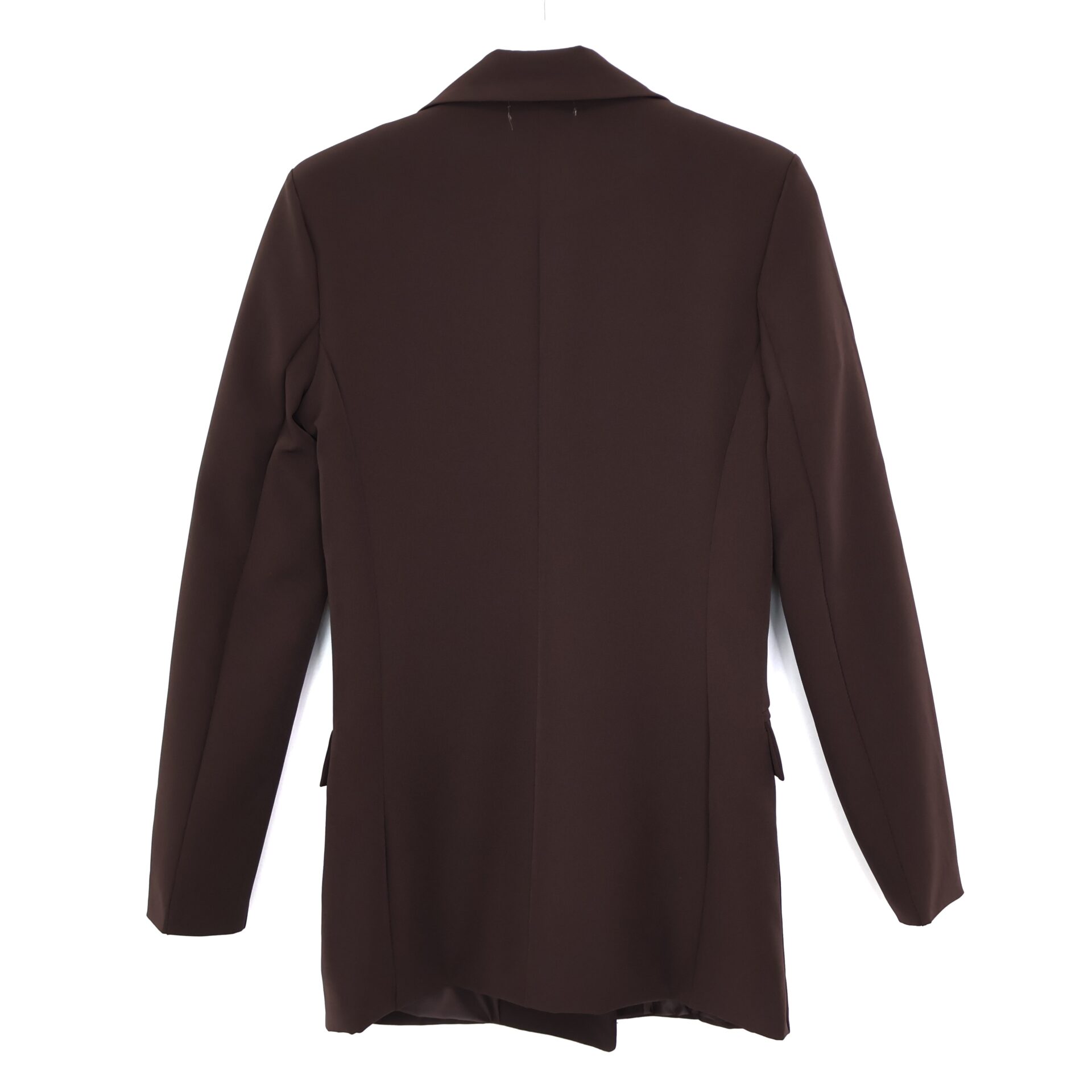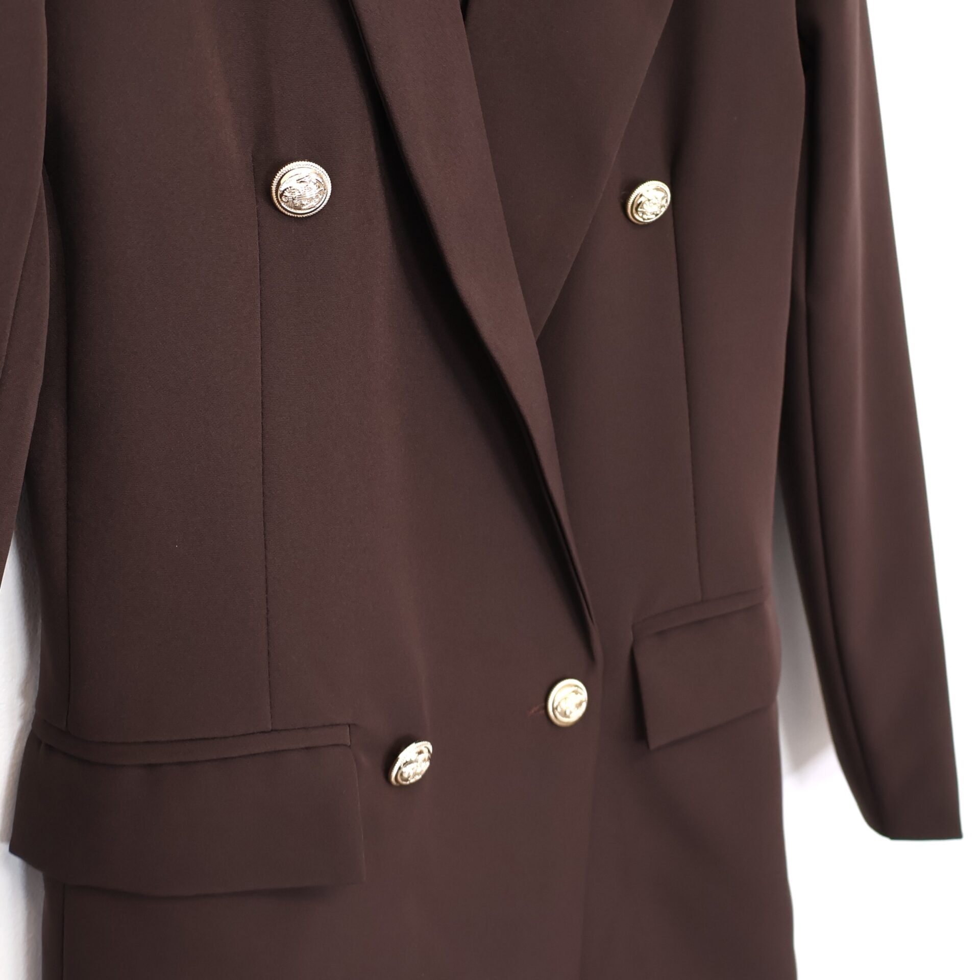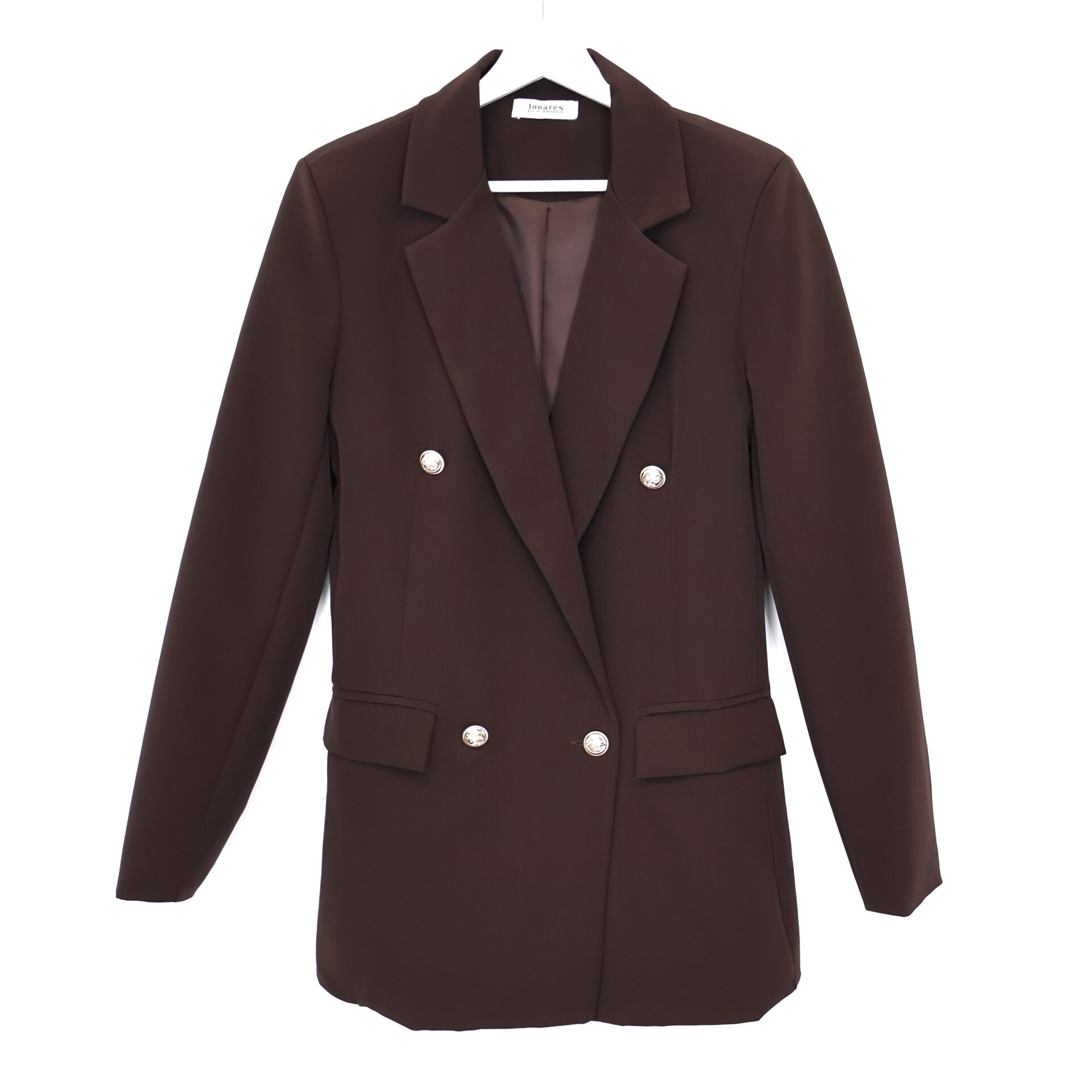 Blazer marrón chocolate con doble botonadura. Botones en dorado blanco. Con bolsillos. Forro interior.