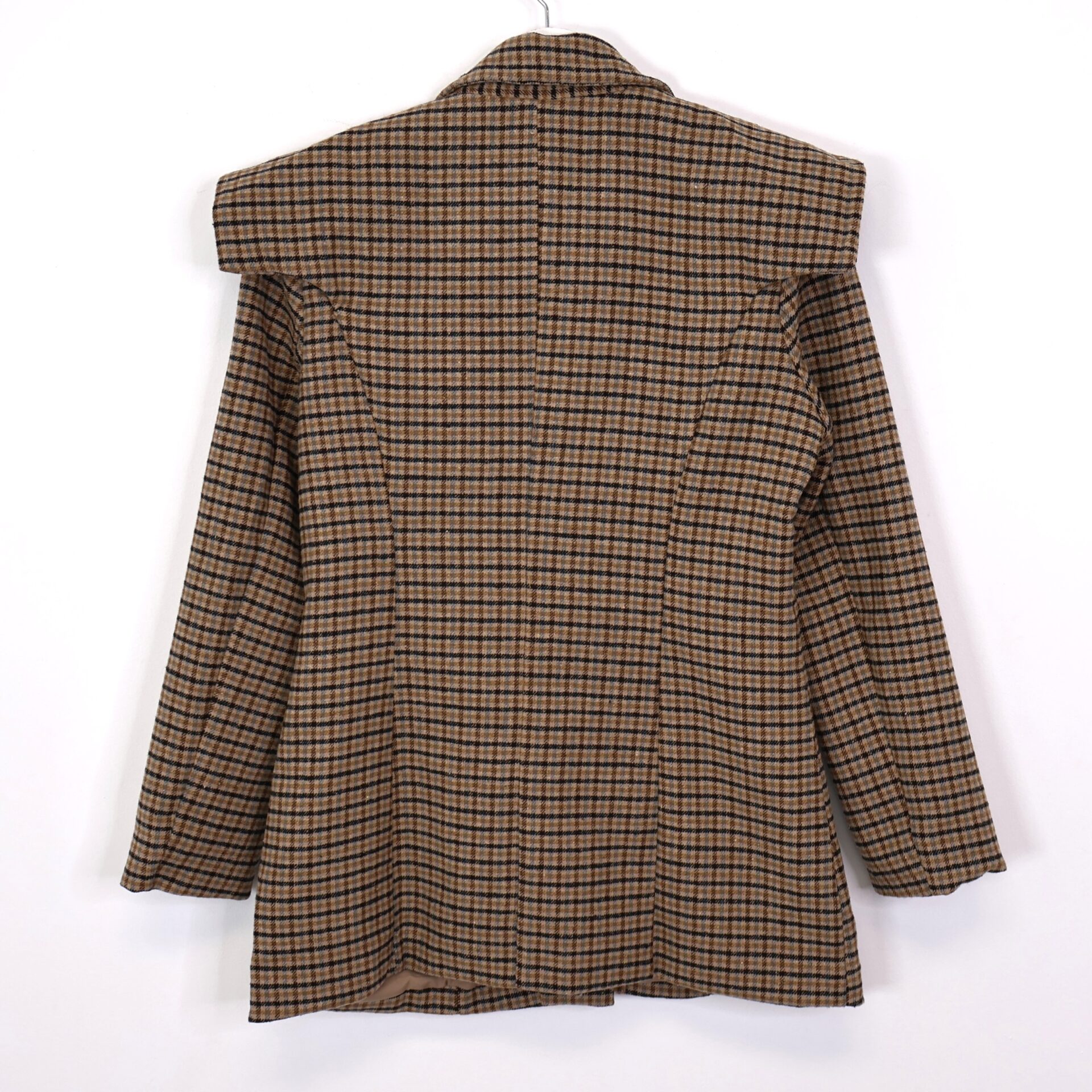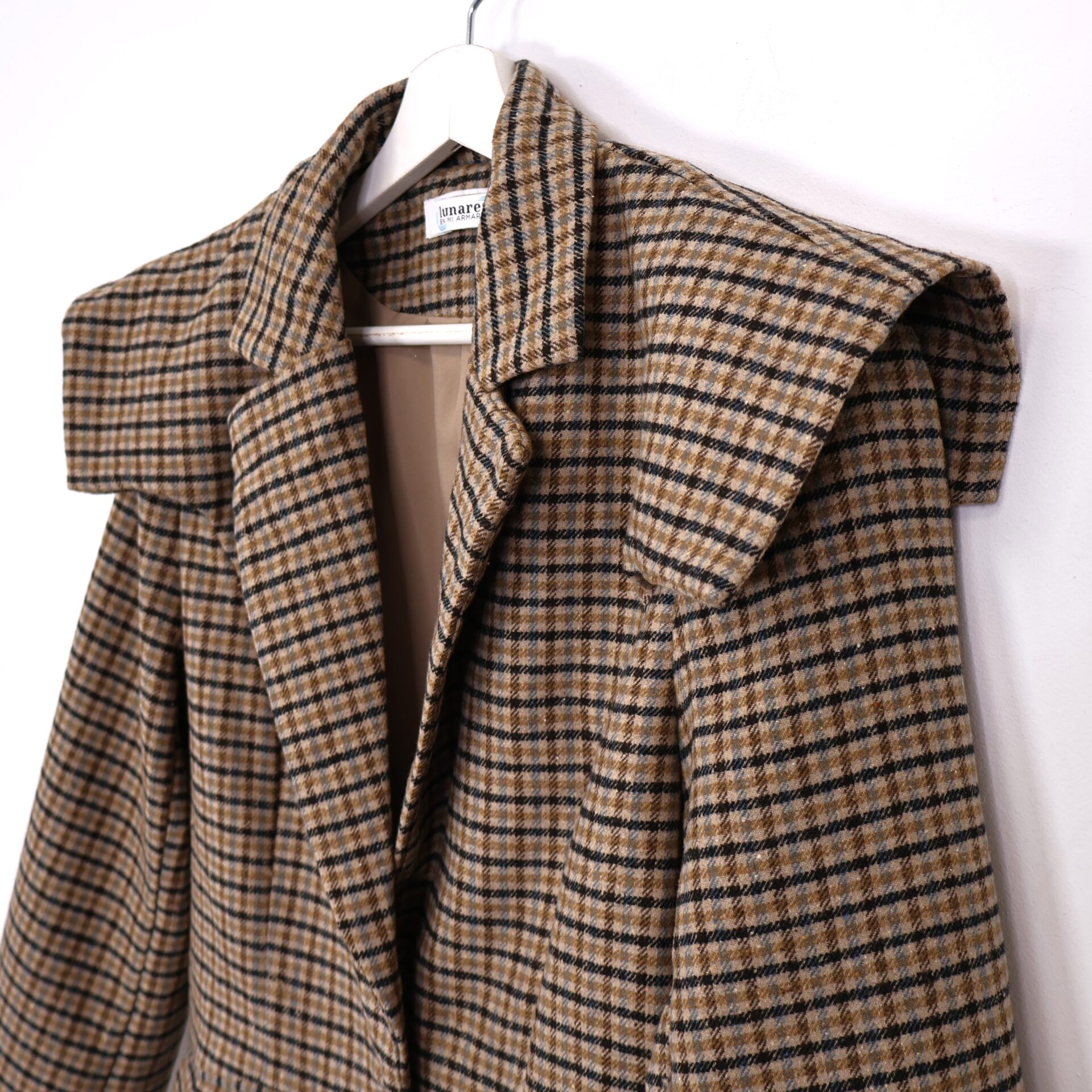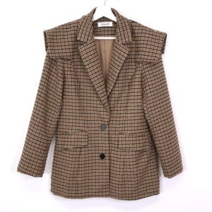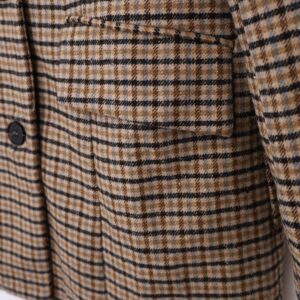 Blazer de traje con estampado en pata de gallo en tonos tierra y azules. Con cuello solapa, bolsillos laterales y hombreras decorativas. Se abrocha con dos botones.