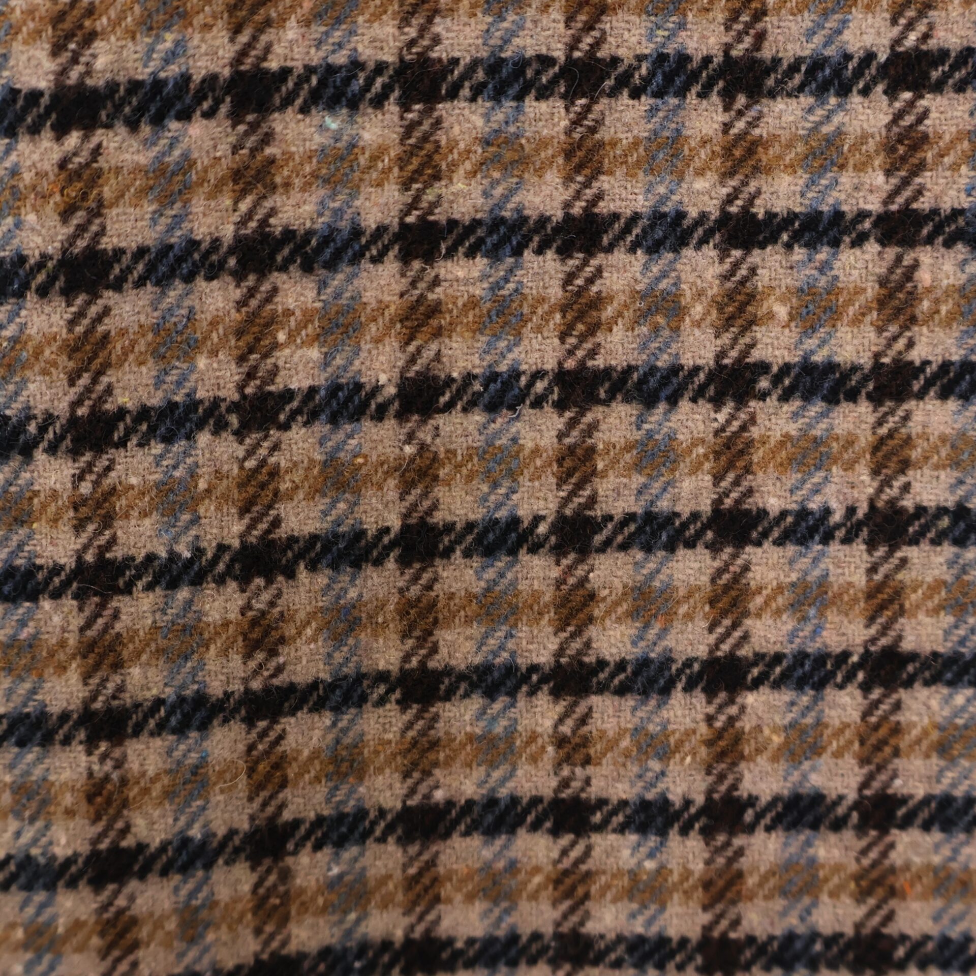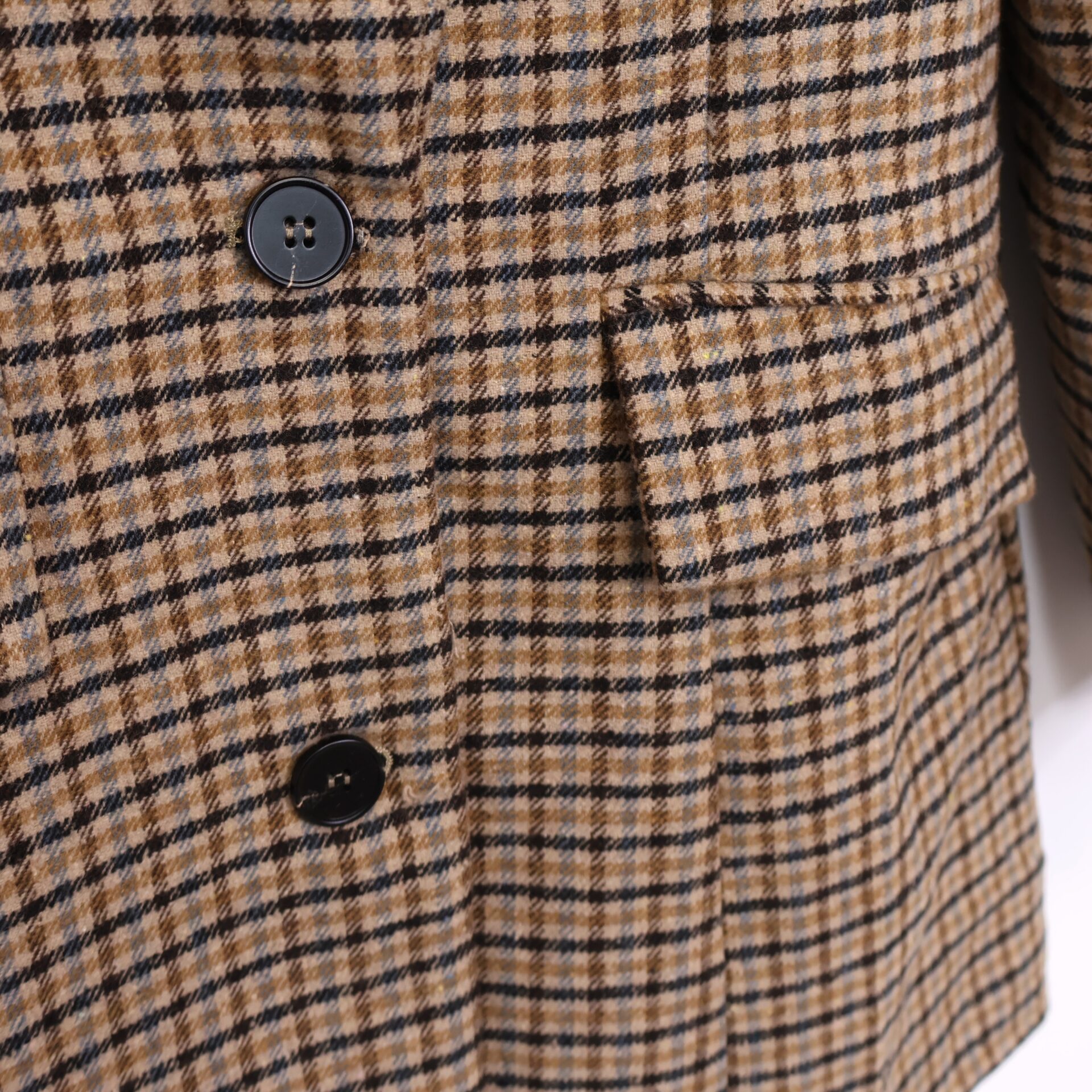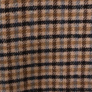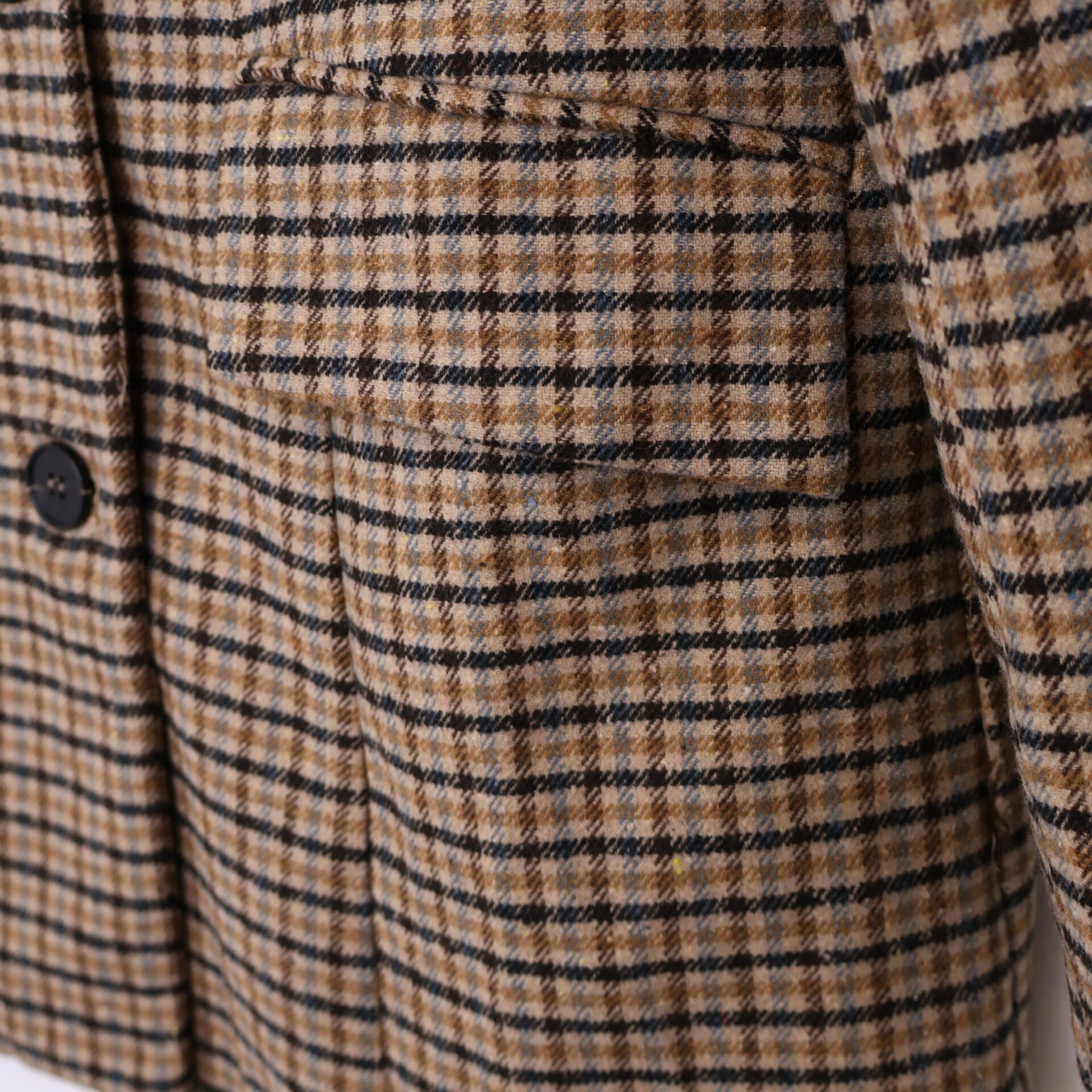 Blazer de traje con estampado en pata de gallo en tonos tierra y azules. Con cuello solapa, bolsillos laterales y hombreras decorativas. Se abrocha con dos botones.