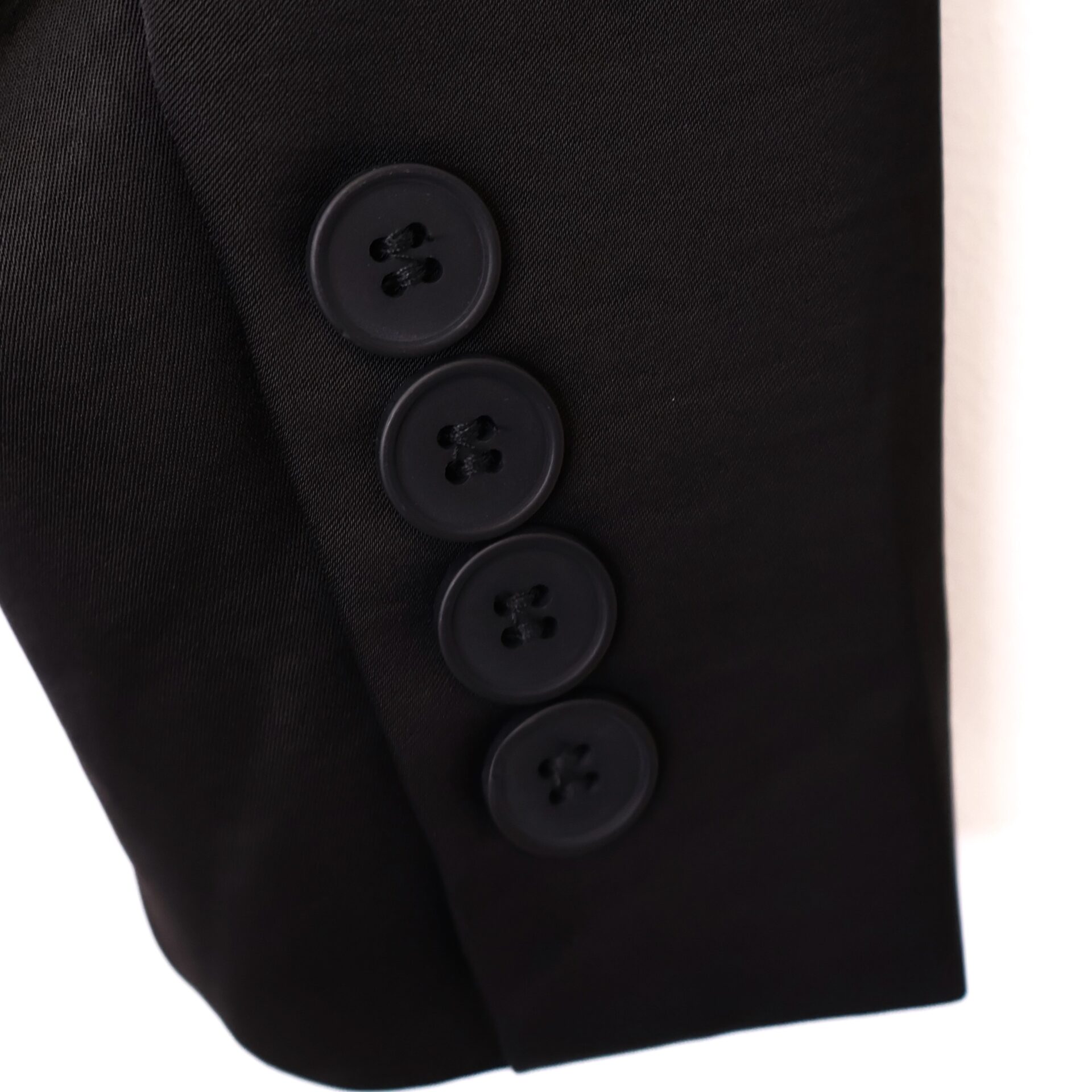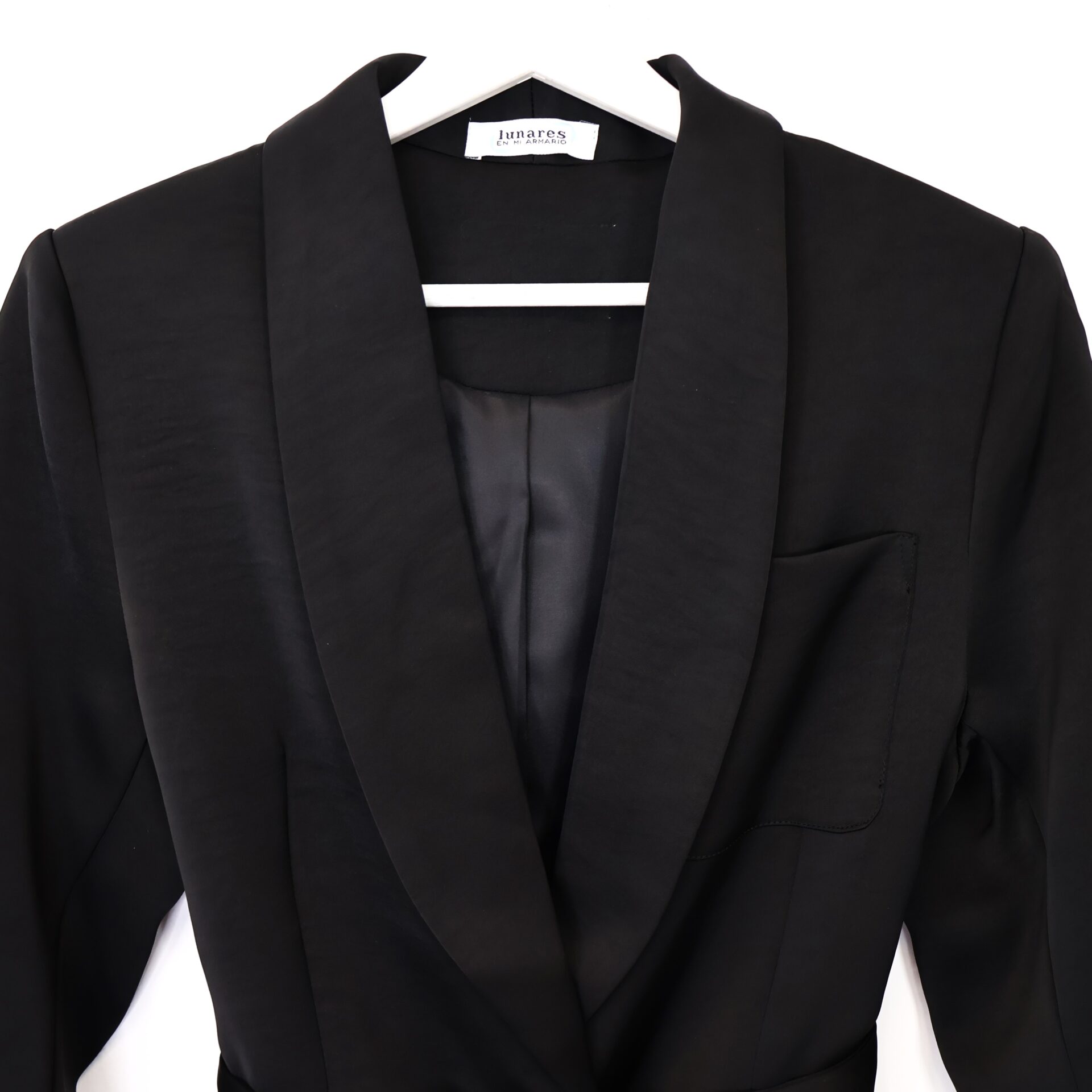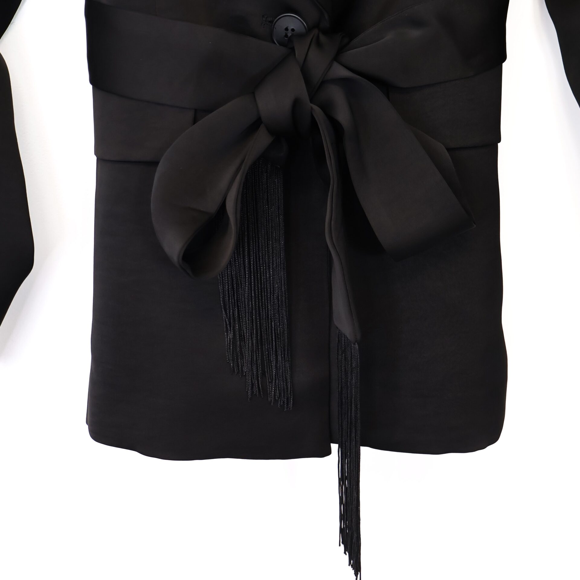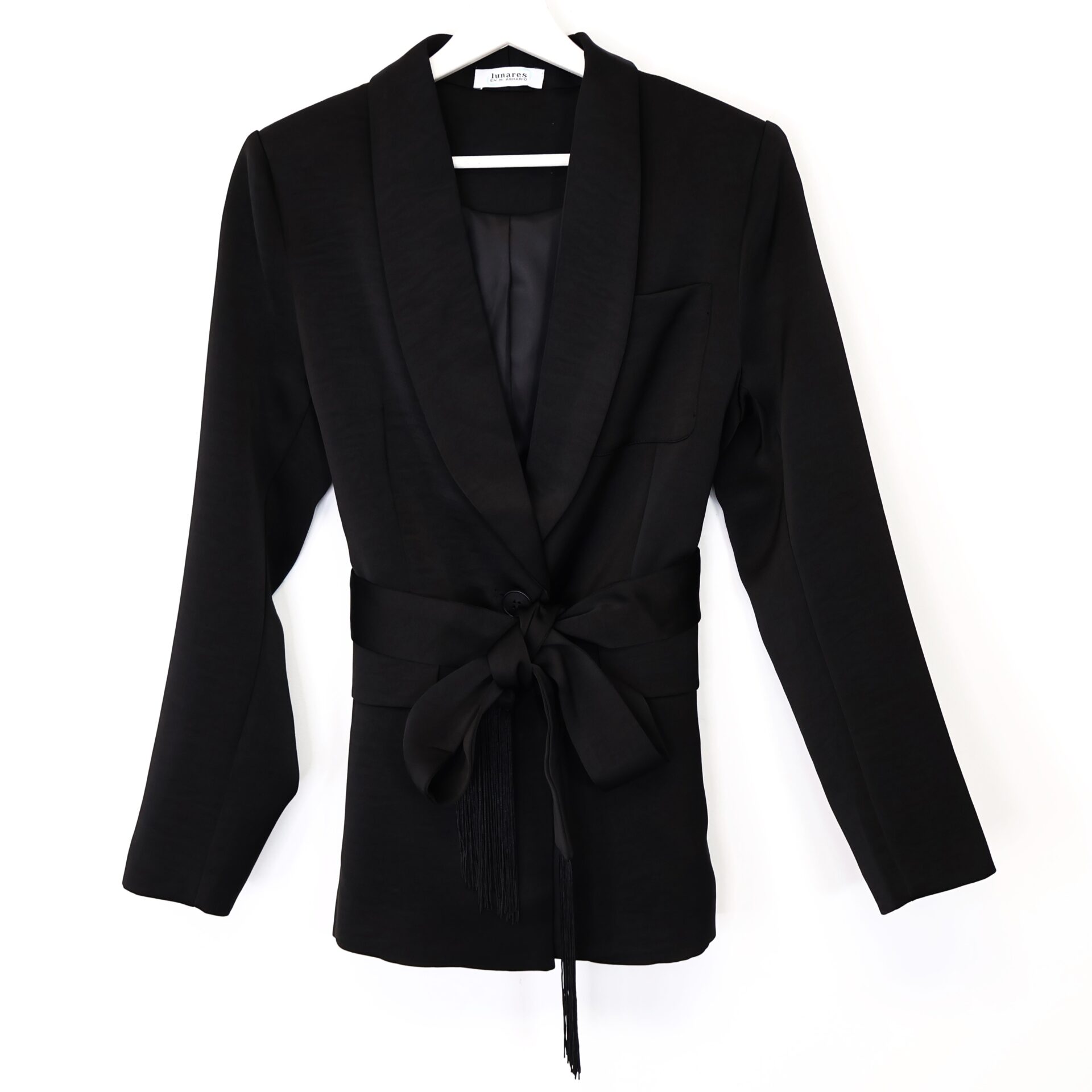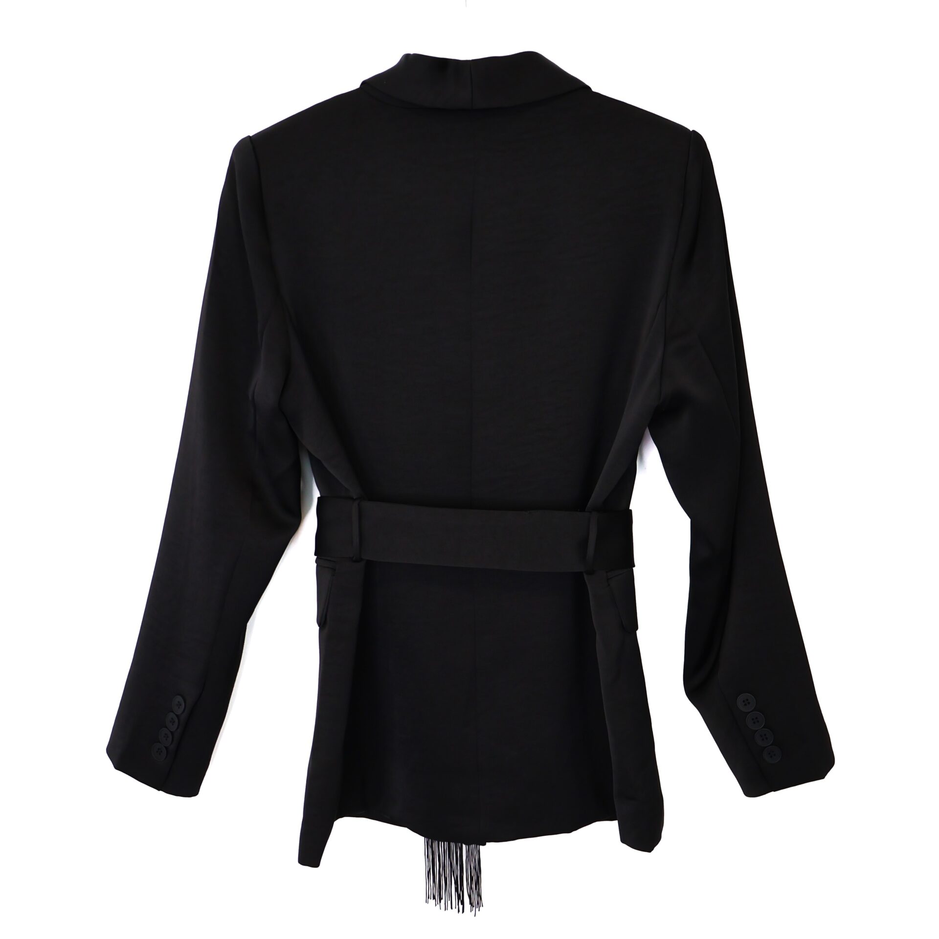 Blazer negra con cuello solapa, hombreras y forro interior. Con cierre mediante un botón frontal y bolsillos delanteros. Corte entallado con cinturón en el mismo color y tejido acabado en un delicado fleco.