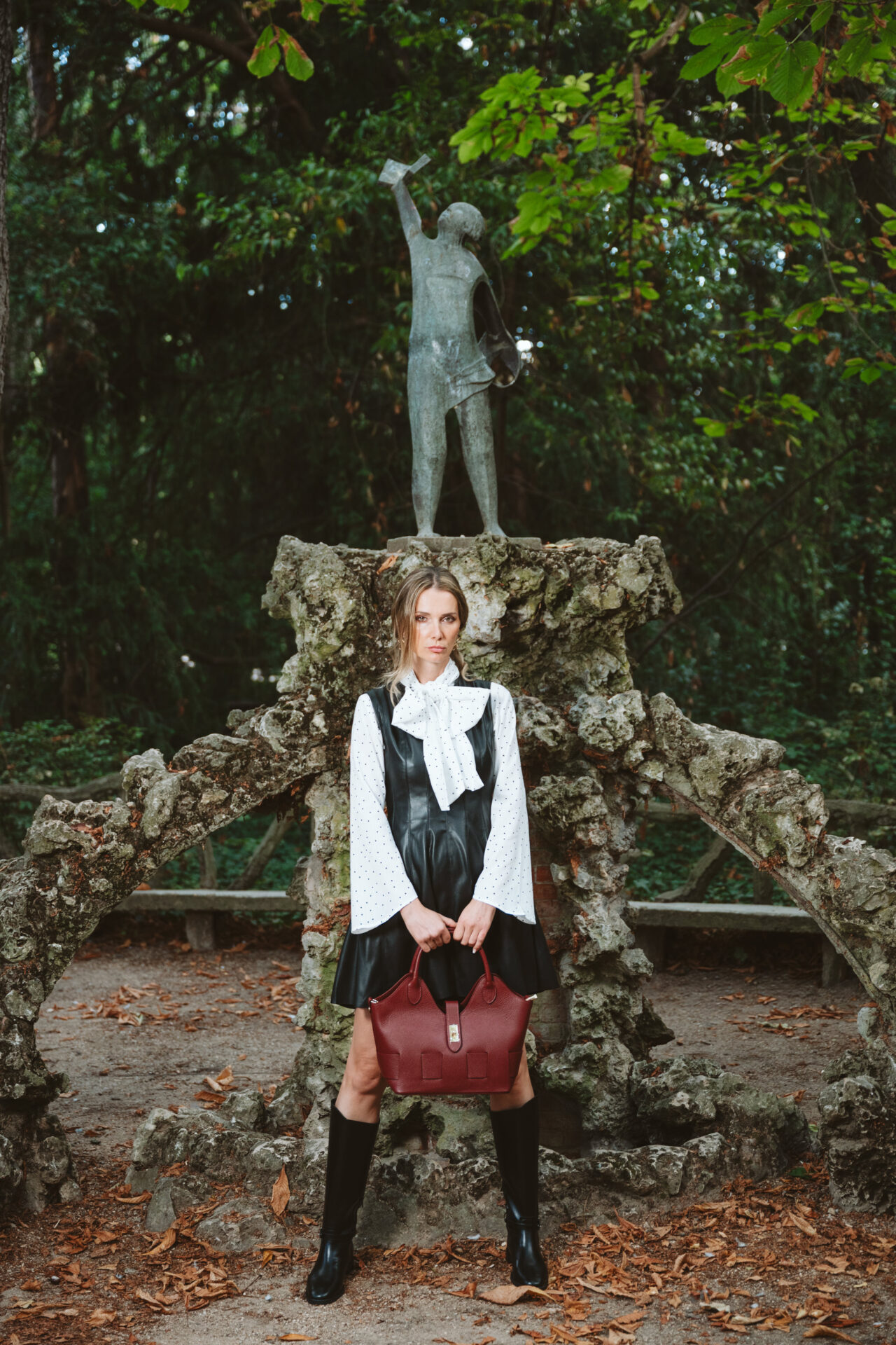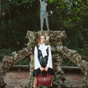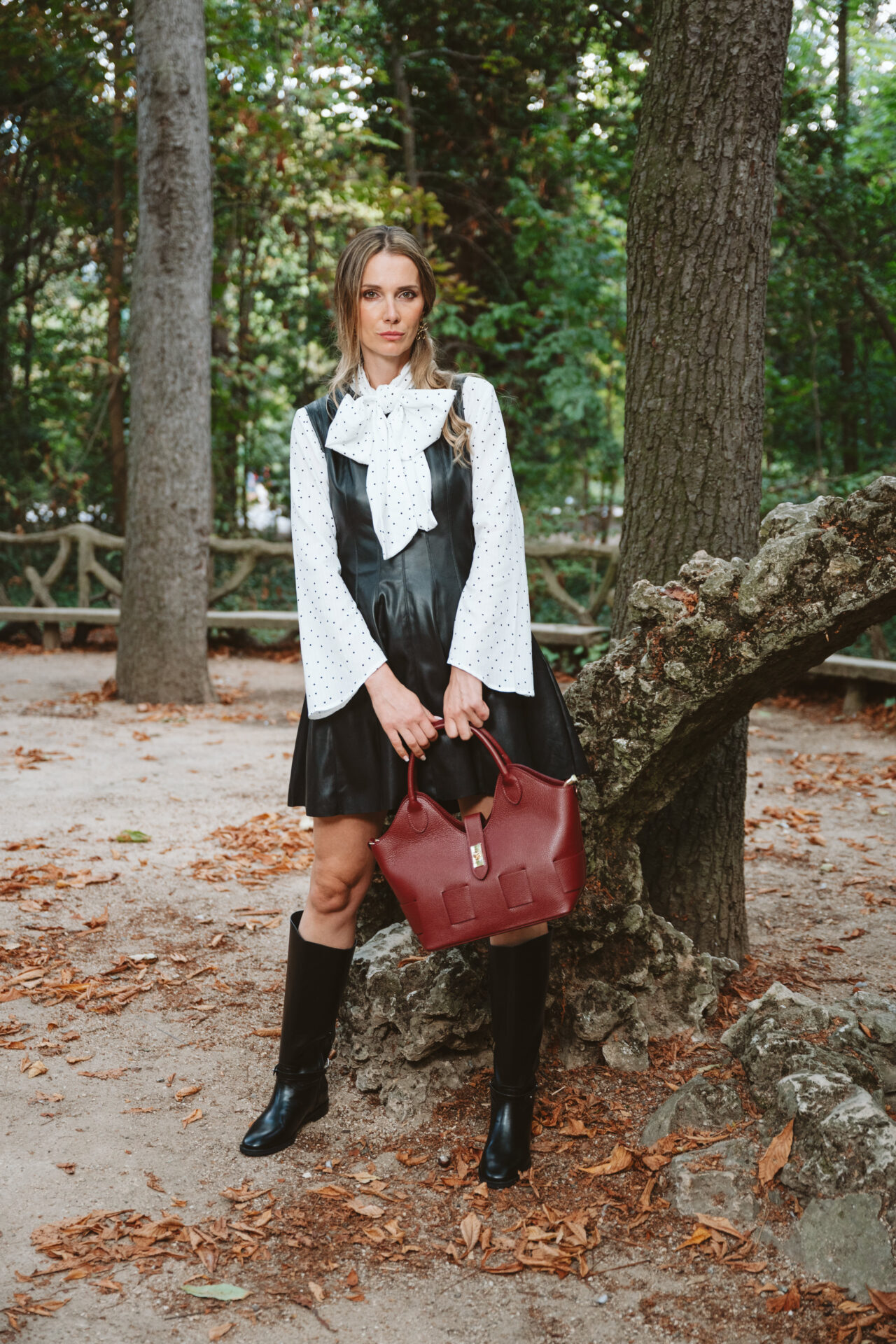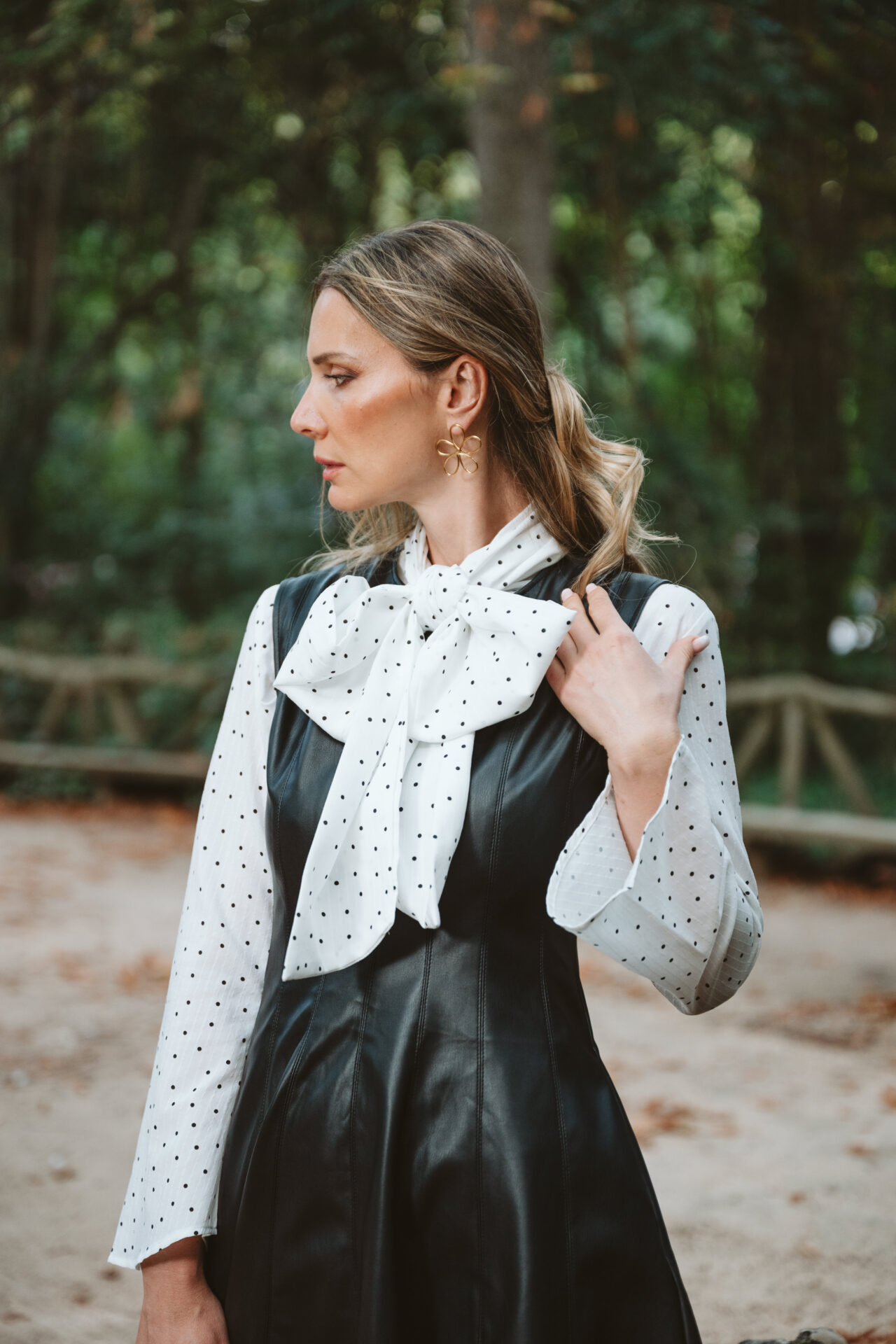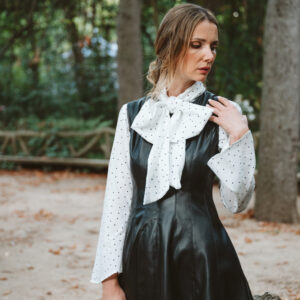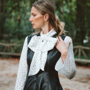 Blusa Blanca de manga larga y acampanada con estampado de lunares a contraste en blanco. Escote en pico cerrado con lazada.