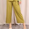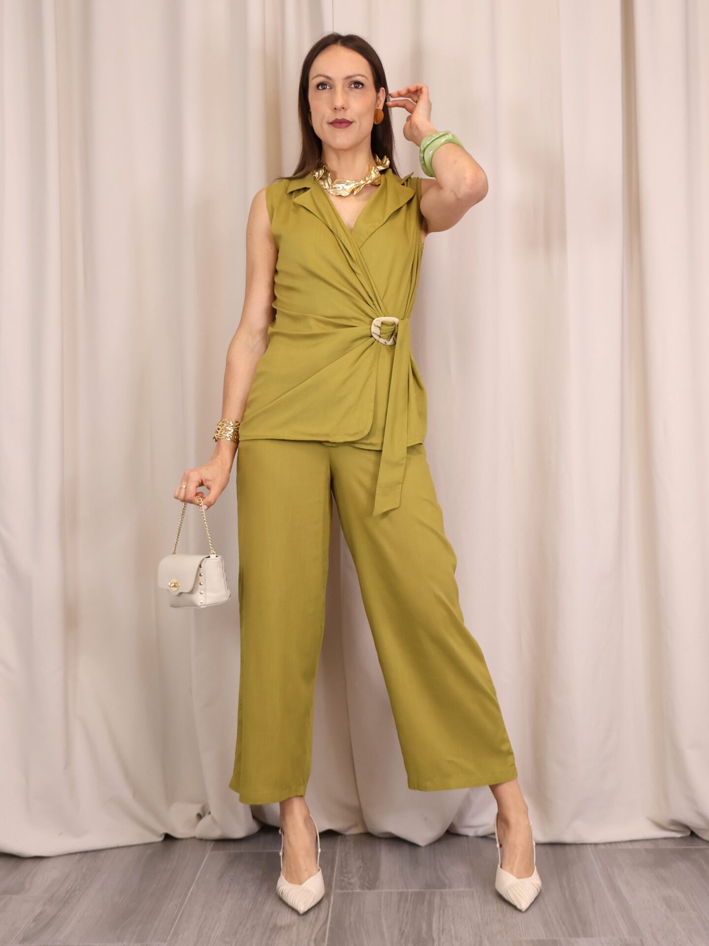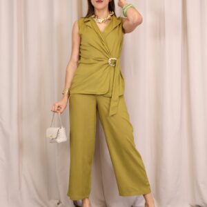 Blusa sin mangas confeccionada en tejido ligero y fluido en tono verde lima. Presenta un diseño cruzado que se ajusta lateralmente mediante un aro decorativo, creando un favorecedor efecto drapeado en la cintura. Su escote en pico estiliza la silueta y la hace ideal tanto para looks formales como casual.