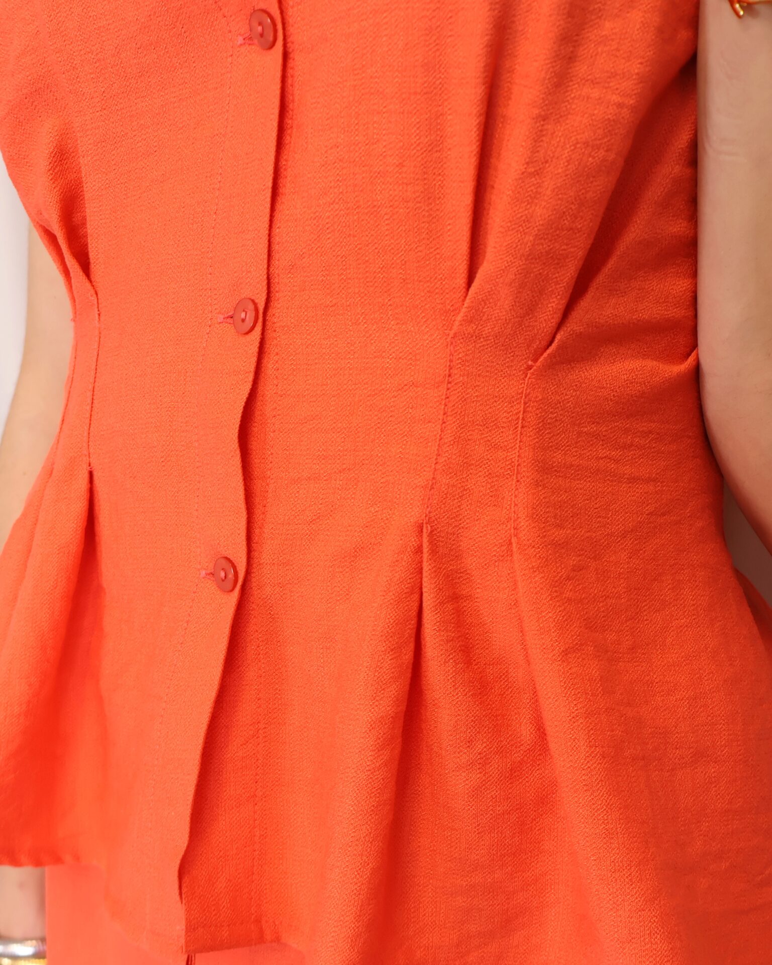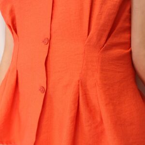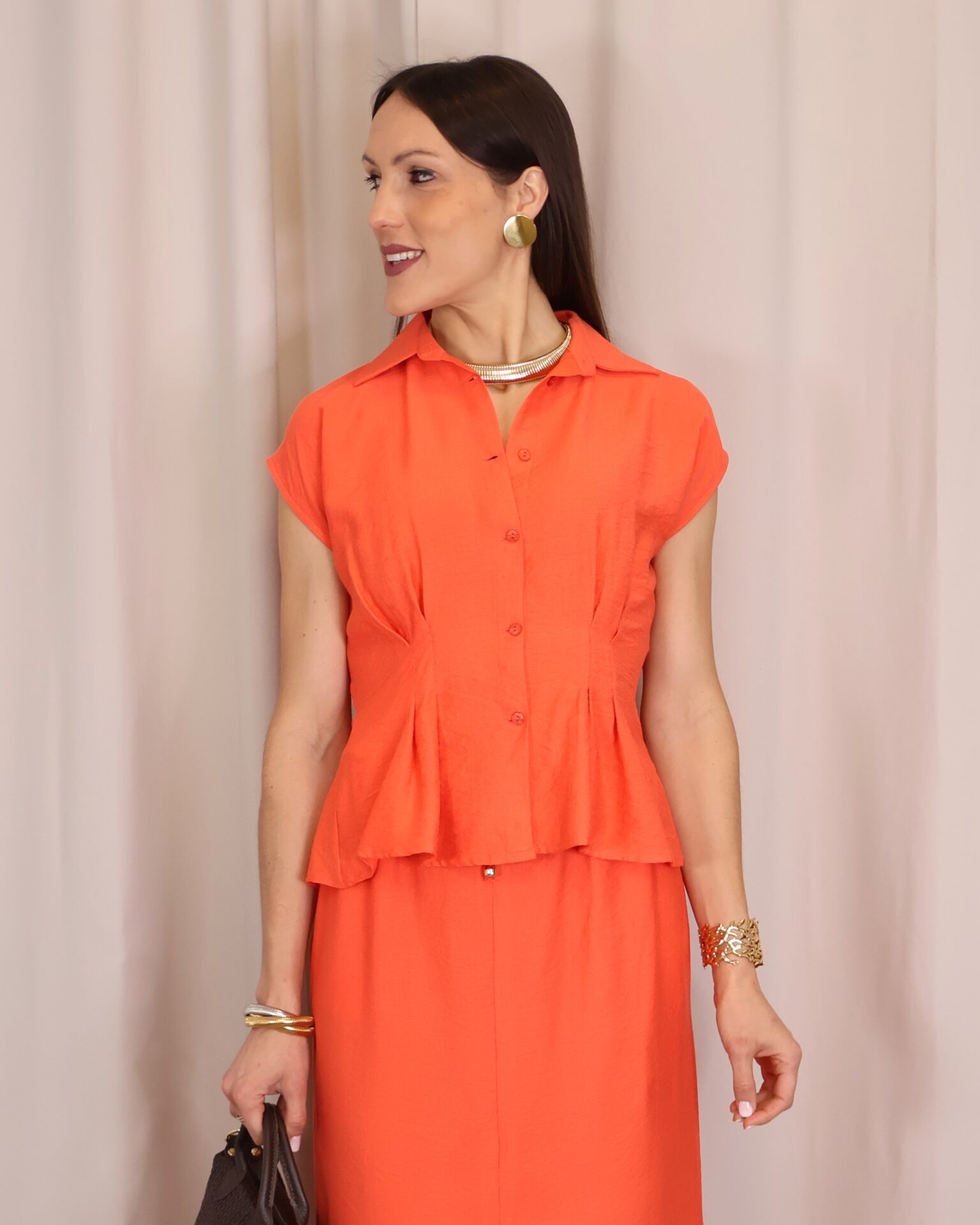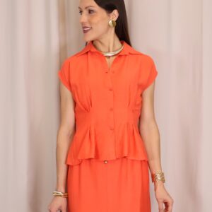 Blusa en color coral confeccionada en tejido fluido y ligero, con diseño entallado que realza la silueta gracias a sus pinzas delanteras y traseras. Presenta cuello camisero, cierre frontal con botones y manga corta, ideal para looks frescos y elegantes. Una prenda versátil que aporta color y estilo a cualquier outfit.