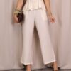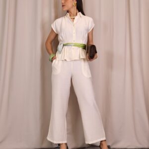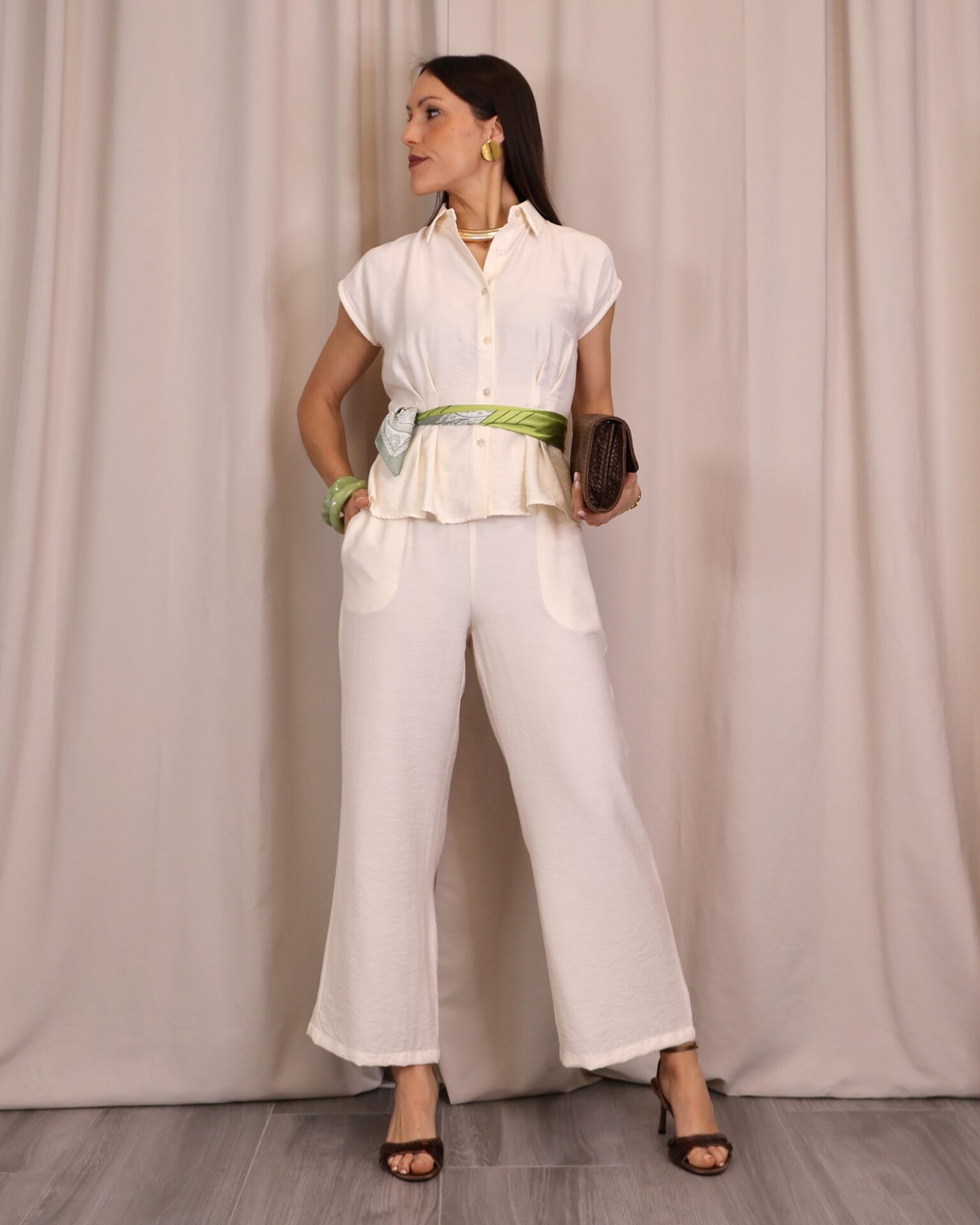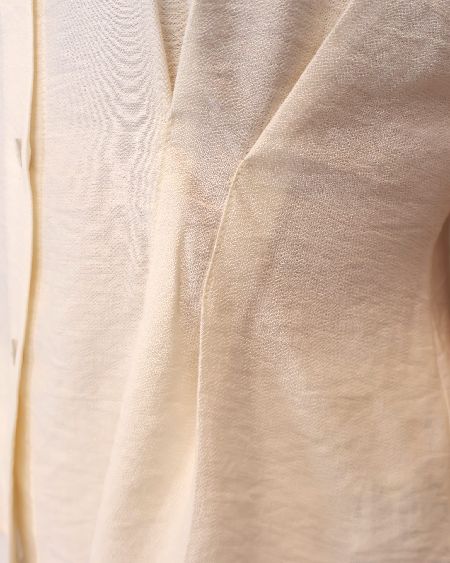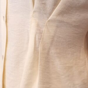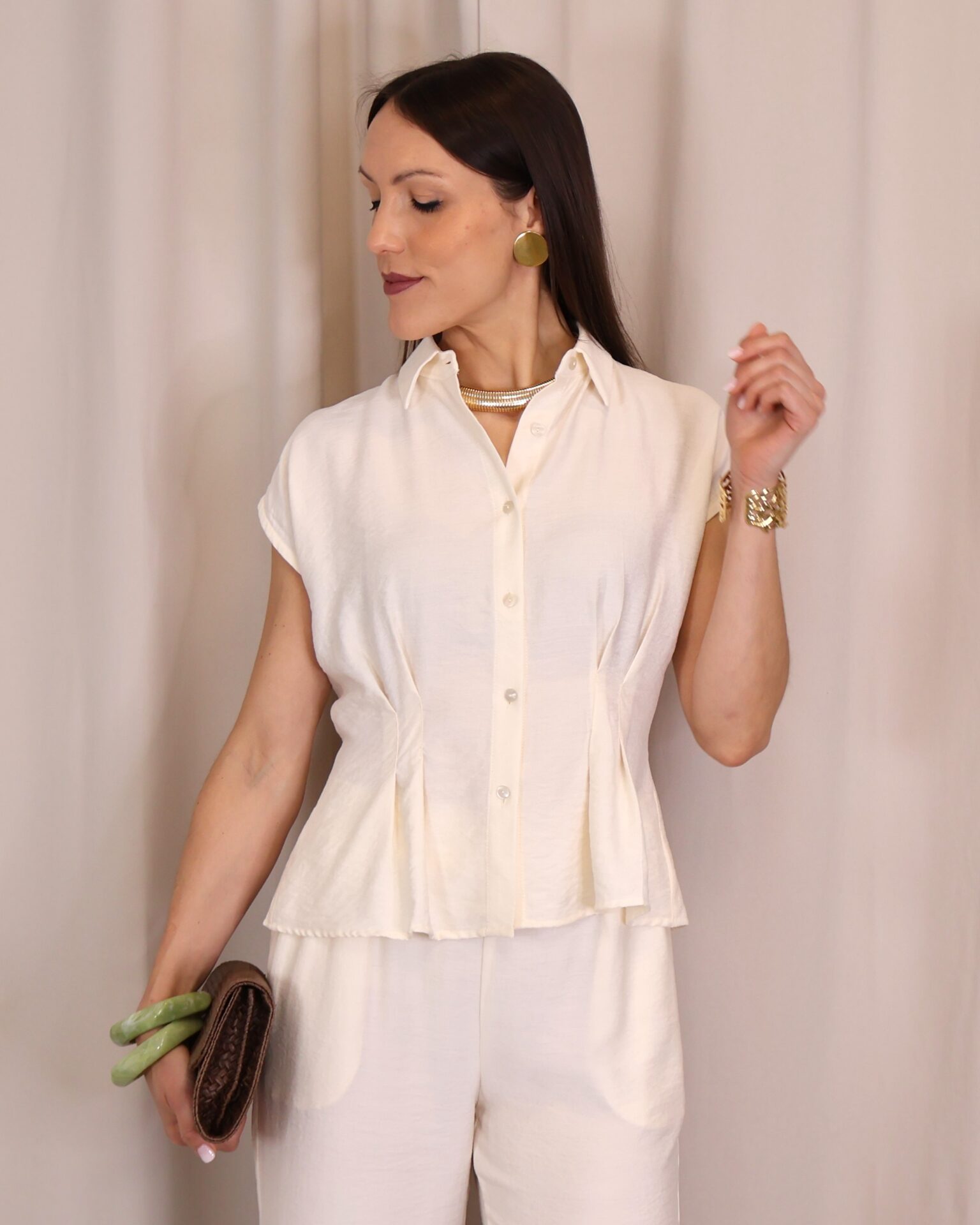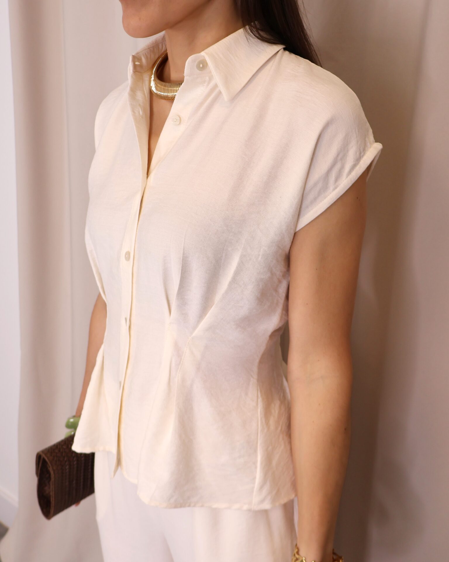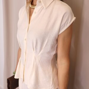 Blusa en color crema confeccionada en tejido ligero, con diseño entallado que realza la silueta gracias a sus pinzas delanteras y traseras. Presenta cuello camisero, cierre frontal con botones y manga corta, ideal para looks frescos y elegantes. Una prenda versátil y atemporal para cualquier ocasión.