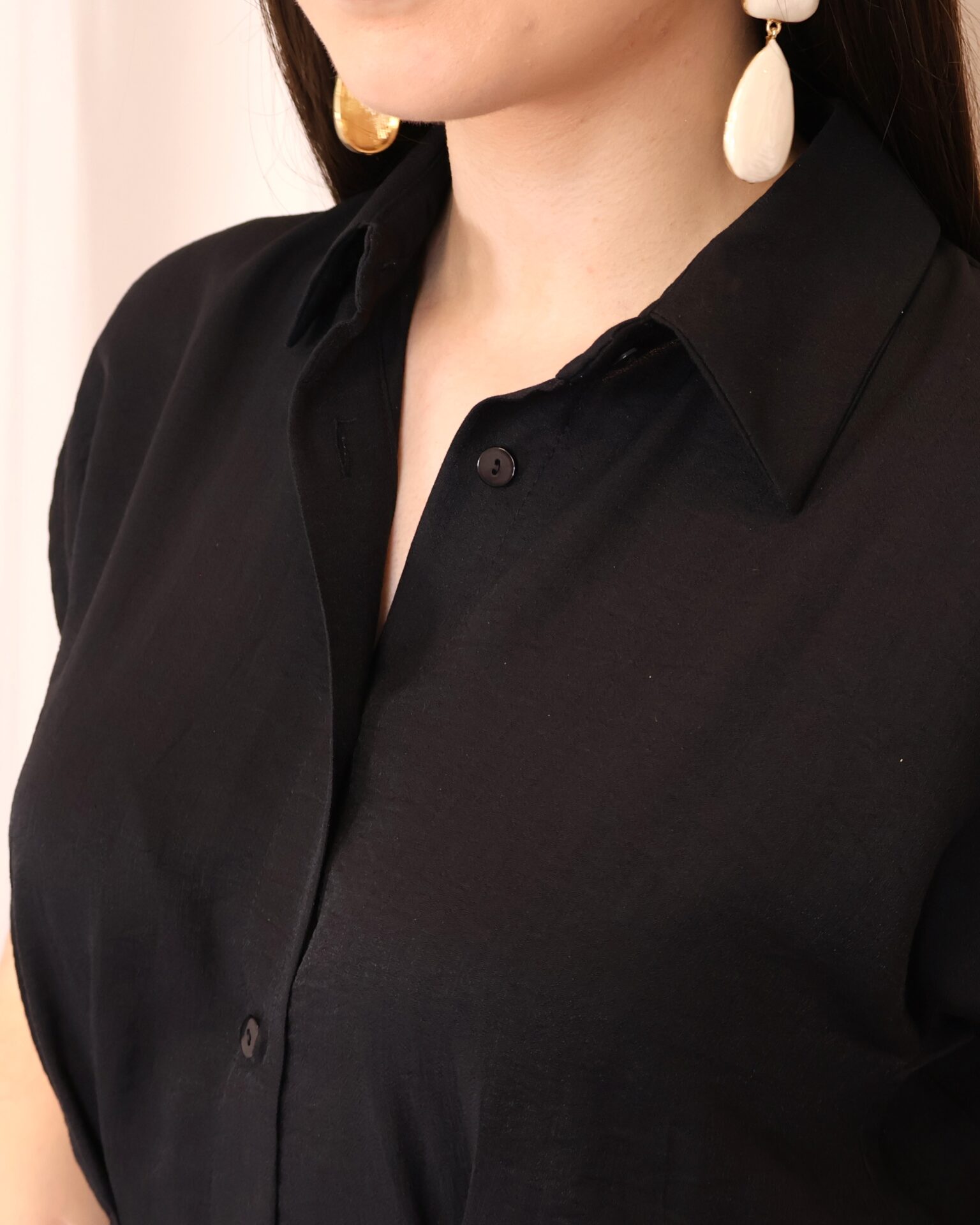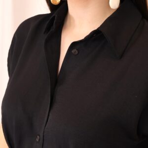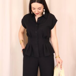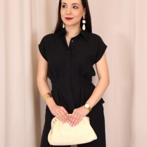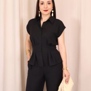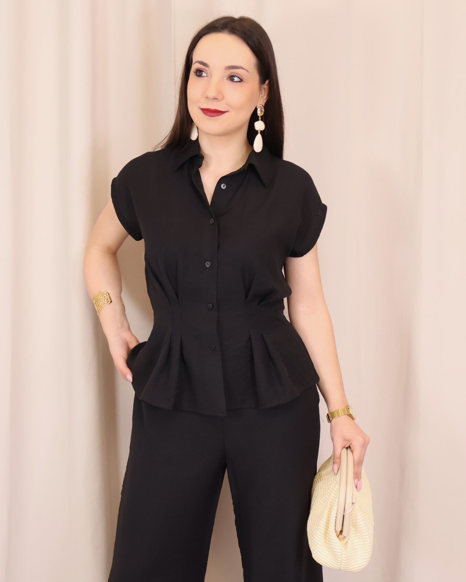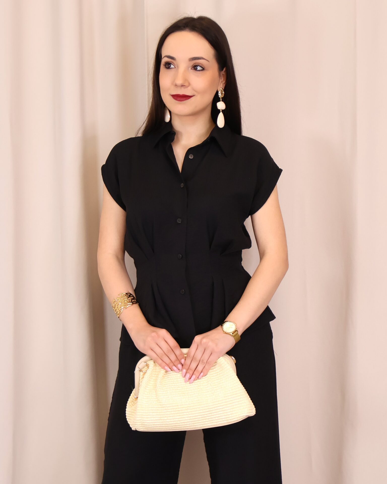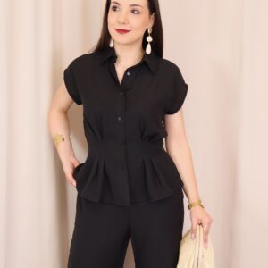 Blusa en color negro confeccionada en tejido fluido y ligero, con diseño entallado que realza la silueta gracias a sus pinzas delanteras y traseras. Presenta cuello camisero, cierre frontal con botones y manga corta, ideal para looks frescos y elegantes. Una prenda versátil que aporta color y estilo a cualquier outfit.