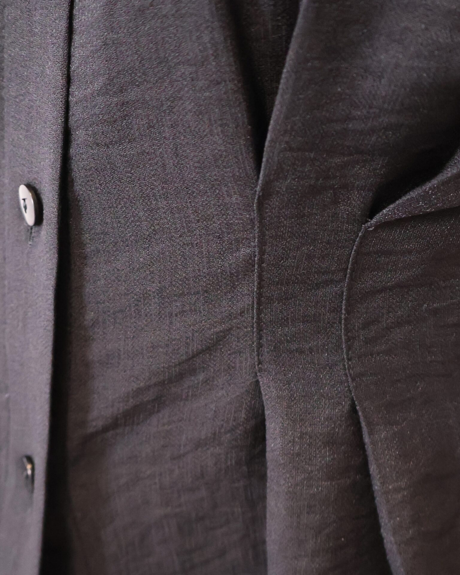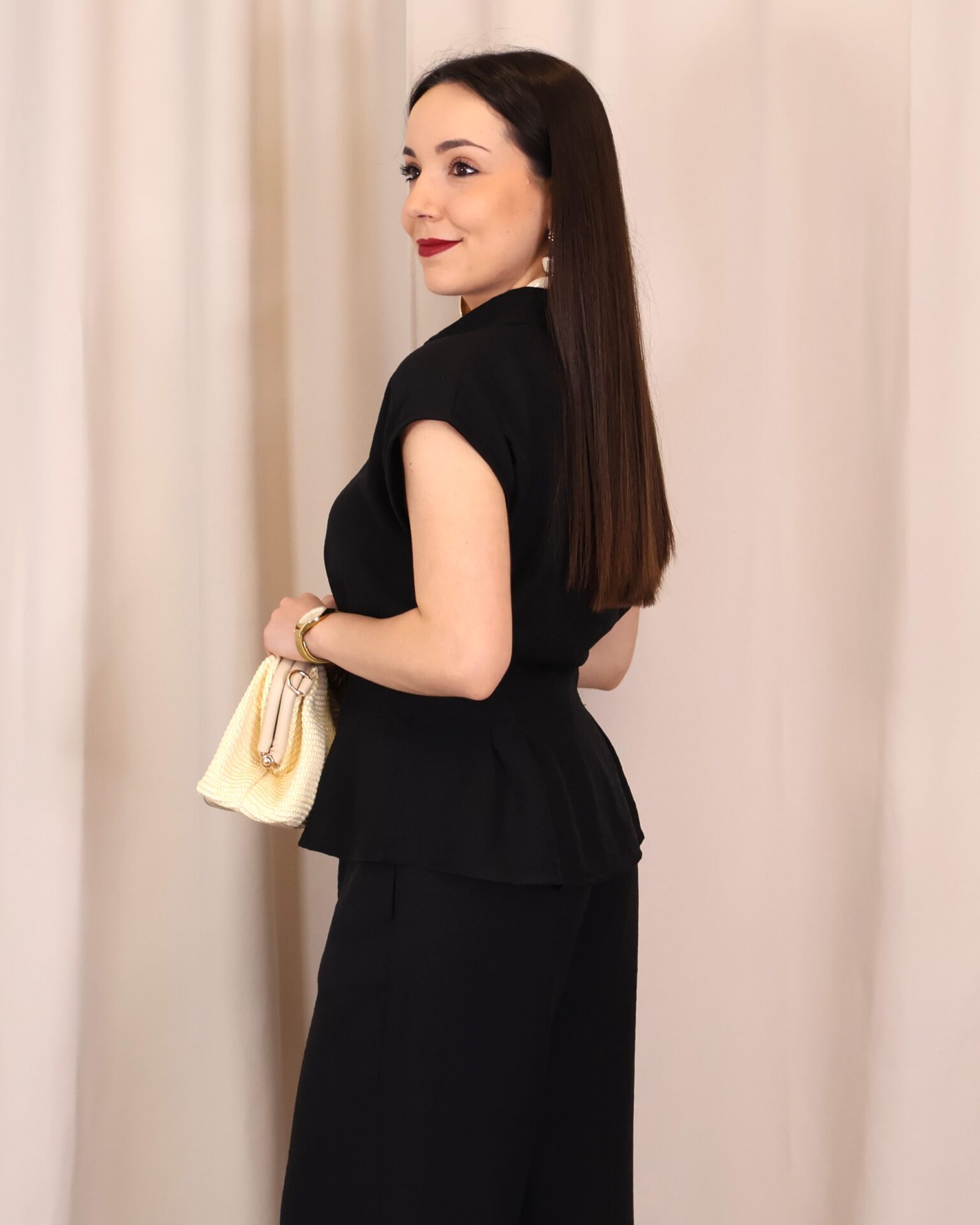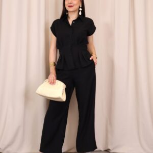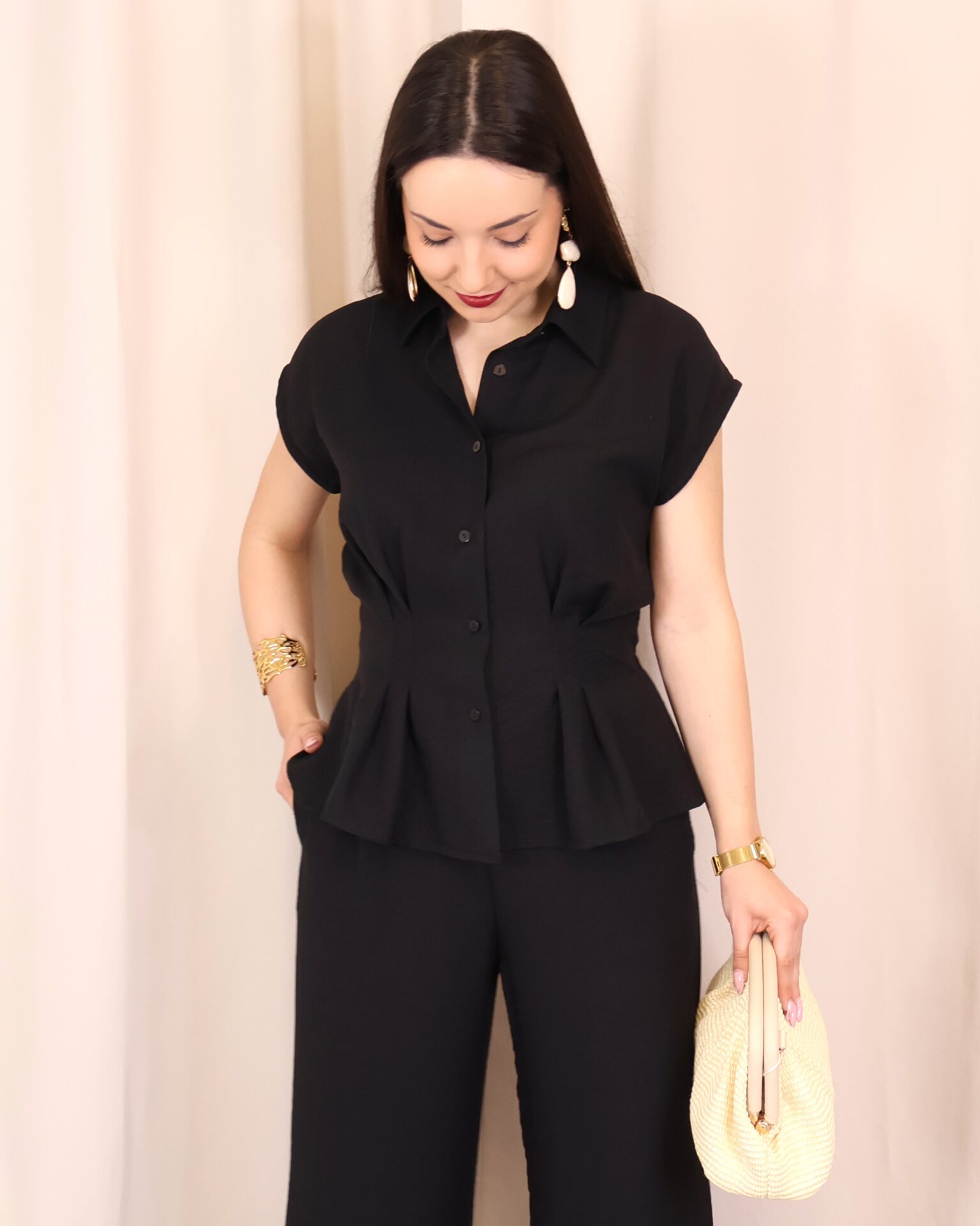Blusa en color negro confeccionada en tejido fluido y ligero, con diseño entallado que realza la silueta gracias a sus pinzas delanteras y traseras. Presenta cuello camisero, cierre frontal con botones y manga corta, ideal para looks frescos y elegantes. Una prenda versátil que aporta color y estilo a cualquier outfit.