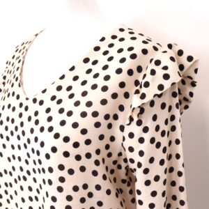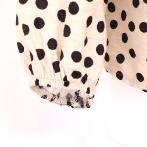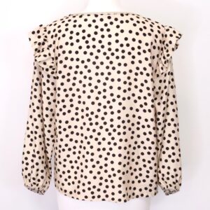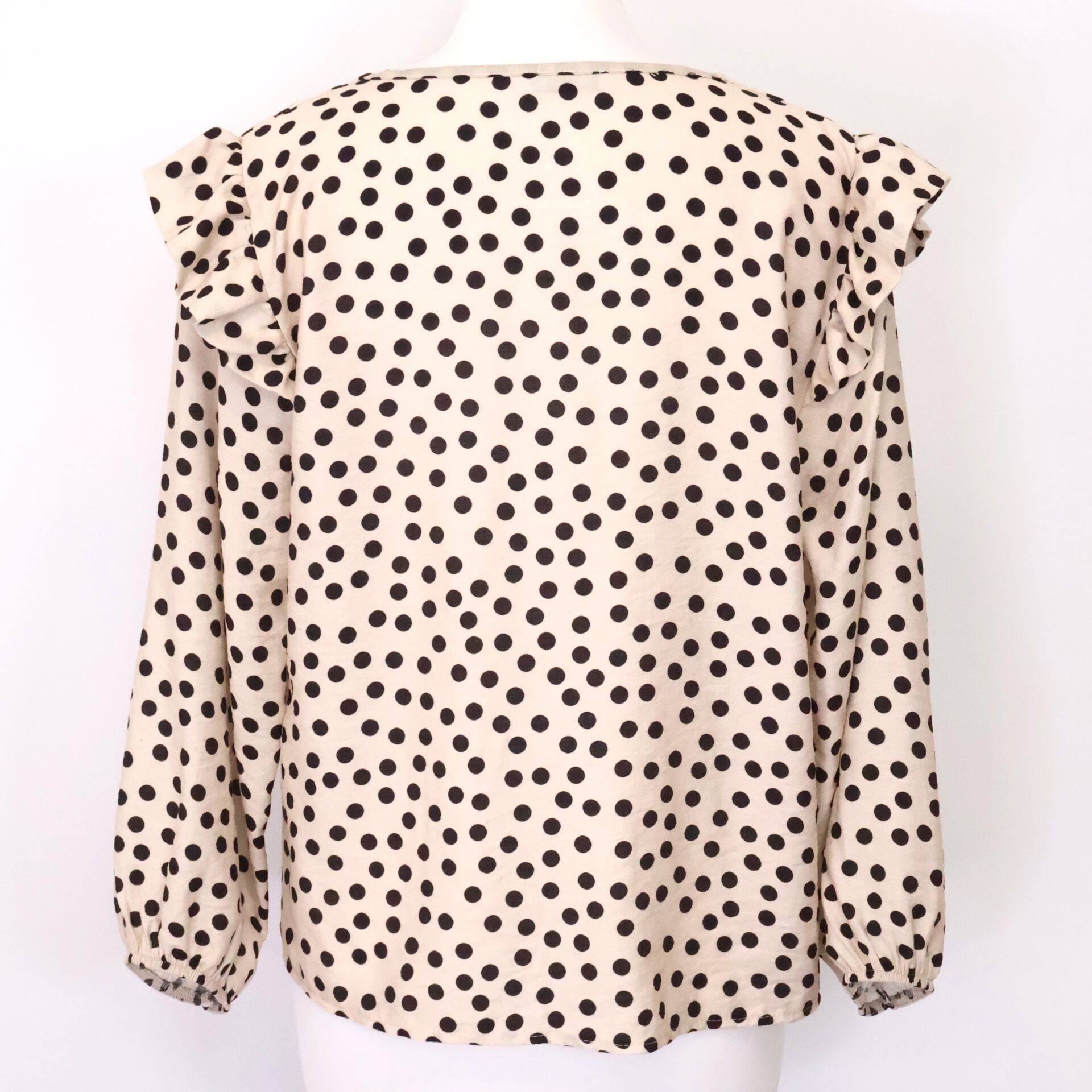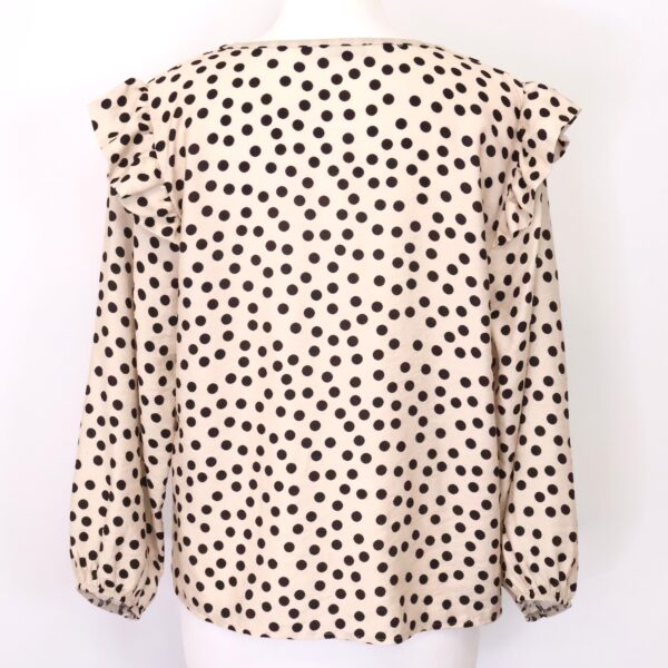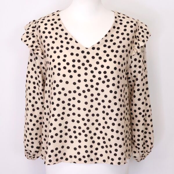 Blusa de manga larga de color beige con estampado de lunares a contraste en negro. Con escote en pico, volante decorativo en hombros y goma en los puños.