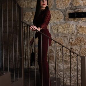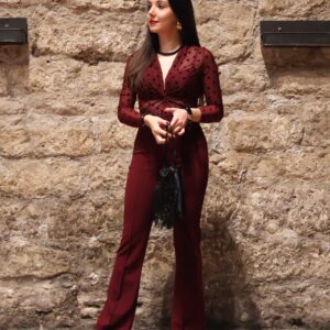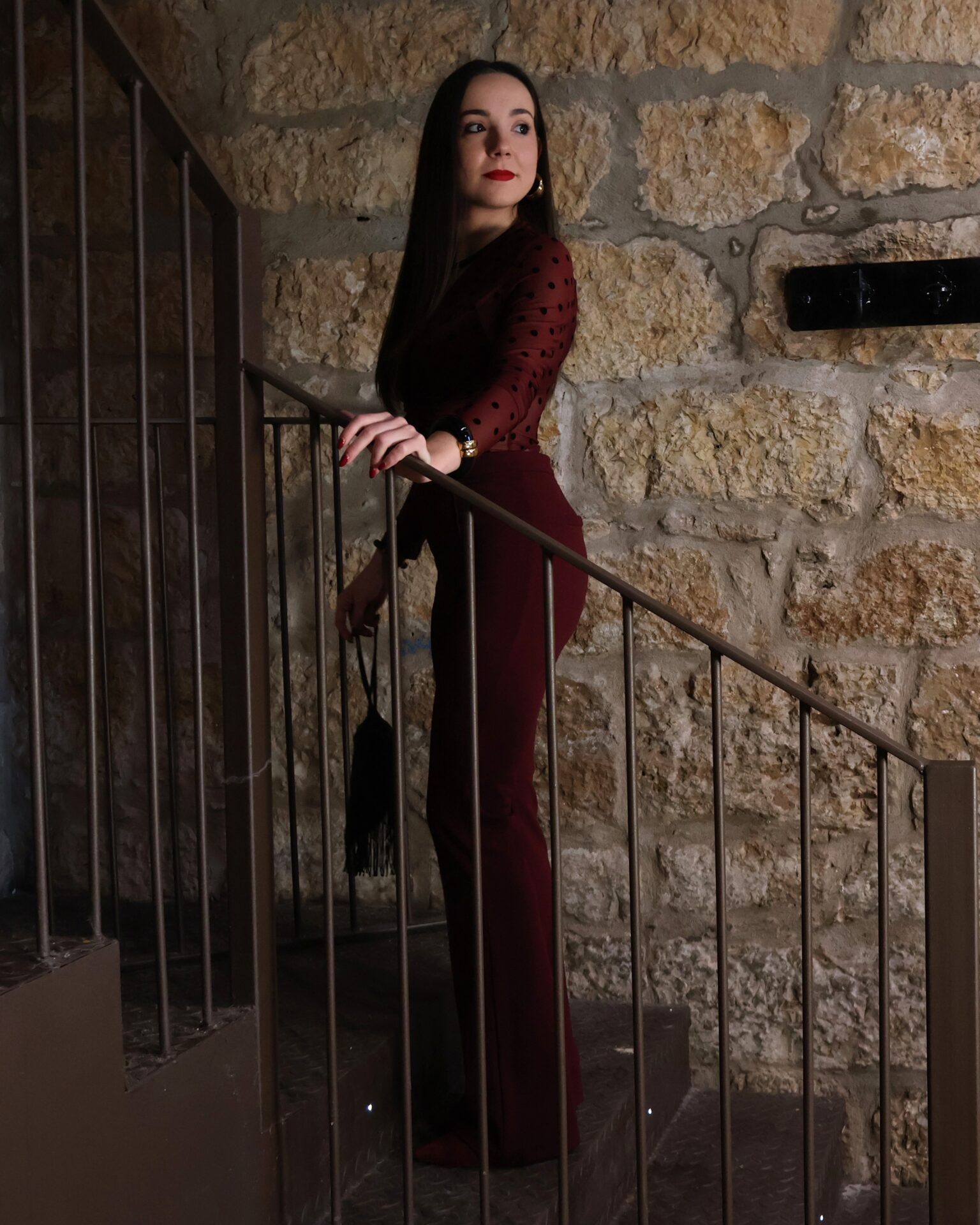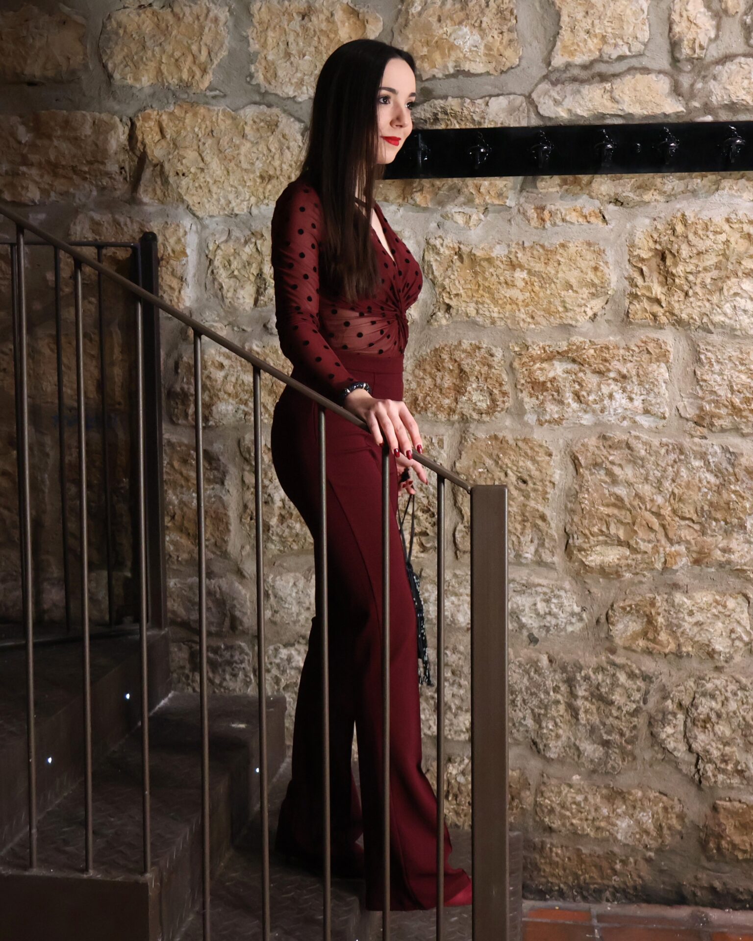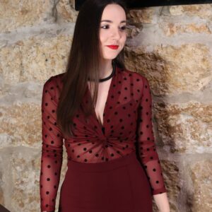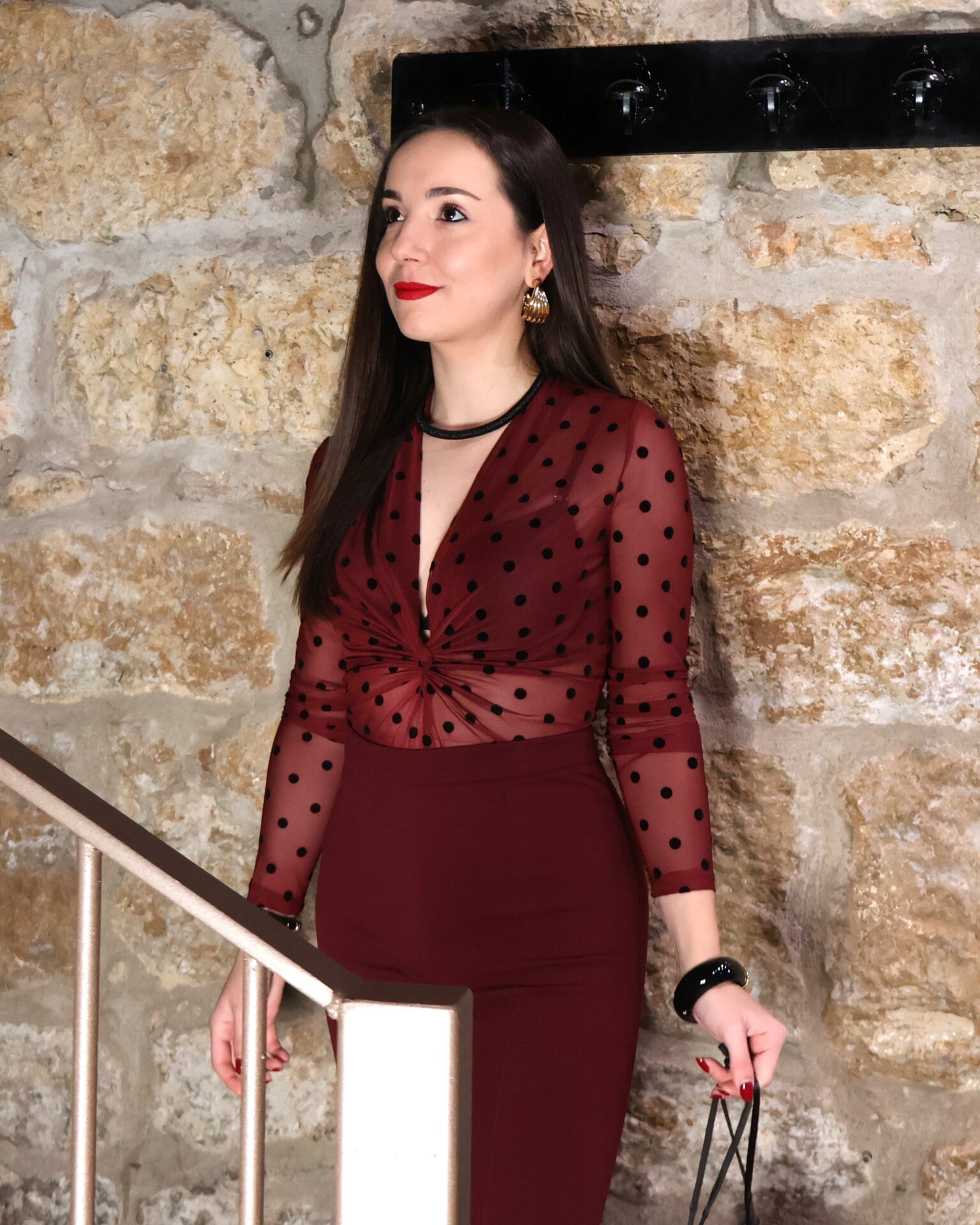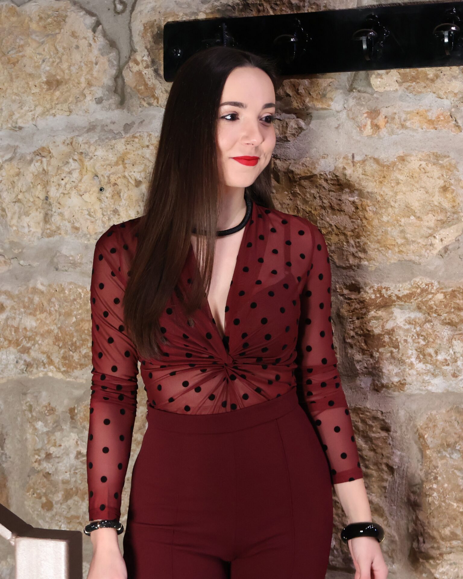 Body burdeos semitransparente decorado con lunares de terciopelo negro. Confecconado en tejido elástico y ajustado con escote en pico acabado en nudo. Cierre con ganchos en la parte inferior.