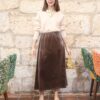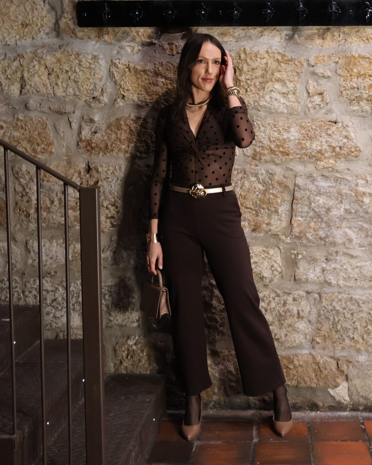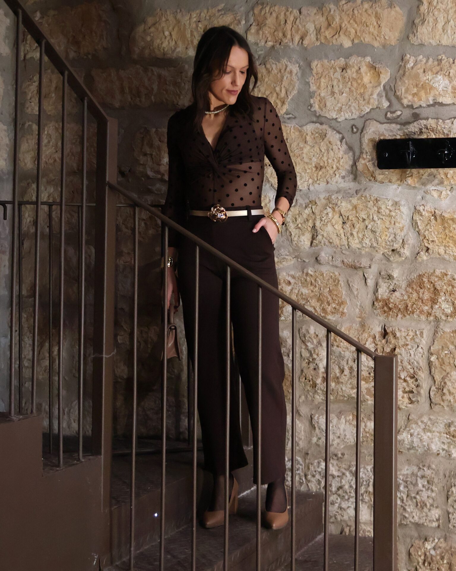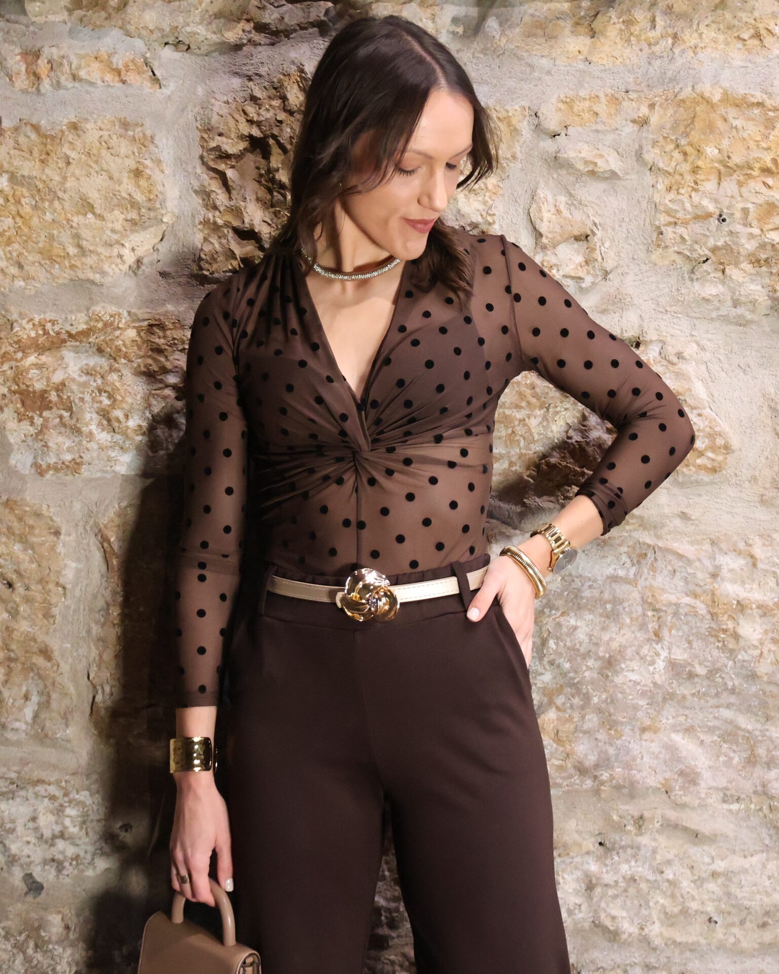 Body marrón chocolate semitransparente decorado con lunares de terciopelo negro. Confecconado en tejido elástico y ajustado con escote en pico acabado en nudo. Cierre con ganchos en la parte inferior.