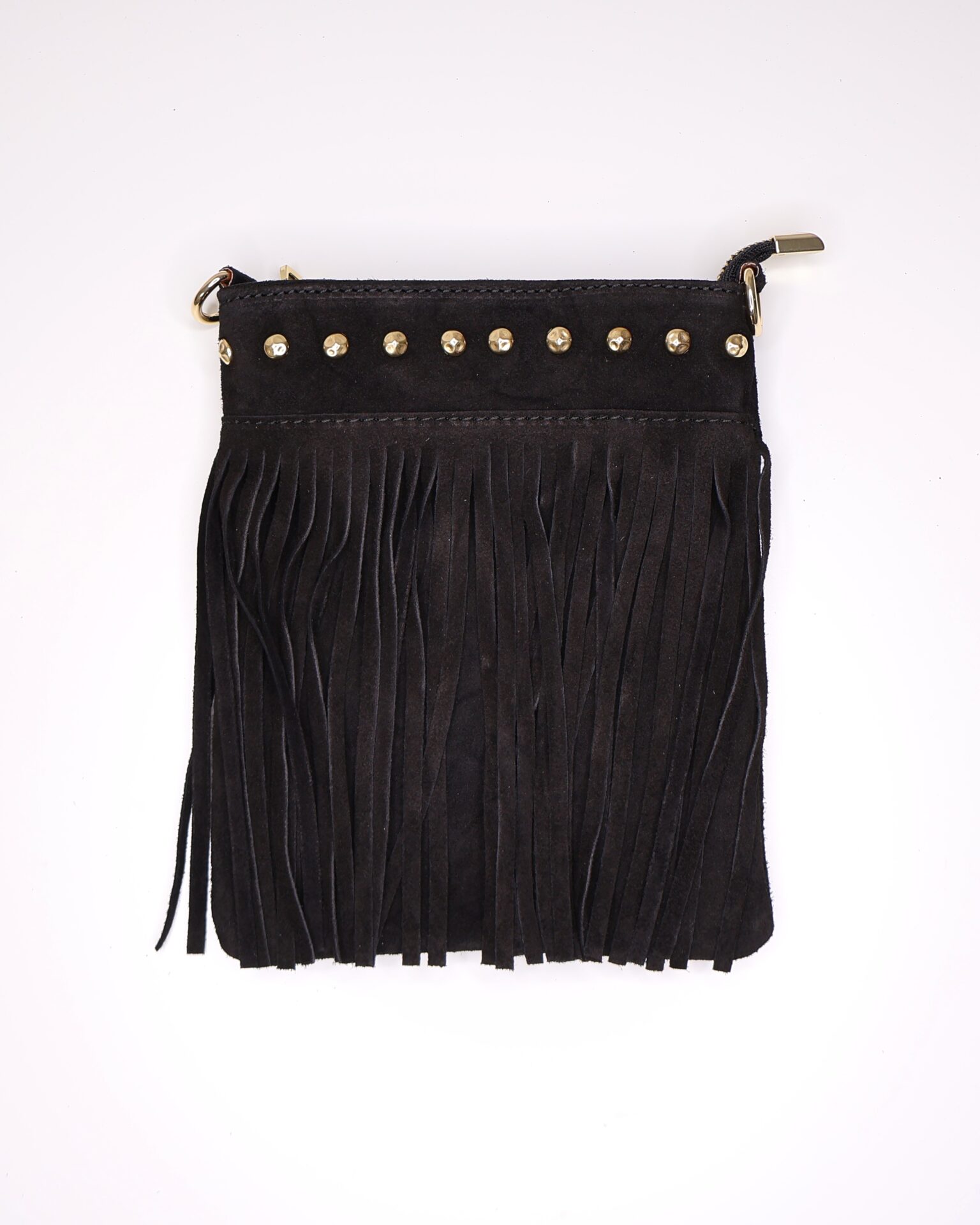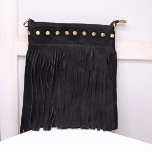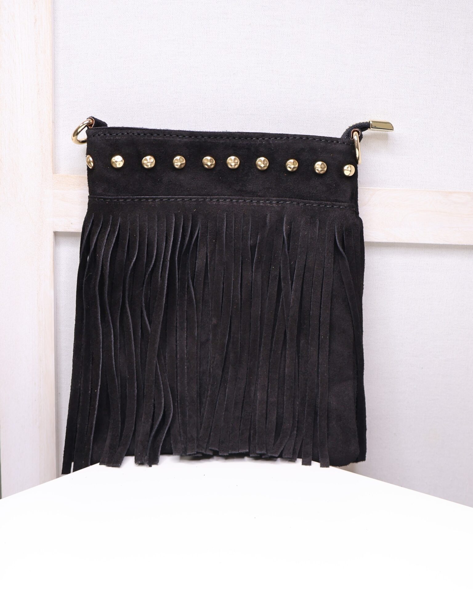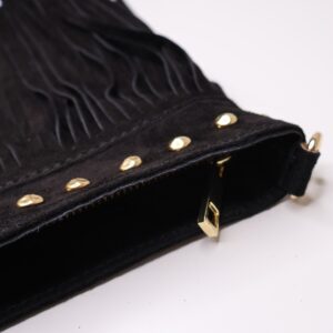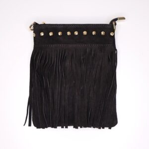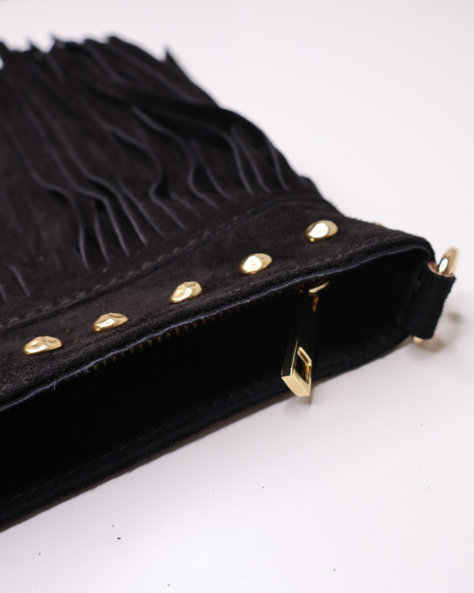 Bolso confeccionado en ante suave en color negro. Presenta detalle de flecos frontales que aportan movimiento y una línea de tachuelas metálicas en tono dorado en la parte superior, creando un bonito contraste. Incluye correa larga ajustable y desmontable, lo que permite llevarlo cómodamente al hombro o cruzado. Su tamaño es ideal para el día a día, combinando estilo y funcionalidad. Con forro y bolsillo interior.