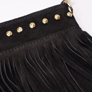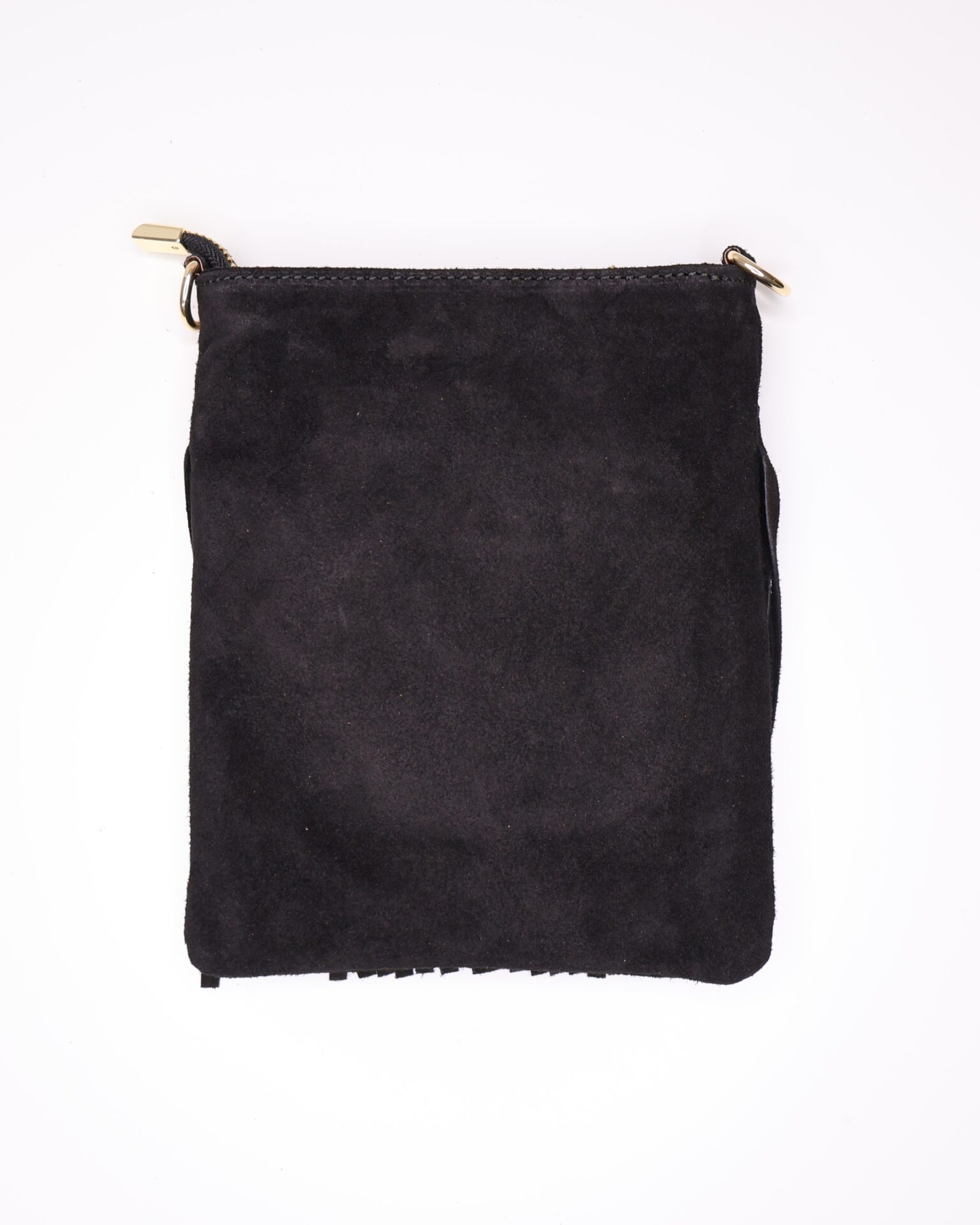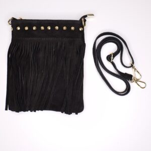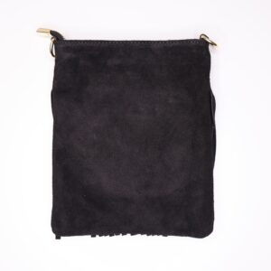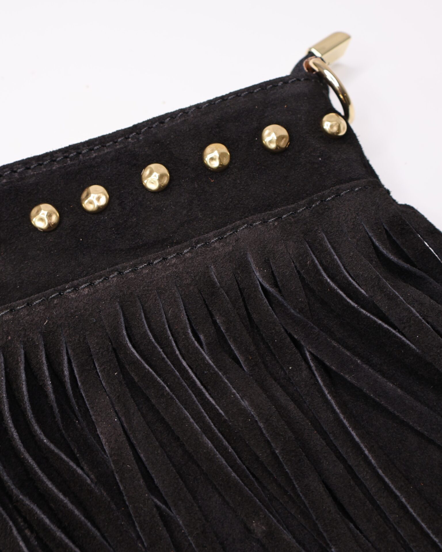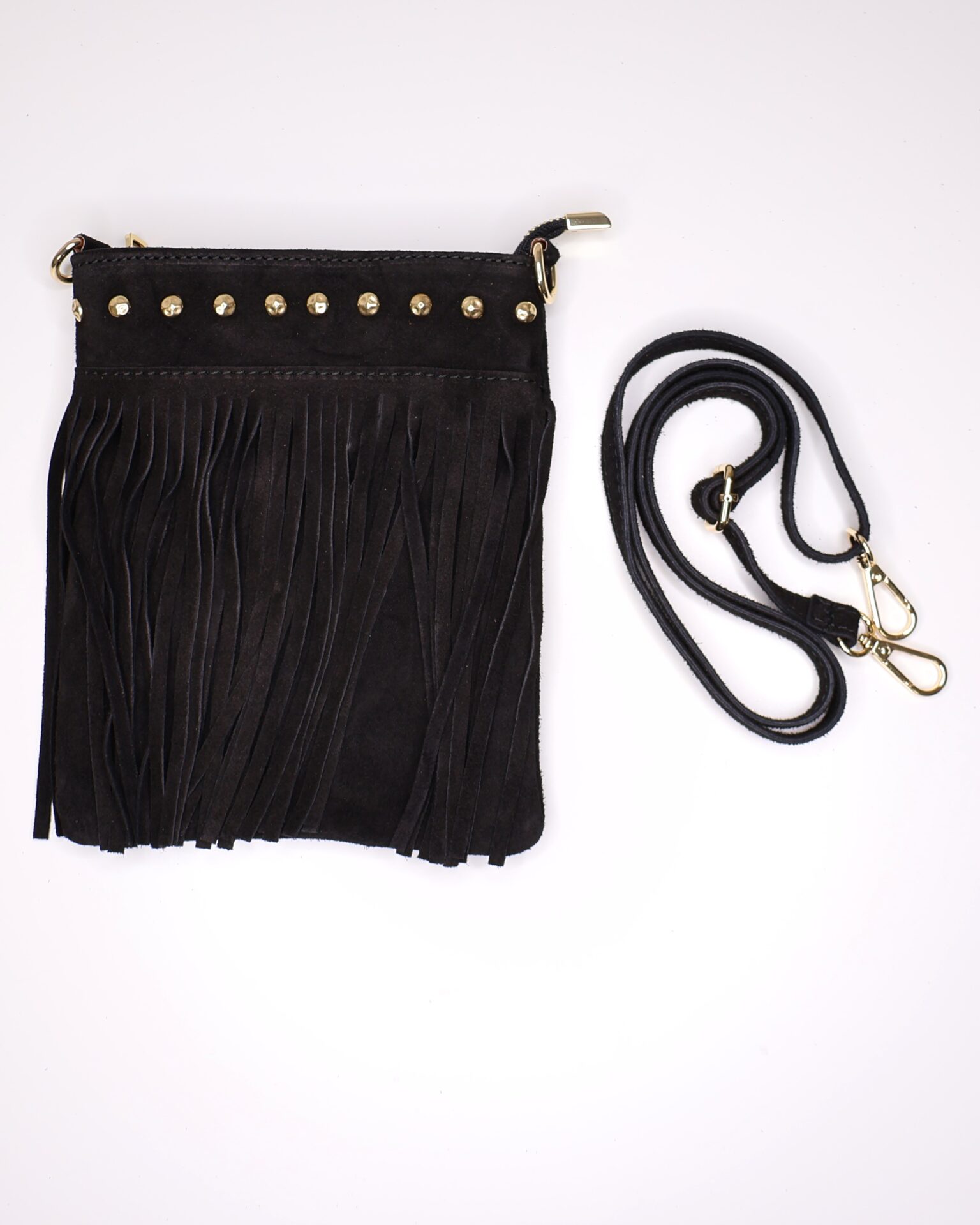 Bolso confeccionado en ante suave en color negro. Presenta detalle de flecos frontales que aportan movimiento y una línea de tachuelas metálicas en tono dorado en la parte superior, creando un bonito contraste. Incluye correa larga ajustable y desmontable, lo que permite llevarlo cómodamente al hombro o cruzado. Su tamaño es ideal para el día a día, combinando estilo y funcionalidad. Con forro y bolsillo interior.