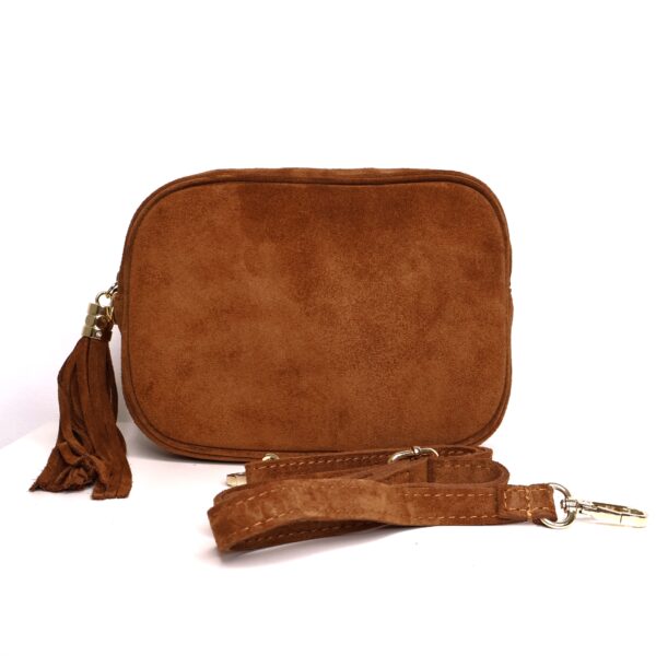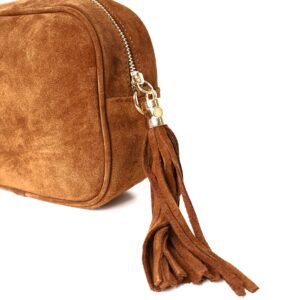 Bolso de color camel confeccionado en 100% ante natural. Con forro interior que incluye un bolsillo interior con cierre mediante cremallera. Borla flecada decorativa al lateral en el mismo material. Cierre mediante cremallera dorada. Incluye correa de ante regulable.