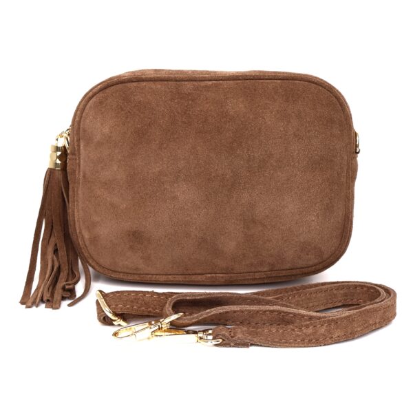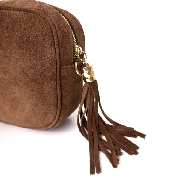 Bolso de color camel confeccionado en 100% ante natural. Con forro interior que incluye un bolsillo interior con cierre mediante cremallera. Borla flecada decorativa al lateral en el mismo material. Cierre mediante cremallera dorada. Incluye correa de piel regulable.