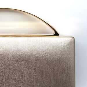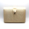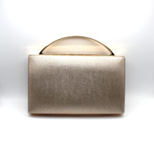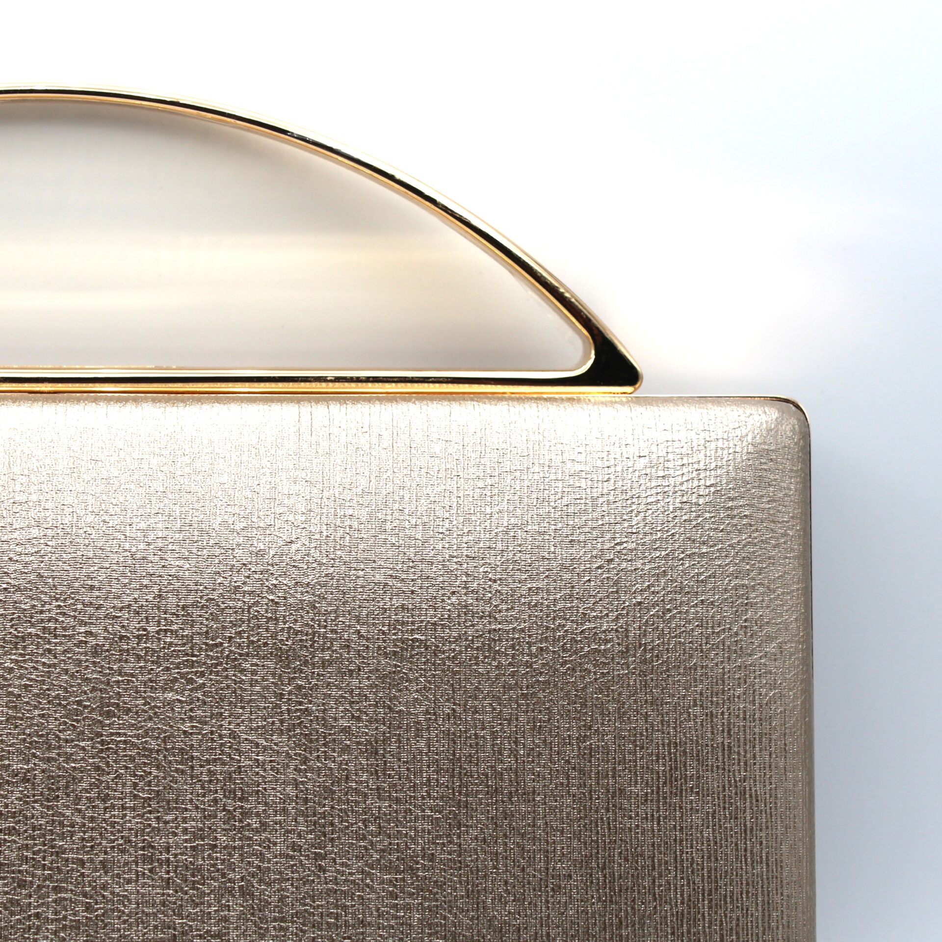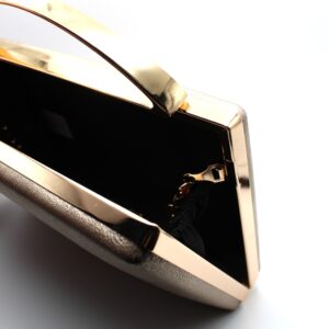 Bolso de fiesta con asa rígida en tono dorado. Cierre con imán y cadena dorada incluida.