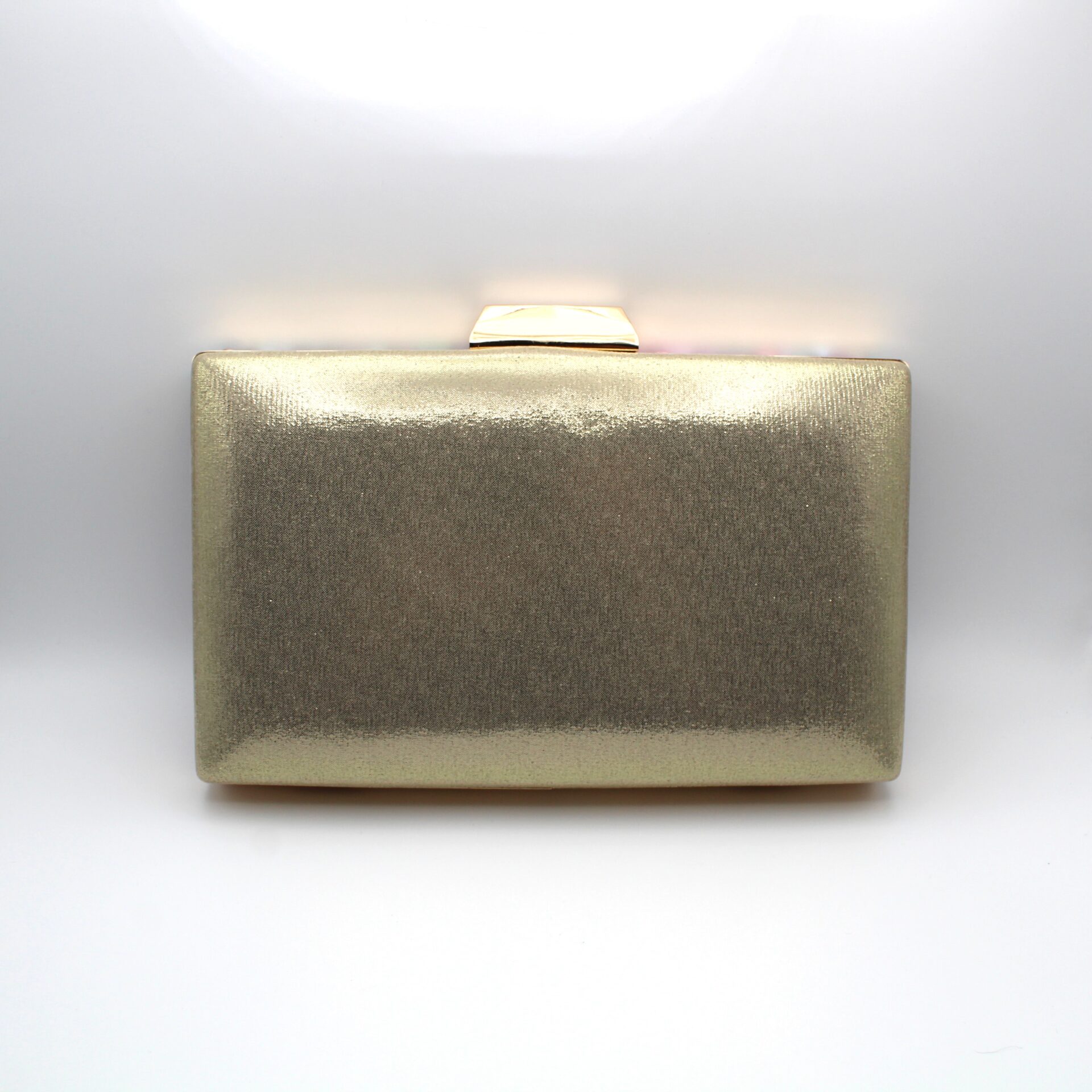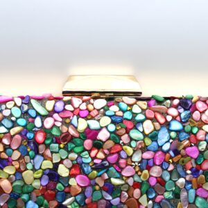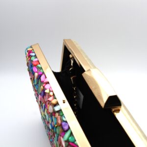 Bolso de fiesta con abalorios multicolores. Parte trasera en tono dorado. Cierre con imán y cadena dorada incluida.