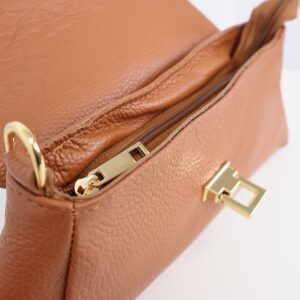 Bolso de mano de color camel confeccionado en 100% piel, perfecto para todos tus looks más arreglados. Cierre con cremallera y hebilla dorada. Incluye correa larga regulable en el mismo material y color para la comodidad en tus looks más casual. Con forro y un compartimento interior con cremallera.