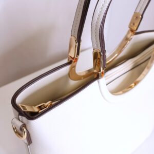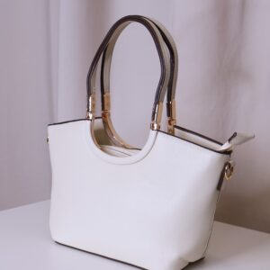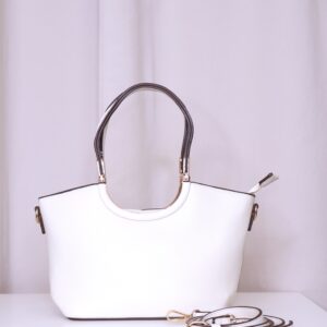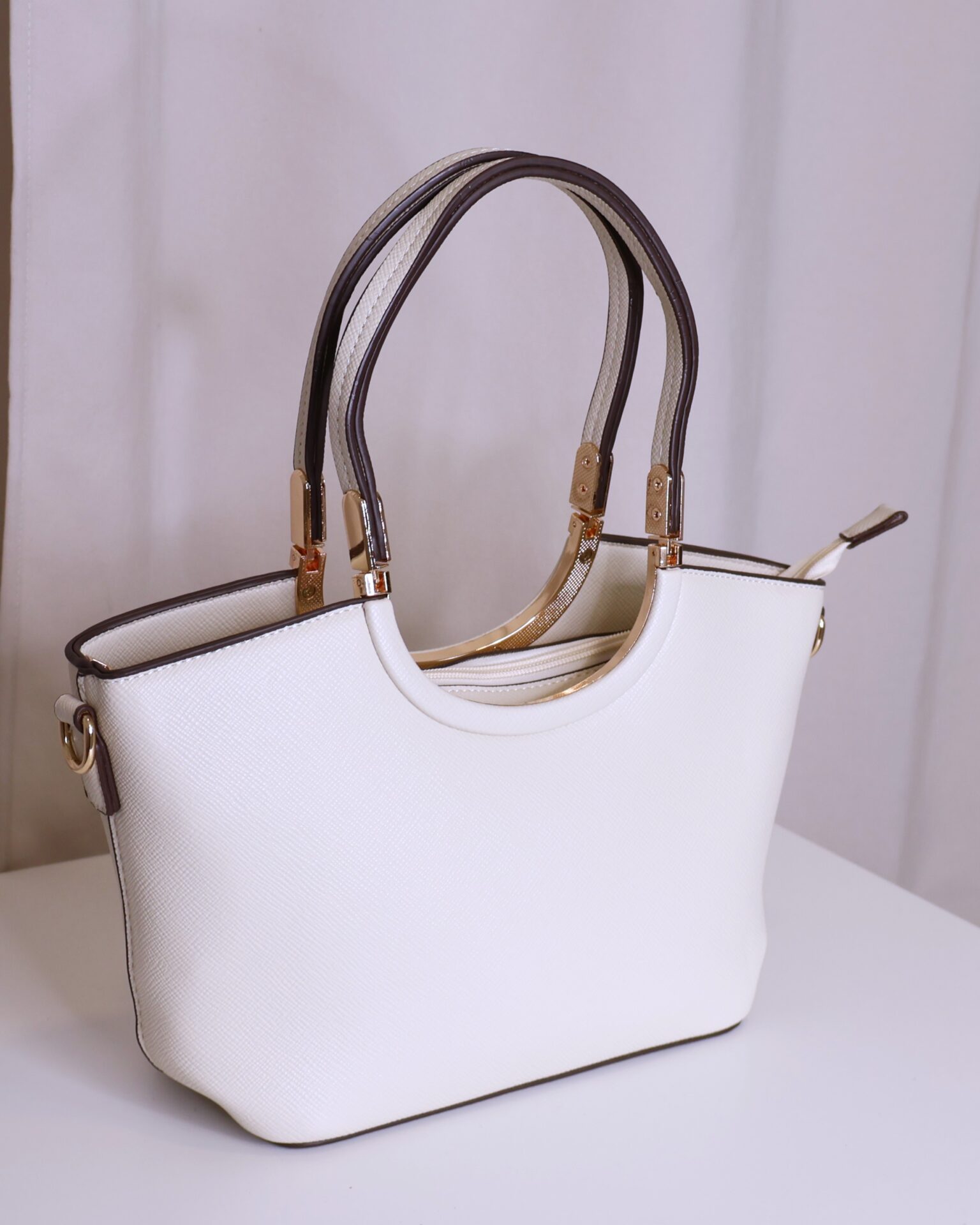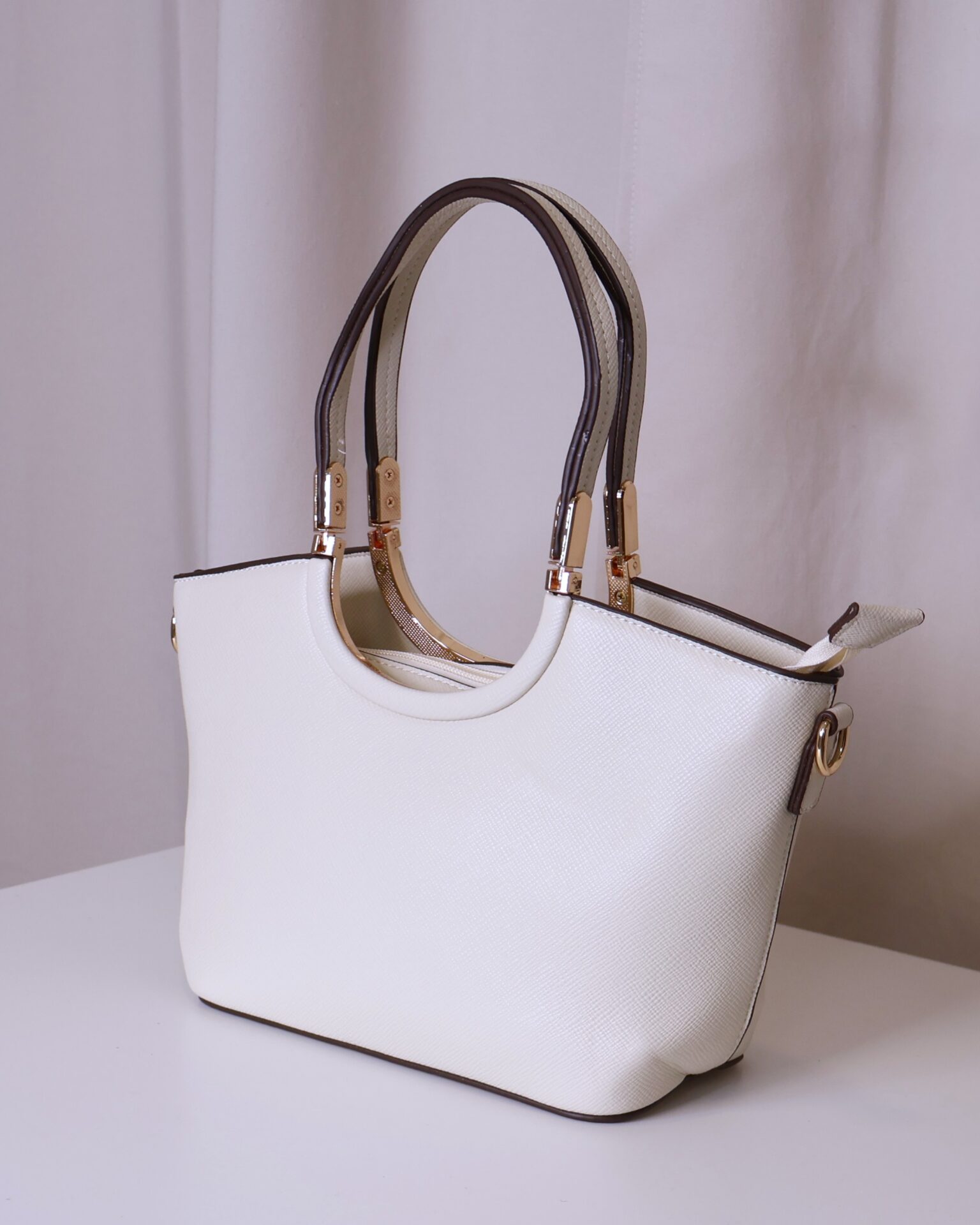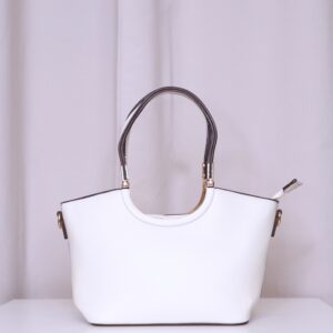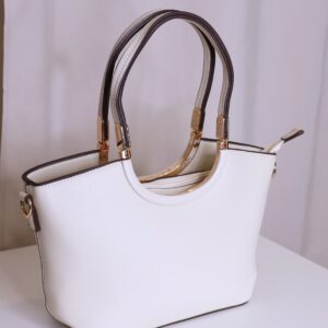Bolso en color crema elegante y versátil que combina practicidad y estilo. Cuenta con asa corta, ideal para llevar en la mano o al hombro, decorada con detalles metálicos dorados que aportan un toque sofisticado. También dispone de asa larga regulable, perfecta para llevar cruzado cómodamente. Se cierra mediante cremallera, asegurando tus pertenencias.