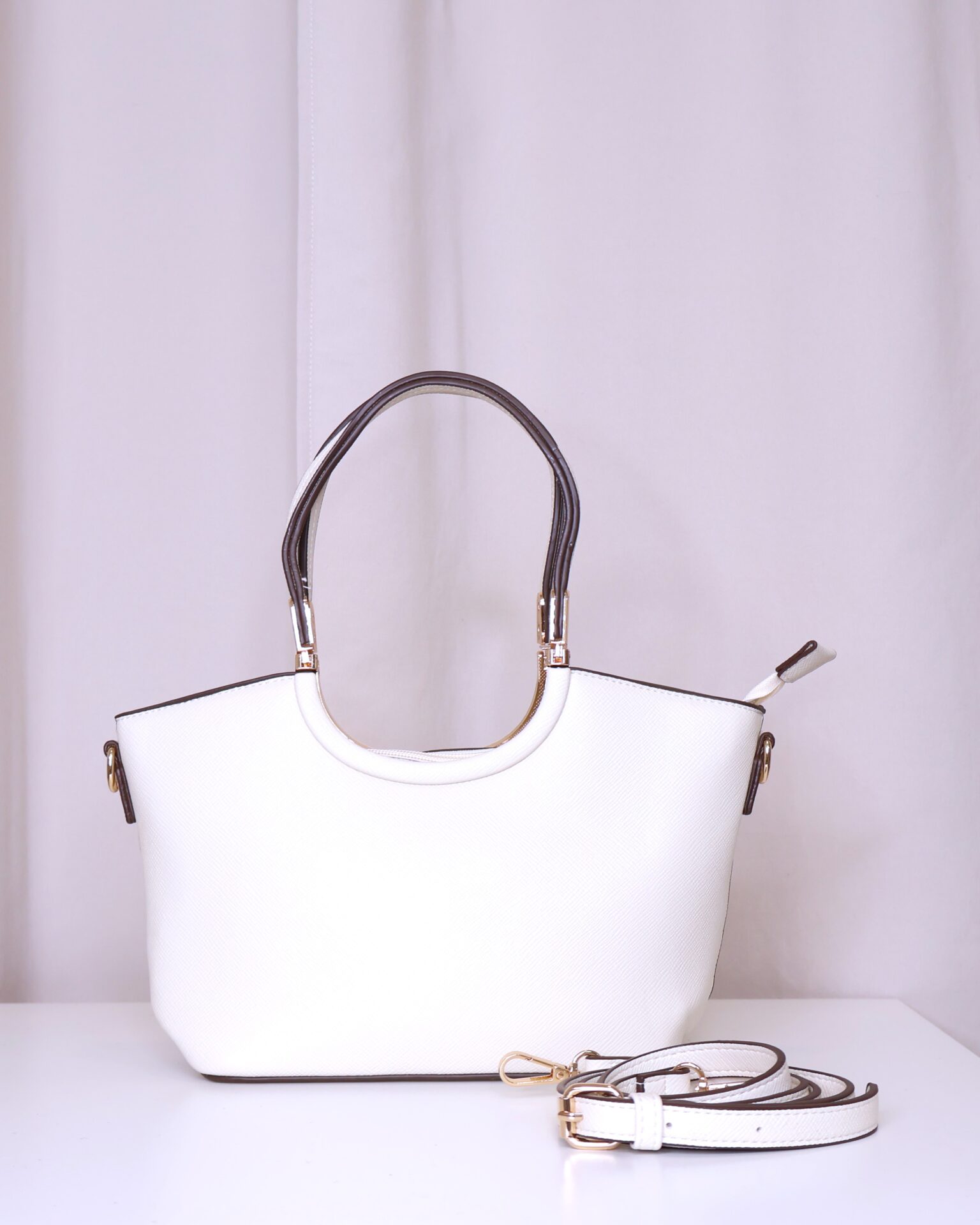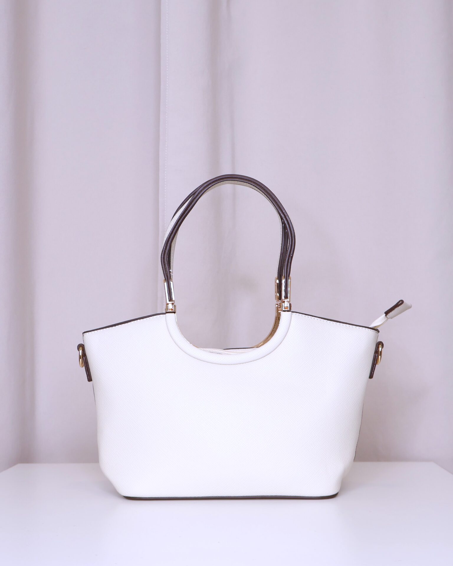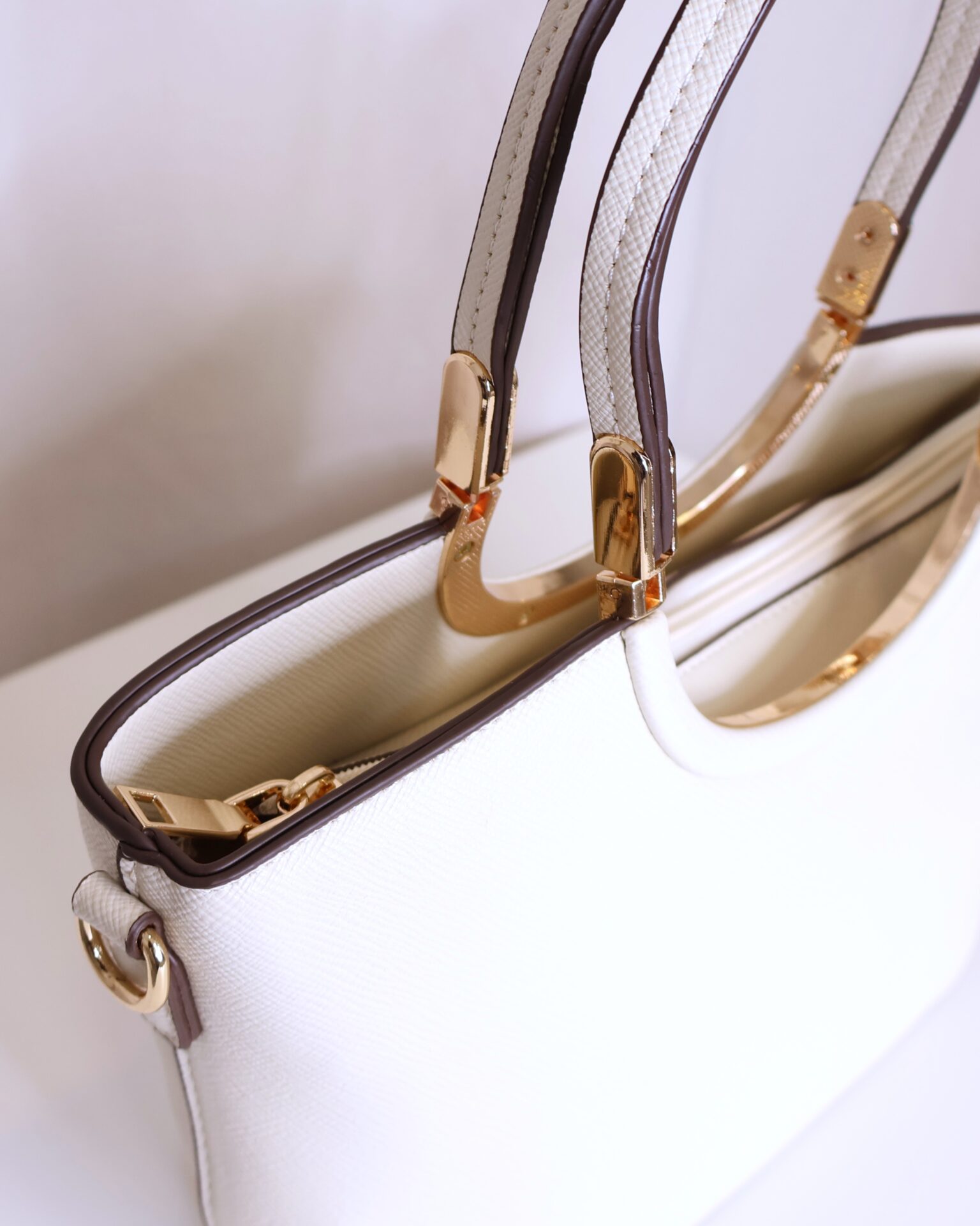 Bolso en color crema elegante y versátil que combina practicidad y estilo. Cuenta con asa corta, ideal para llevar en la mano o al hombro, decorada con detalles metálicos dorados que aportan un toque sofisticado. También dispone de asa larga regulable, perfecta para llevar cruzado cómodamente. Se cierra mediante cremallera, asegurando tus pertenencias.
