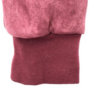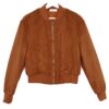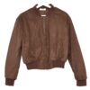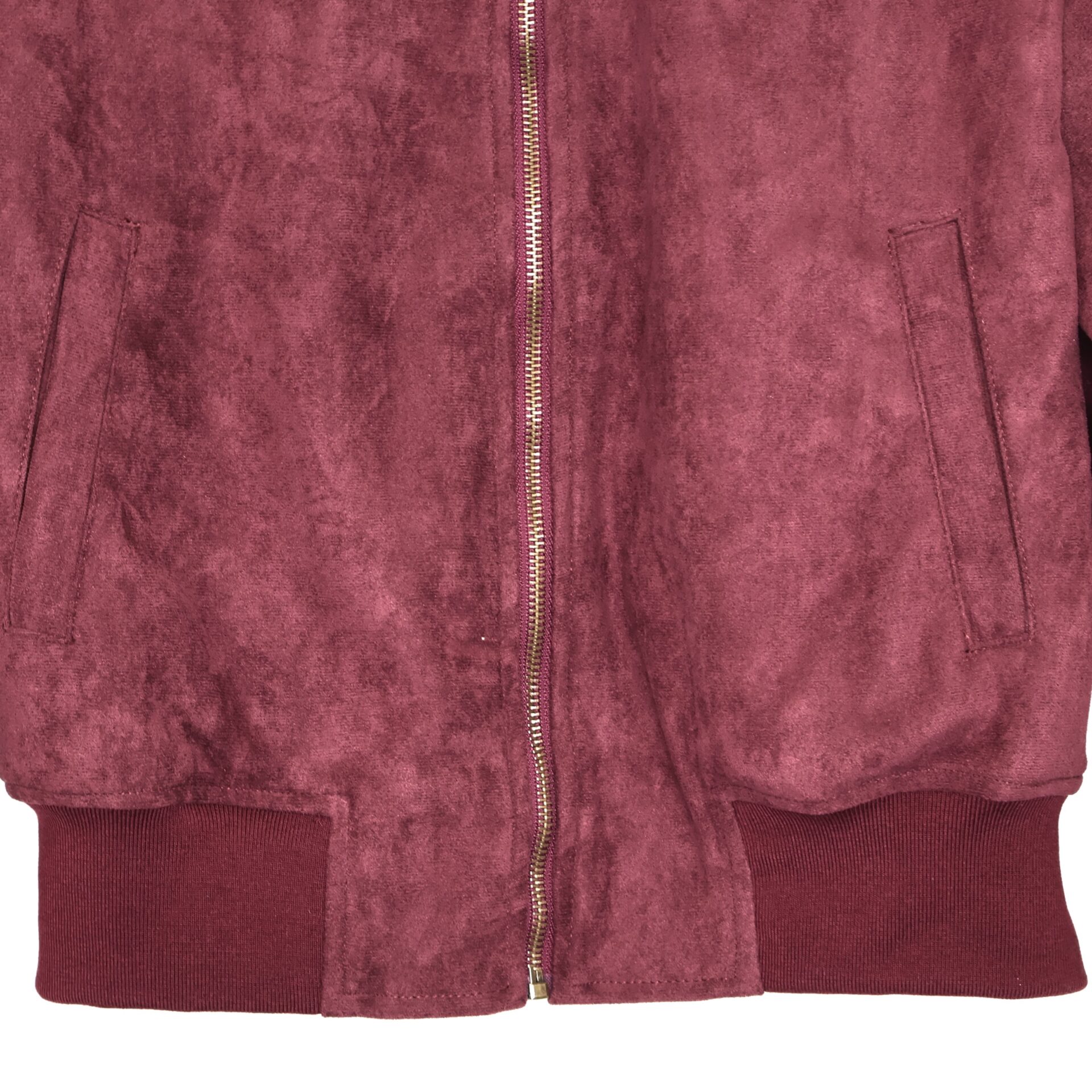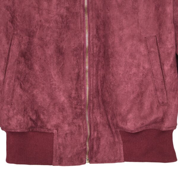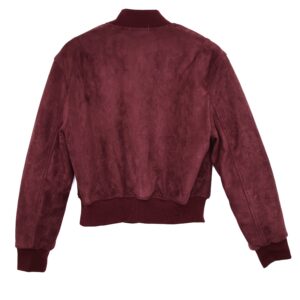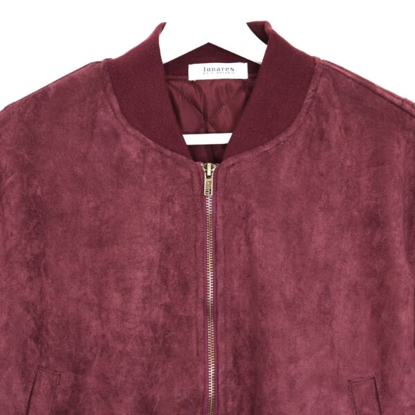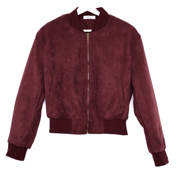 Chaqueta bomber confeccionada en ante de color burdeos con forro interior acolchado. Cuello redondo. Cierre frontal con cremallera. Bolsillos delanteros. Goma en cintura, cuello y puños.