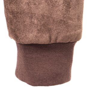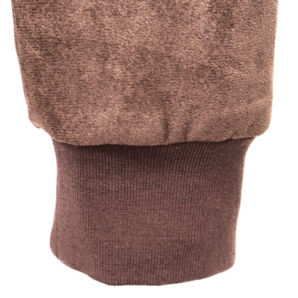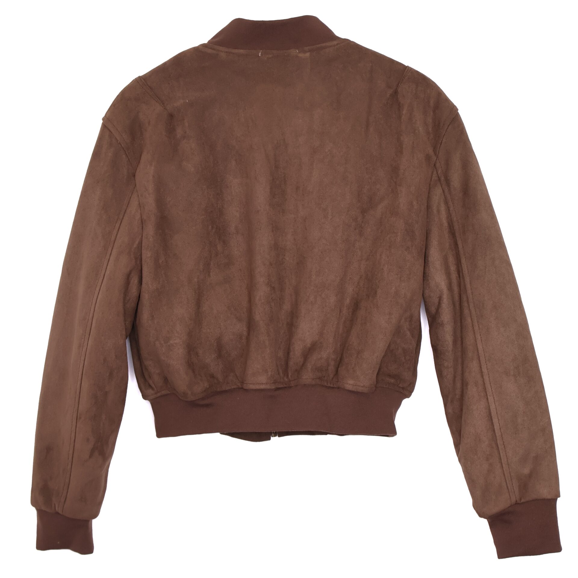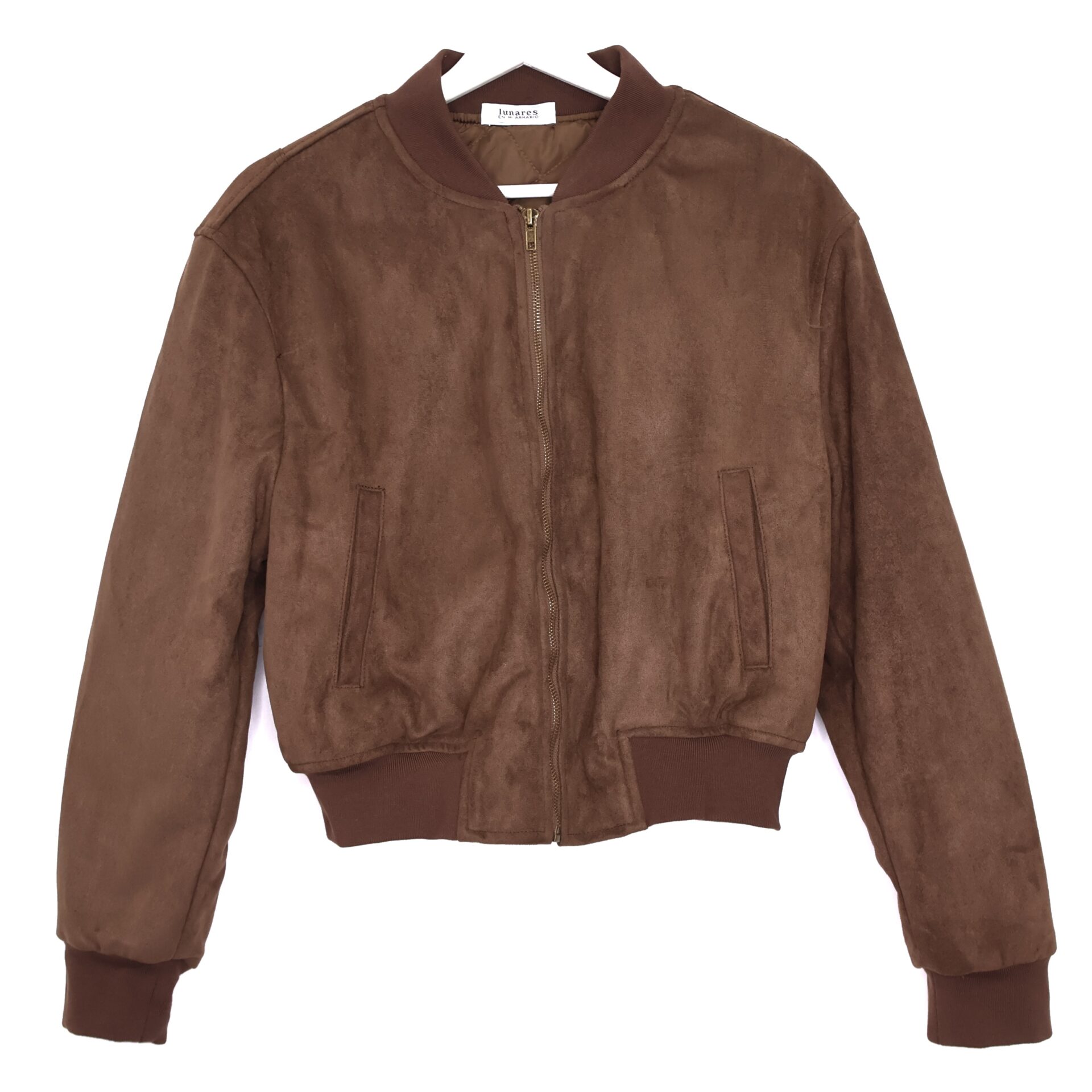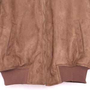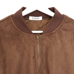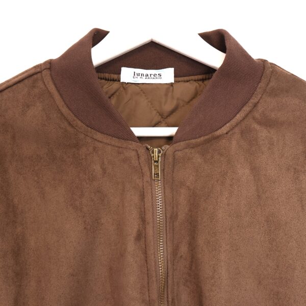 Chaqueta bomber confeccionada en ante de color marrón chocolate con forro interior acolchado. Cuello redondo. Cierre frontal con cremallera. Bolsillos delanteros. Goma en cintura, cuello y puños.
