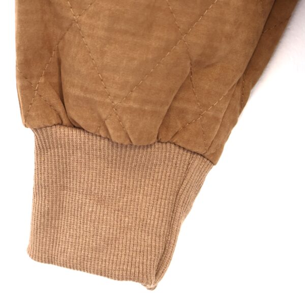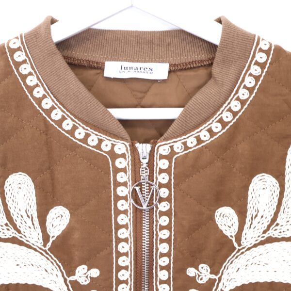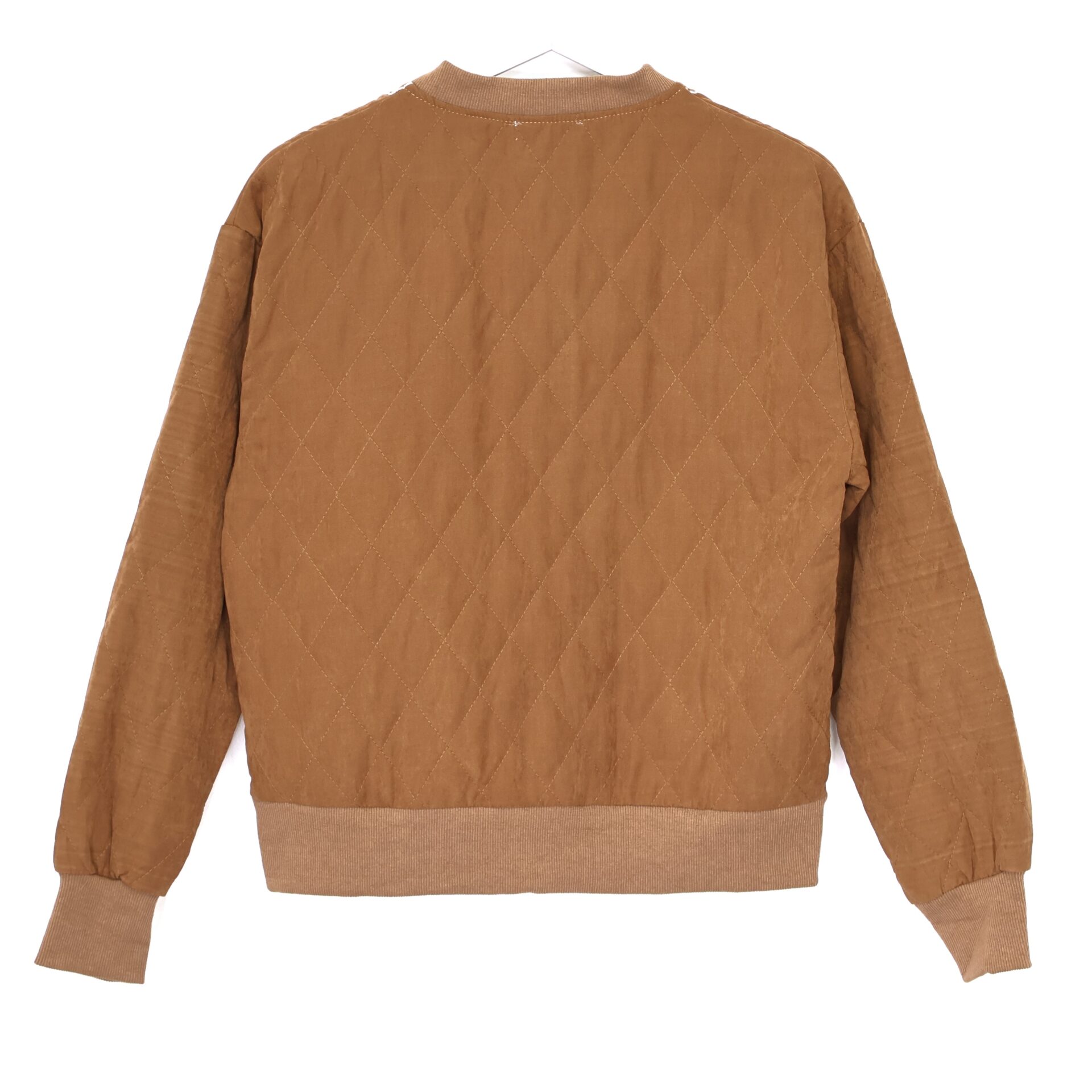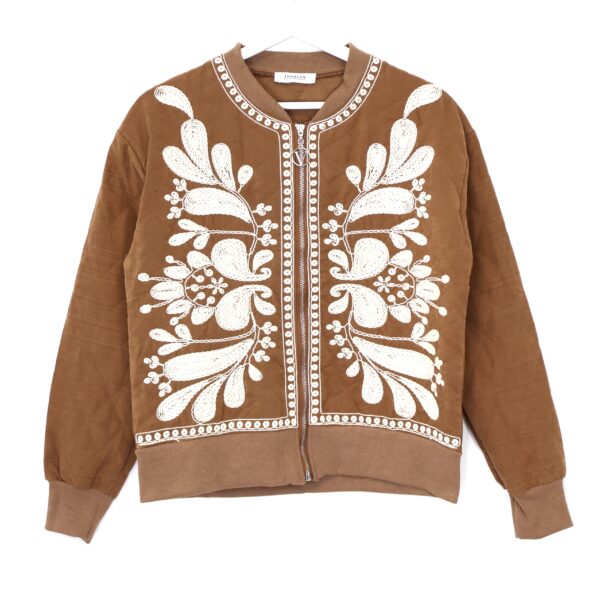 Chaqueta bomber de color camel con detalle de bordado decorativo a contraste en blanco en la parte frontal. Cuello redondo. Cierre frontal con cremallera. Corte oversize con manga caída. Goma en cintura, cuello y puños.