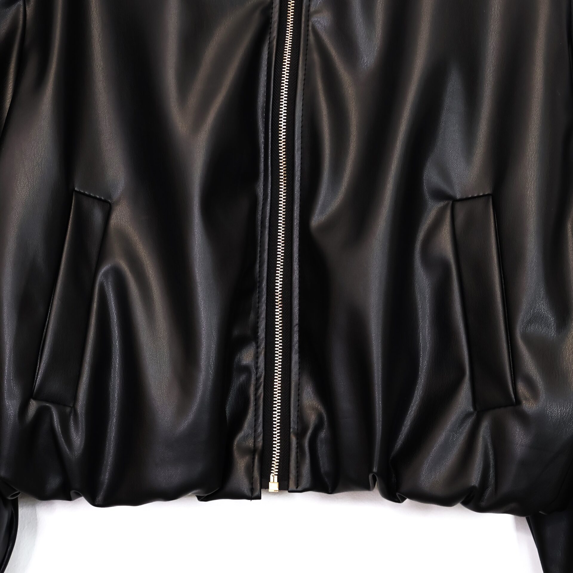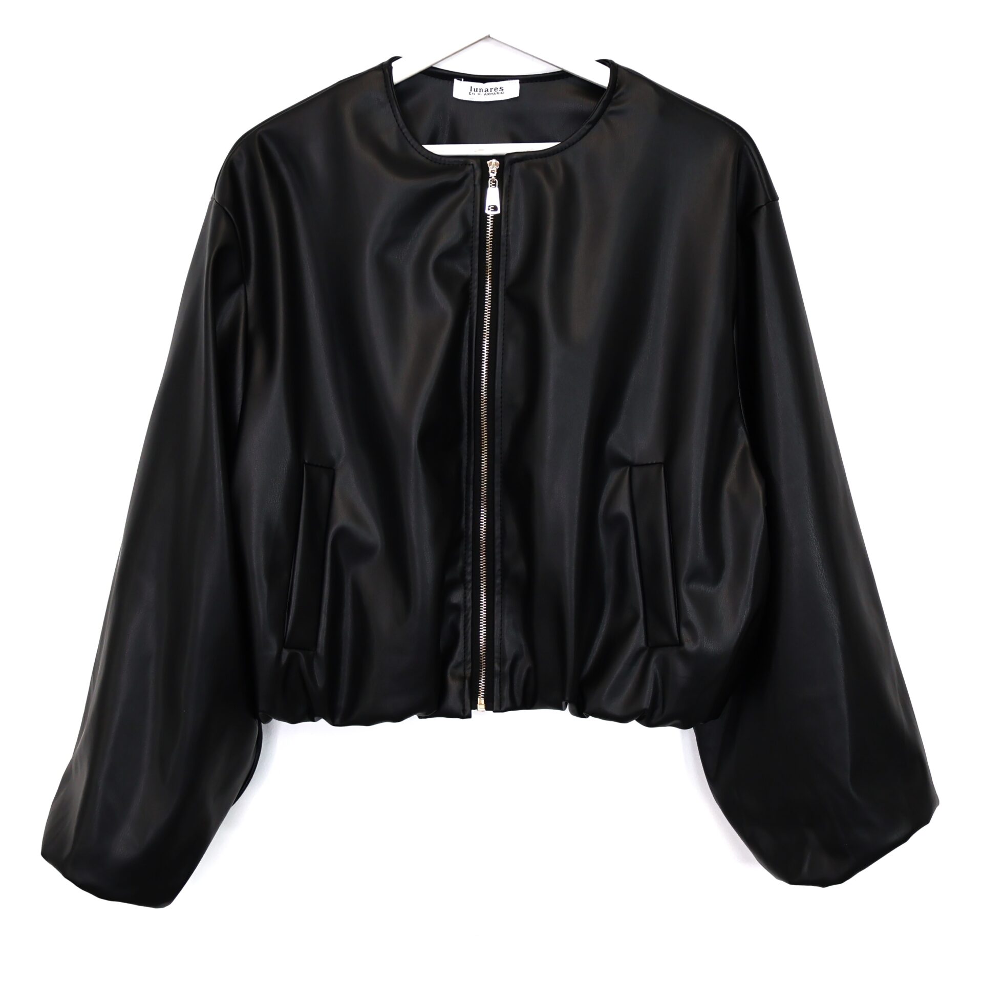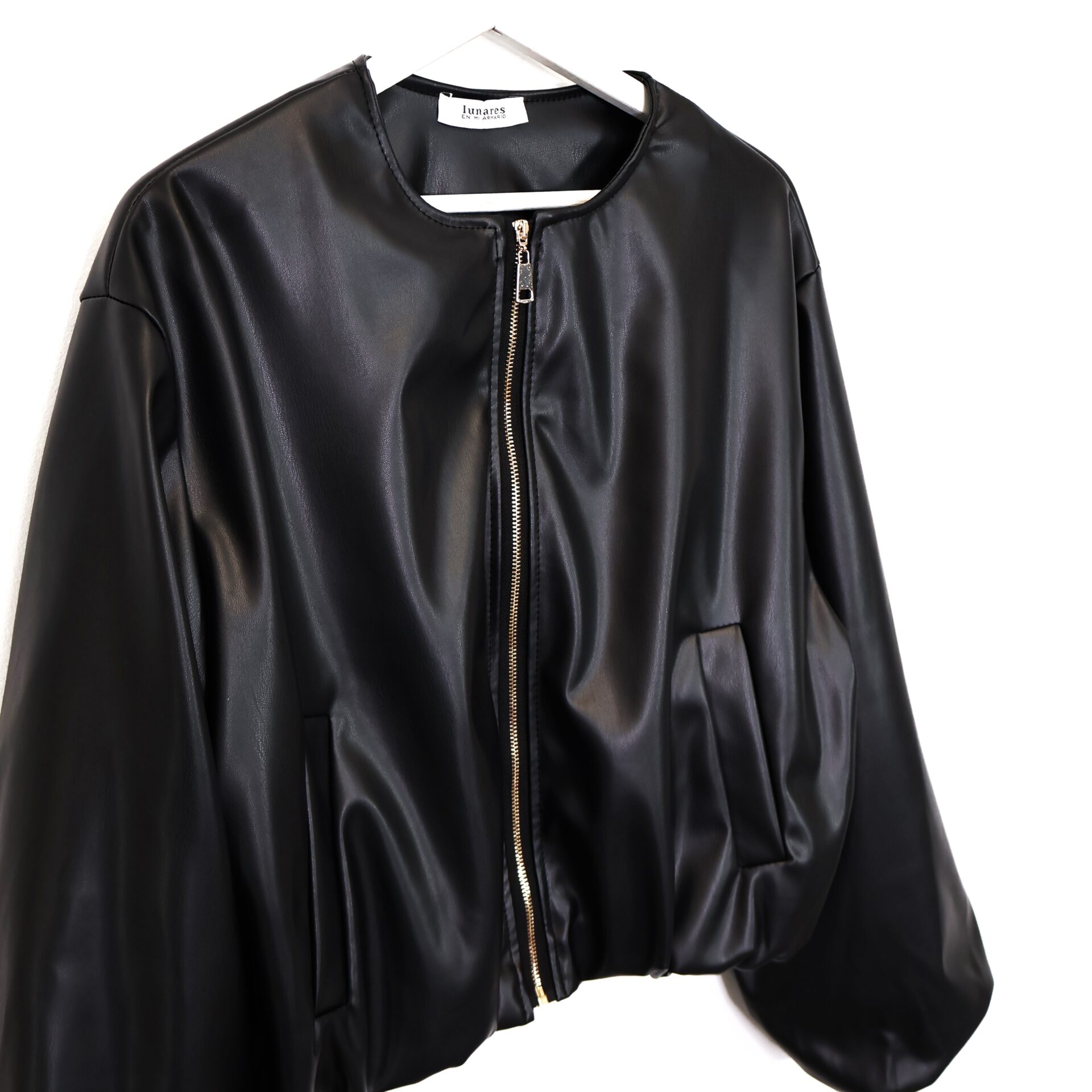 Chaqueta bomber confeccionada en PU en color negro. Cuello redondo. Cierre frontal con cremallera. Bolsillos delanteros. Goma en puños y cintura.