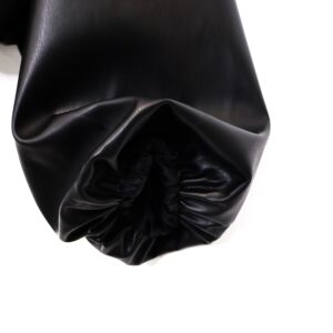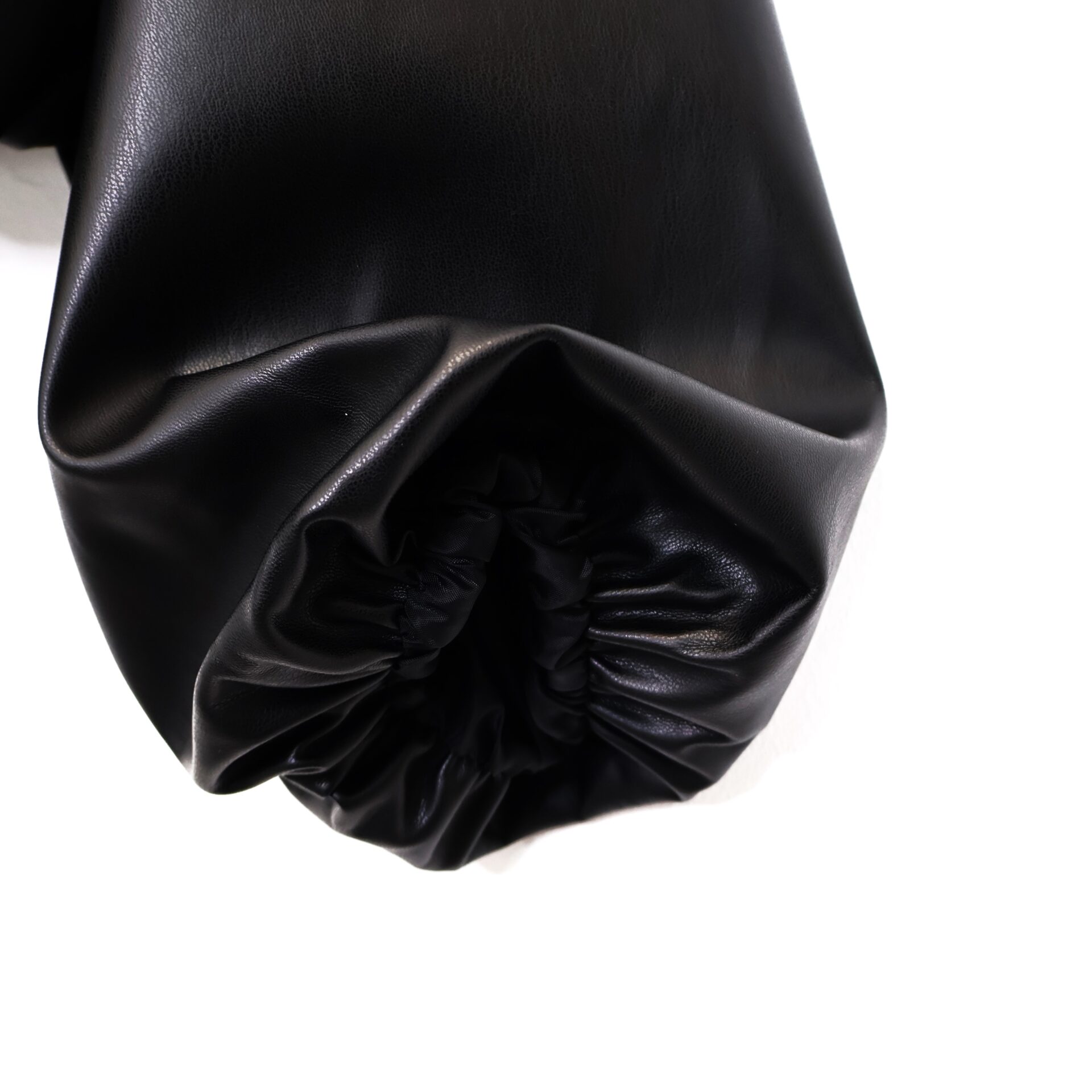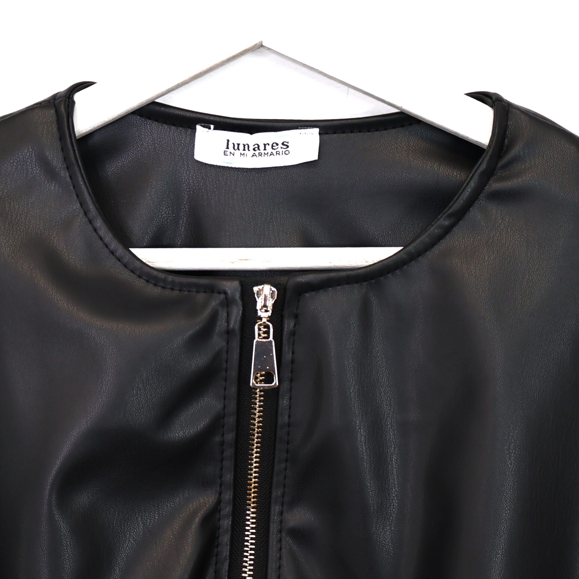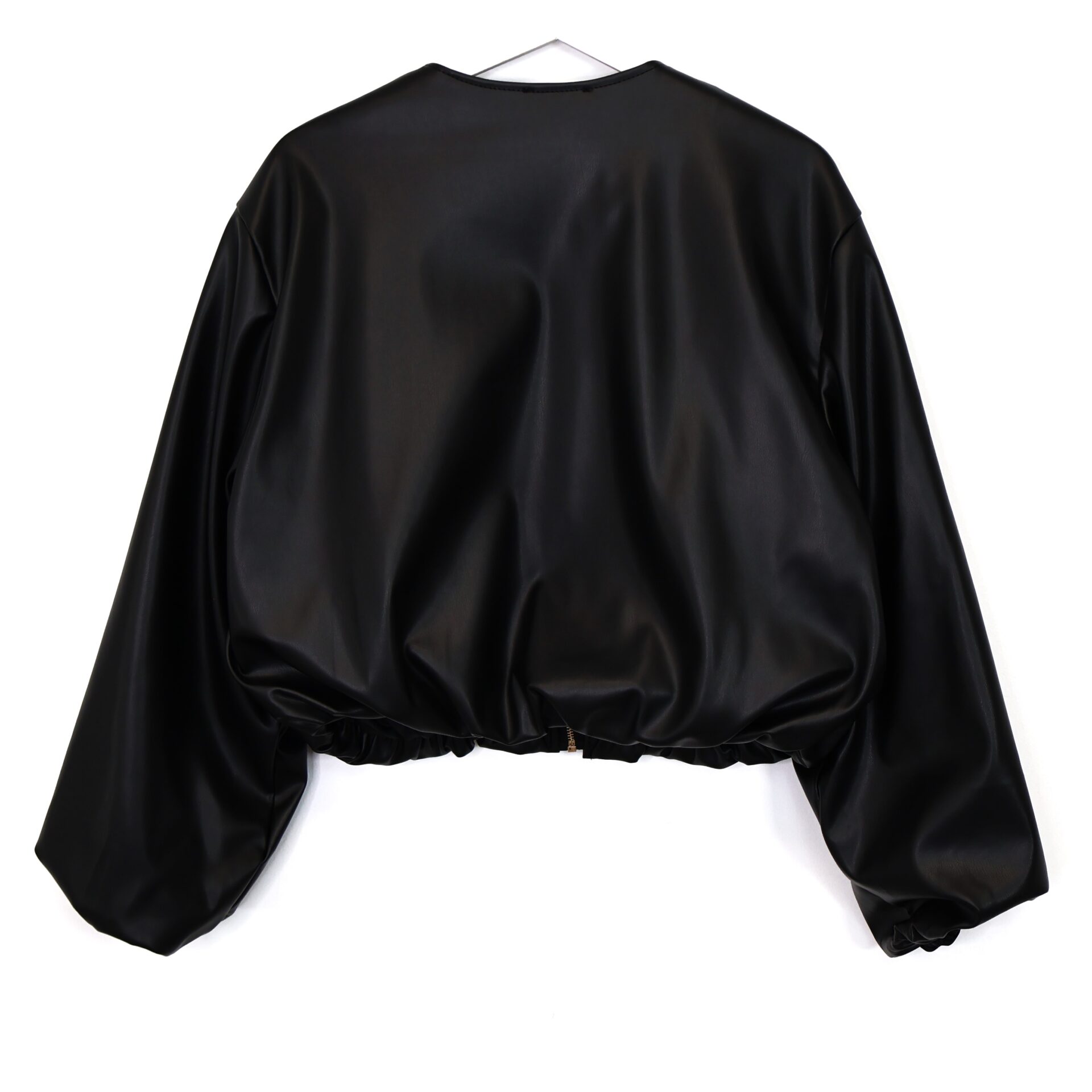 Chaqueta bomber confeccionada en PU en color negro. Cuello redondo. Cierre frontal con cremallera. Bolsillos delanteros. Goma en puños y cintura.