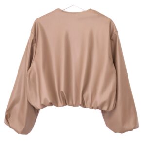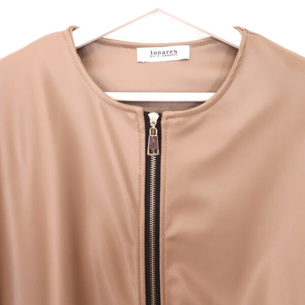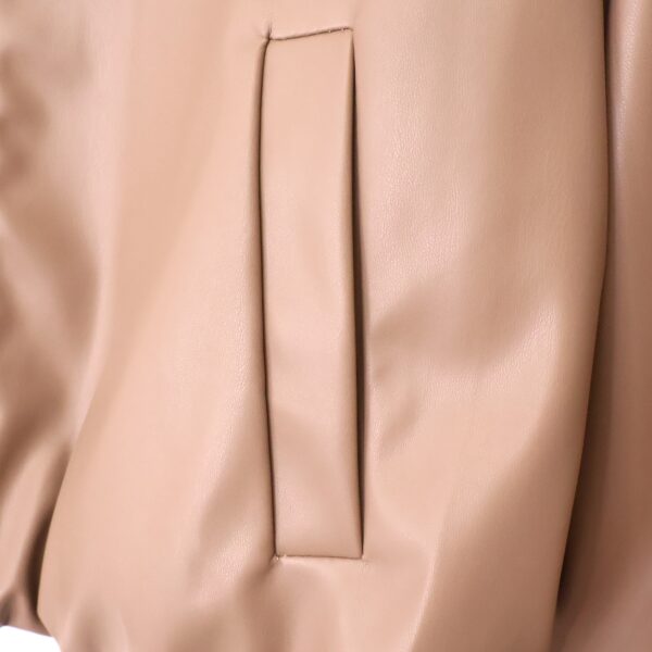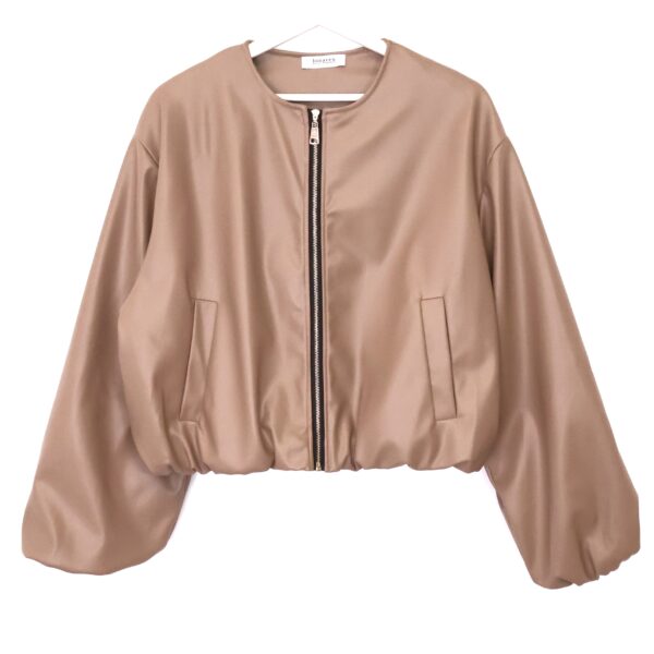 Chaqueta bomber confeccionada en PU en color taupe. Cuello redondo. Cierre frontal con cremallera. Bolsillos delanteros. Goma en puños y cintura.