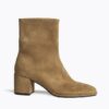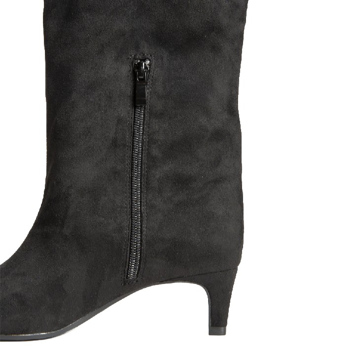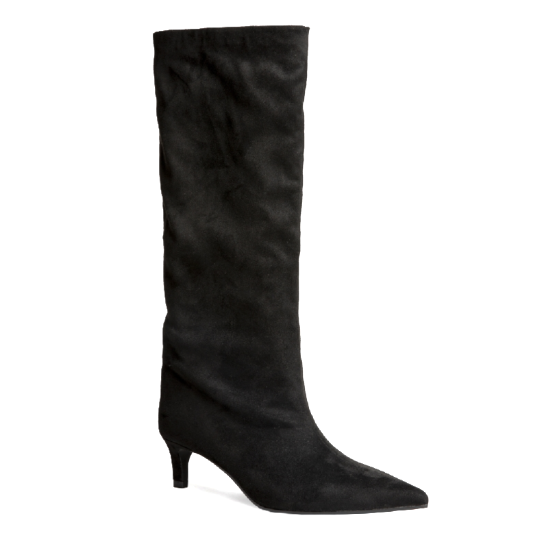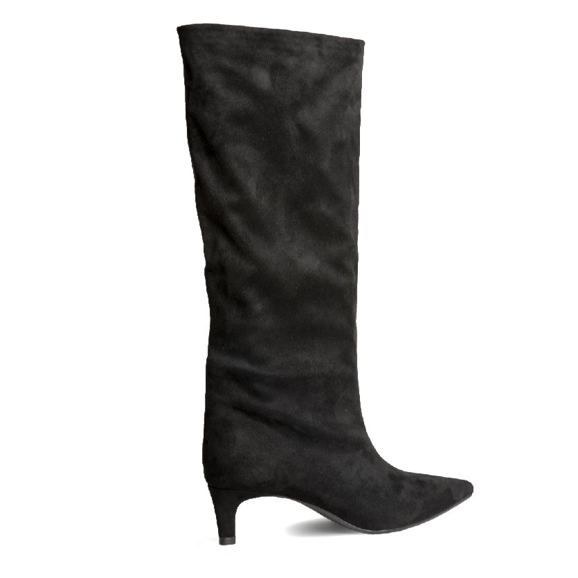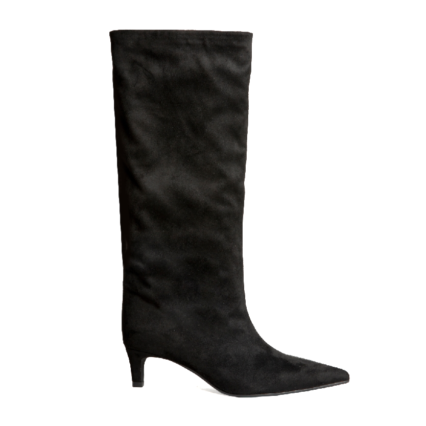 Bota fabricada en suave ante de color negro. Caña alta. Cierre en cremallera lateral. Plantilla acolchada. Horma en punta fina. Tacón fino de 5 cm.
