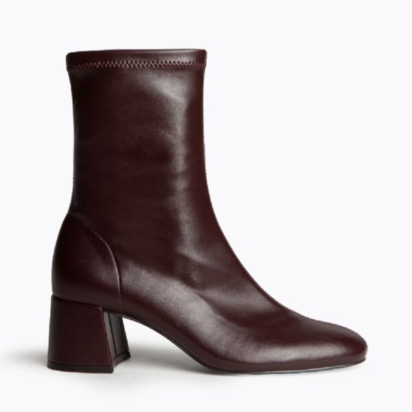 Botín de tacón en color burdeos fabricado en en material pu con efecto licra y detalle pespunte. Horma cuadrada. Cierre a modo calce. Altura de la caña 19cm. Forro y plantilla acolchada en textíl. Tacón medio cuadrado forrado altura 5cm.
