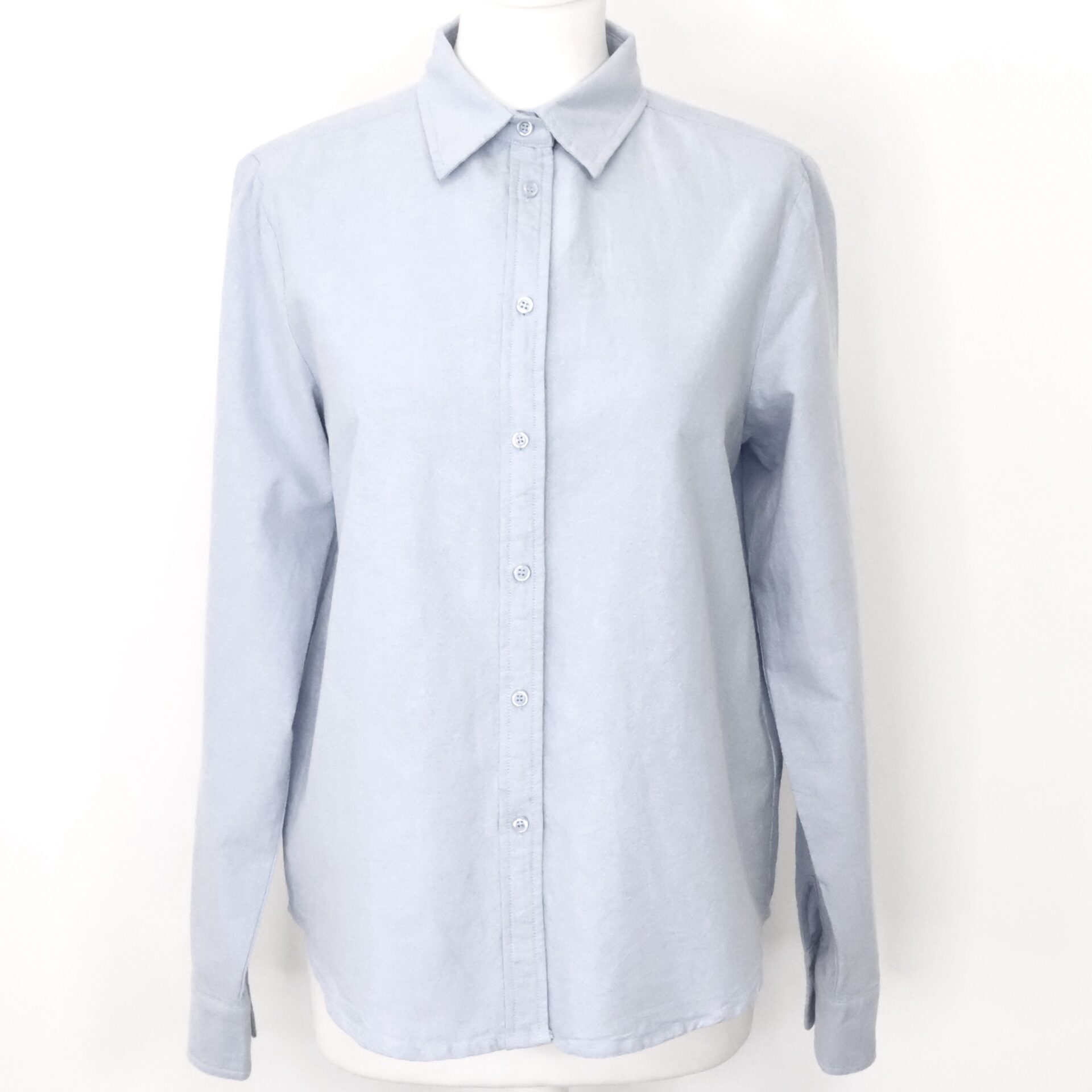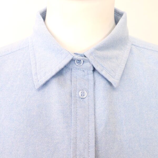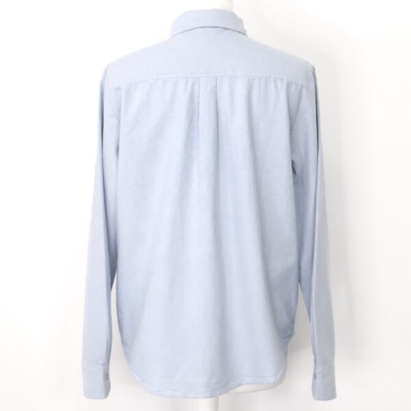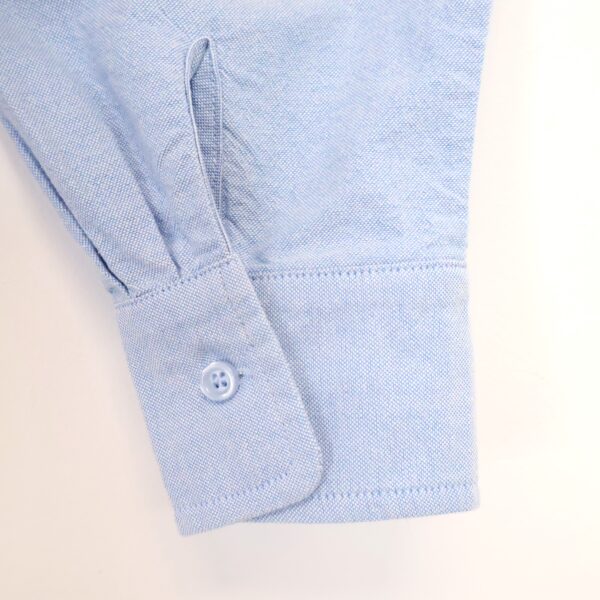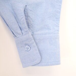 Camisa azul celeste de manga larga. Con cuello camisero. Abotonada de arriba a abajo. Botón en los puños. Mayor largura en la parte trasera.