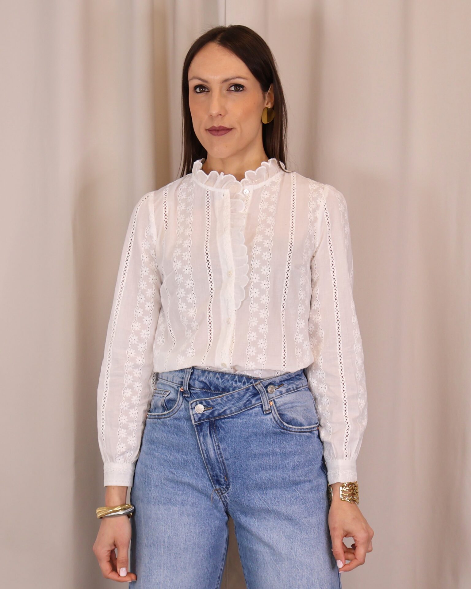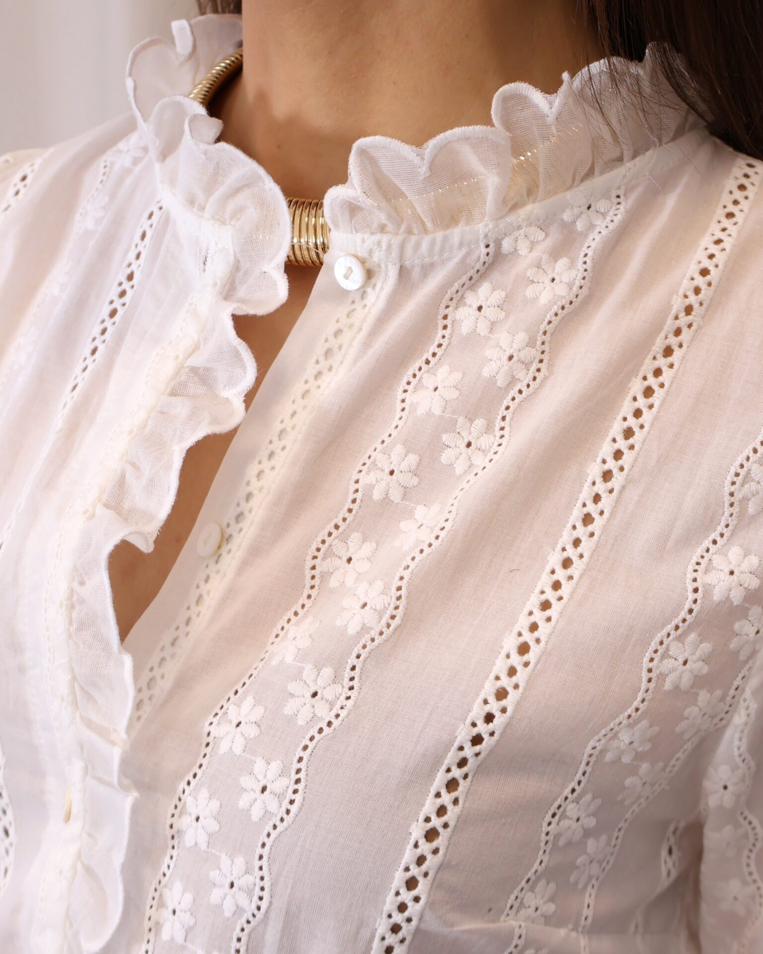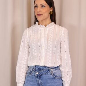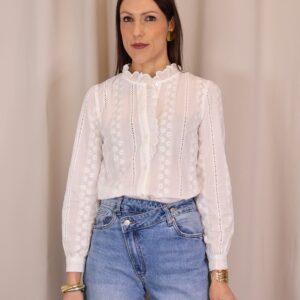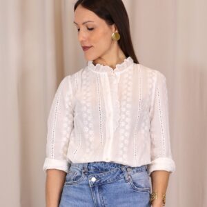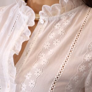 Camisa blanca con delicados bordados de flores y detalles calados. Su cuello alto con volante y diseño femenino la hacen perfecta para looks elegantes o casuales. Cuenta con manga larga y cierre frontal con botones. Un básico versátil y atemporal para tu armario.