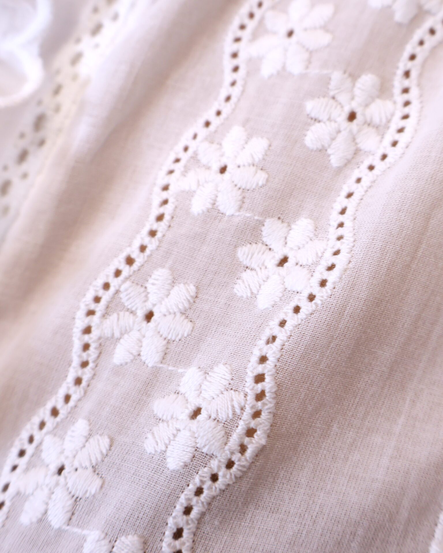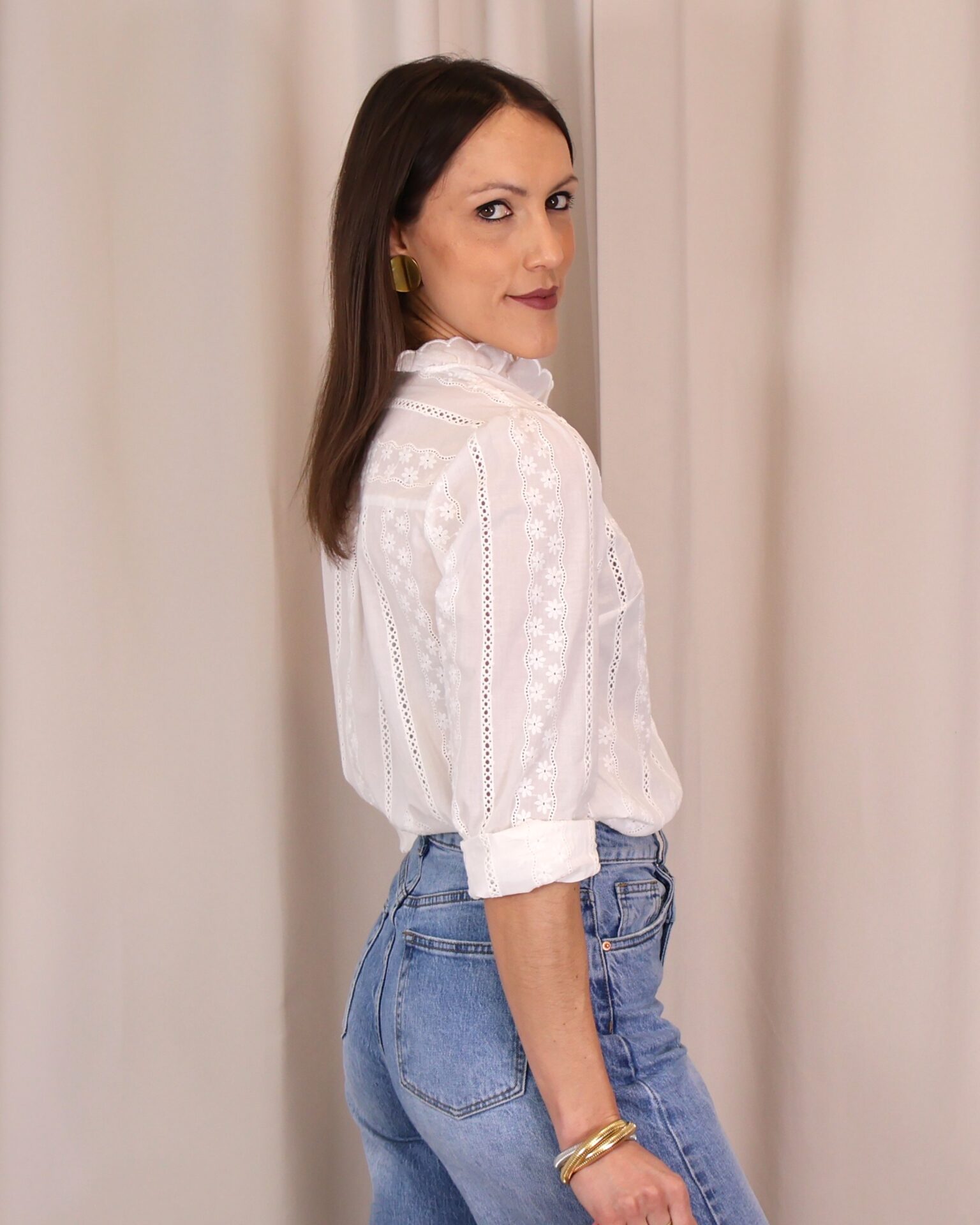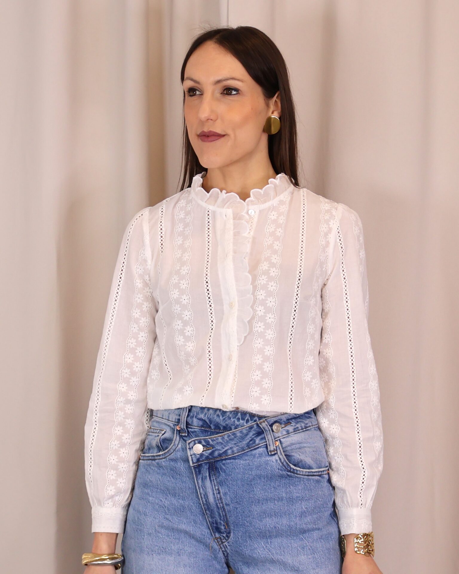 Camisa blanca con delicados bordados de flores y detalles calados. Su cuello alto con volante y diseño femenino la hacen perfecta para looks elegantes o casuales. Cuenta con manga larga y cierre frontal con botones. Un básico versátil y atemporal para tu armario.