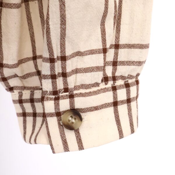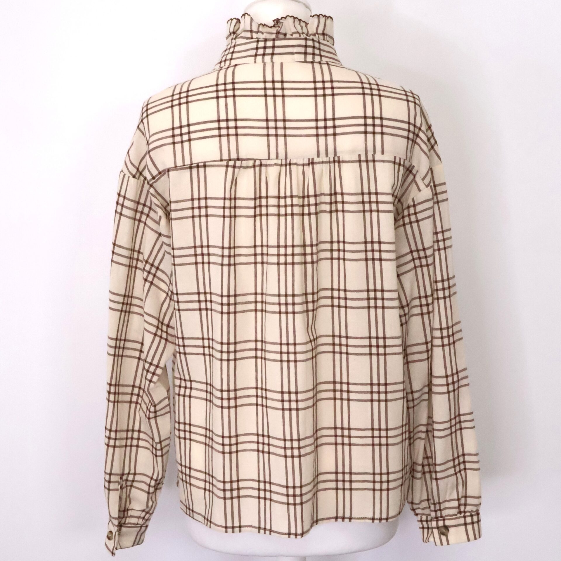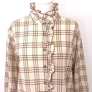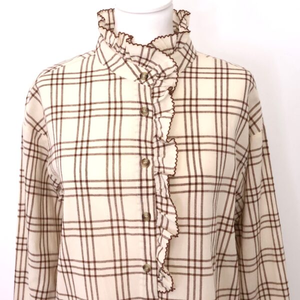 Camisa de manga larga beige con estampado de cuadros en marrón chocolate. Cuello redondo. Volante decorativo en cuello y pecho. Abotonada de arriba a bajo. Con botón en los puños.