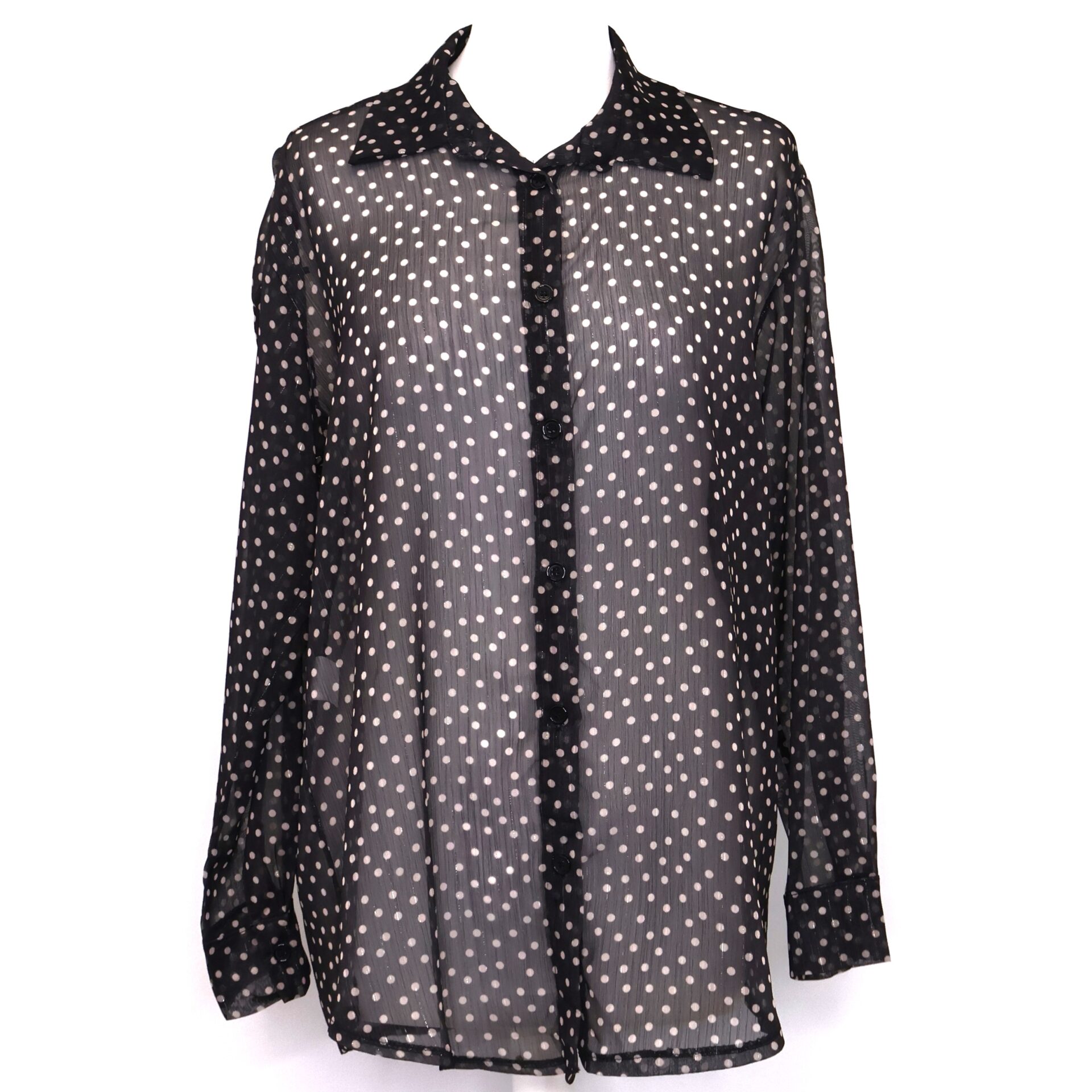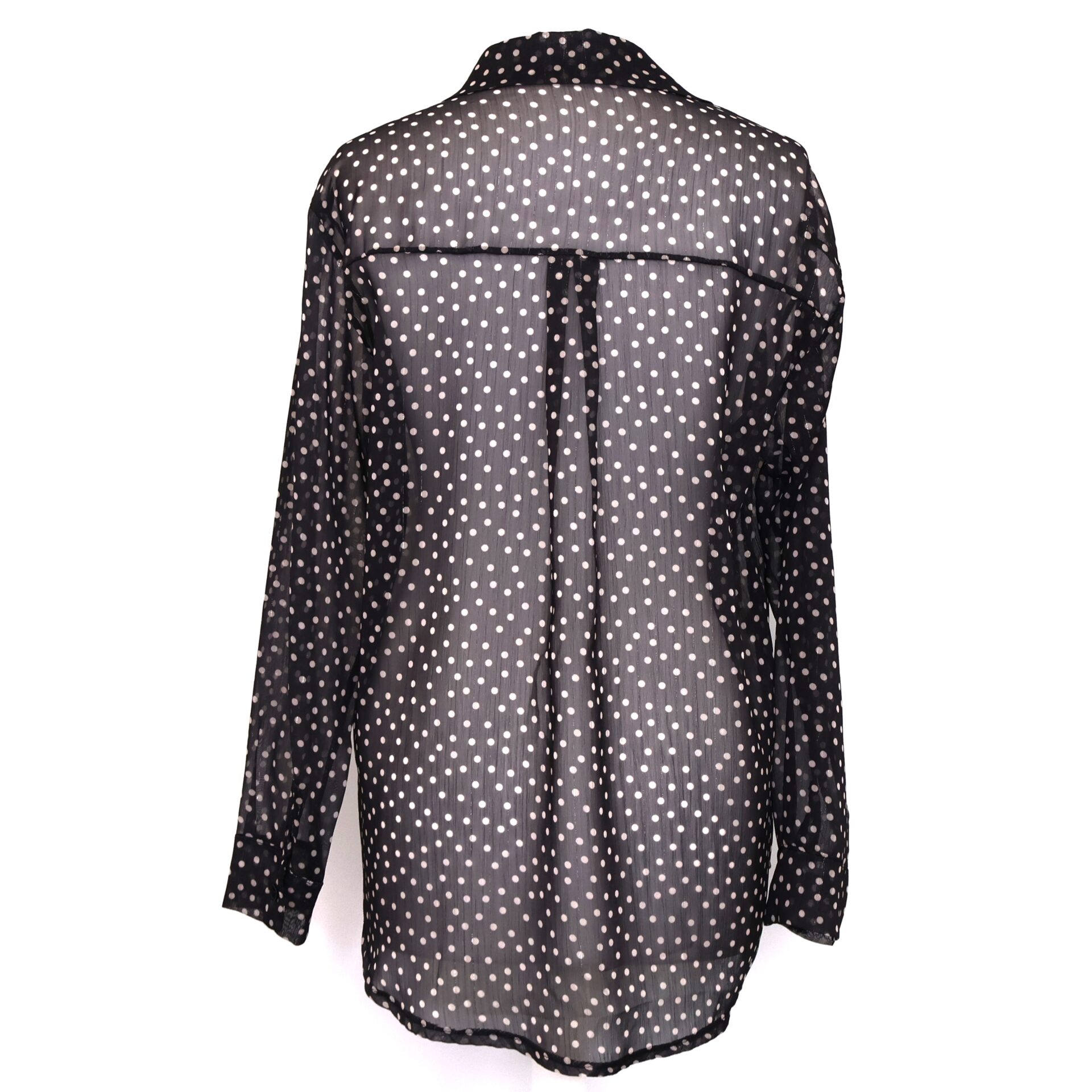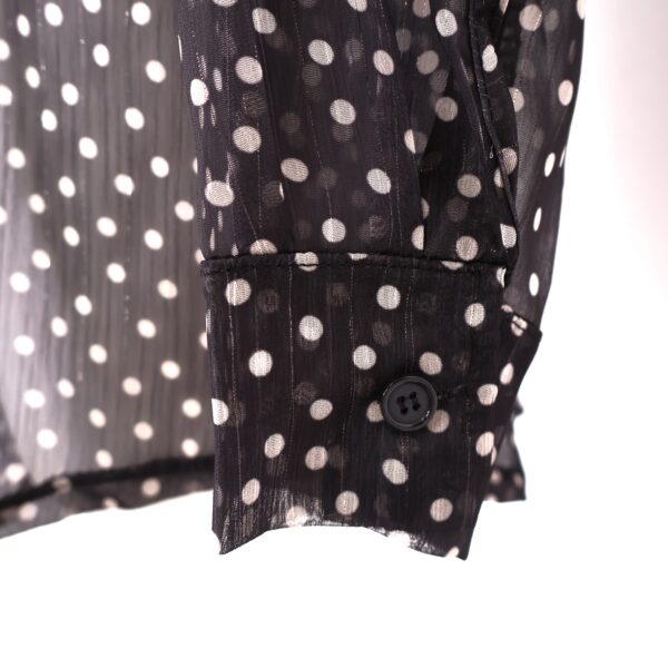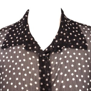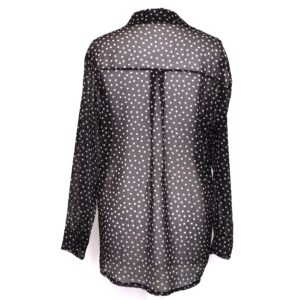 Camisa de manga larga de color negro con estampado de lunares a contraste en blanco. Con cuello camisa y abotonada de arriba a bajo. Botón en los puños.