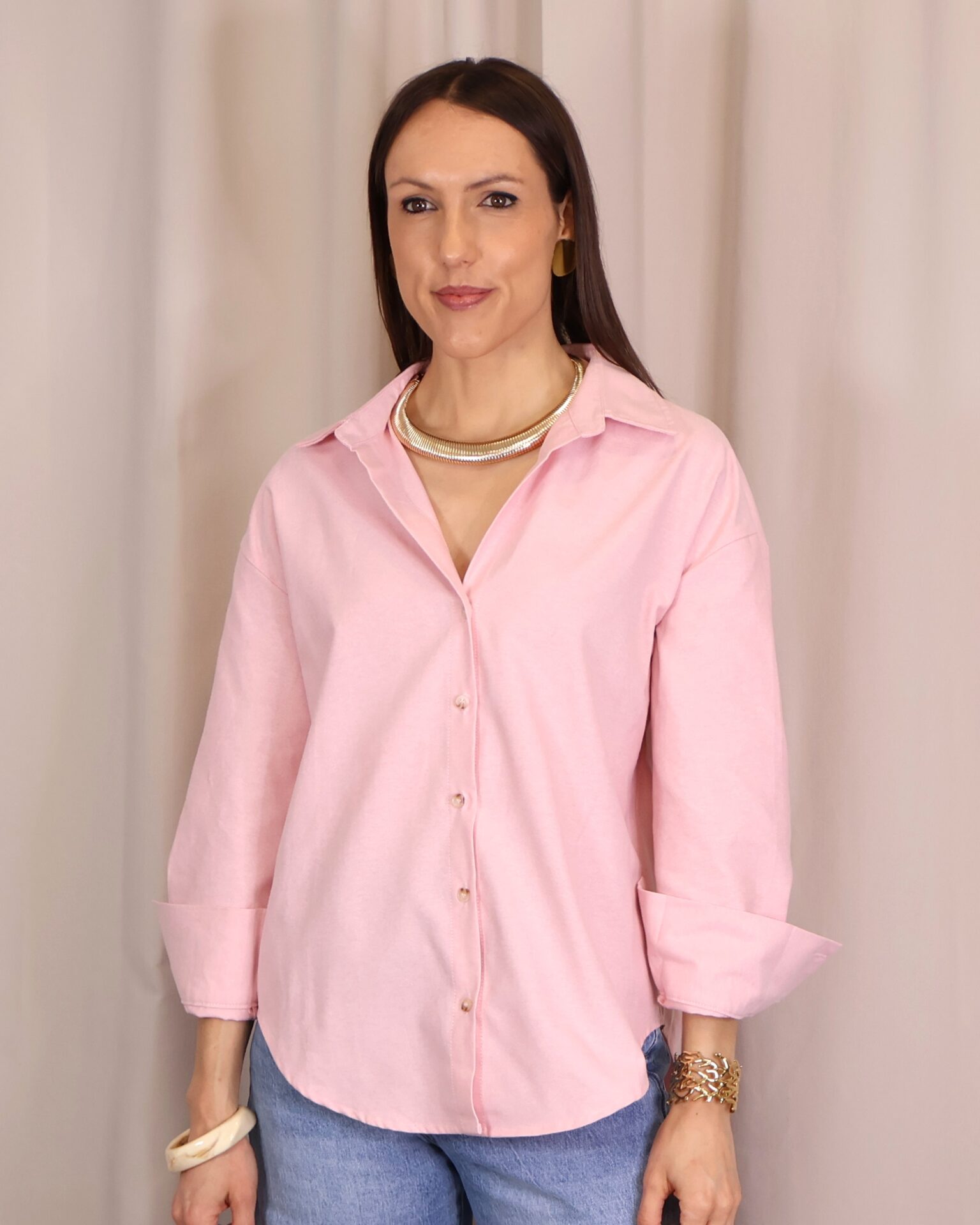 Camisa rosa de diseño atemporal con cuello camisero y cierre frontal abotonado de arriba a abajo. Presenta manga caída que aporta un estilo más relajado y moderno, junto con puños abotonados que añaden un toque elegante y estructurado.