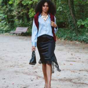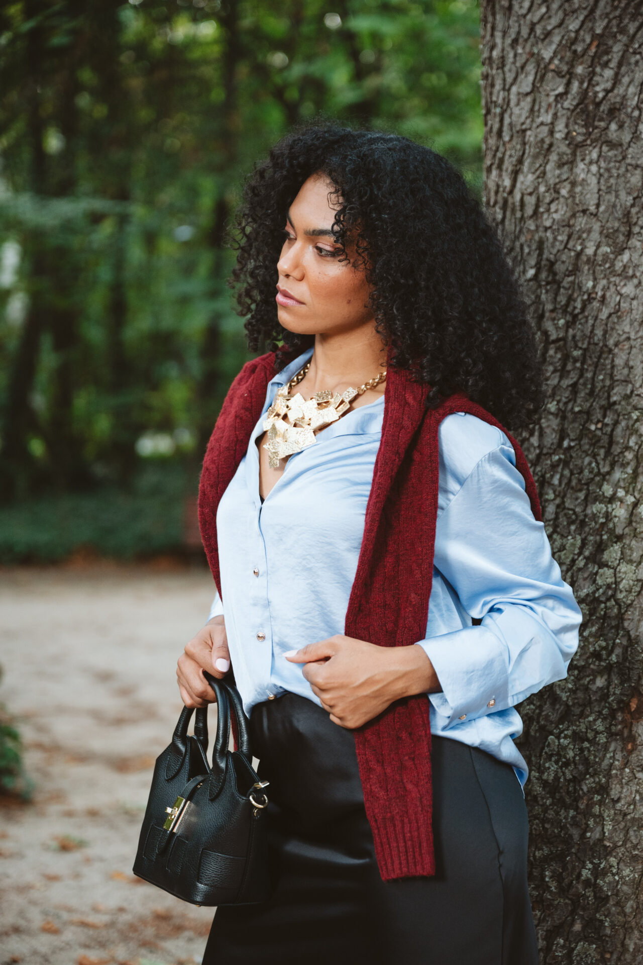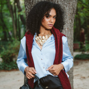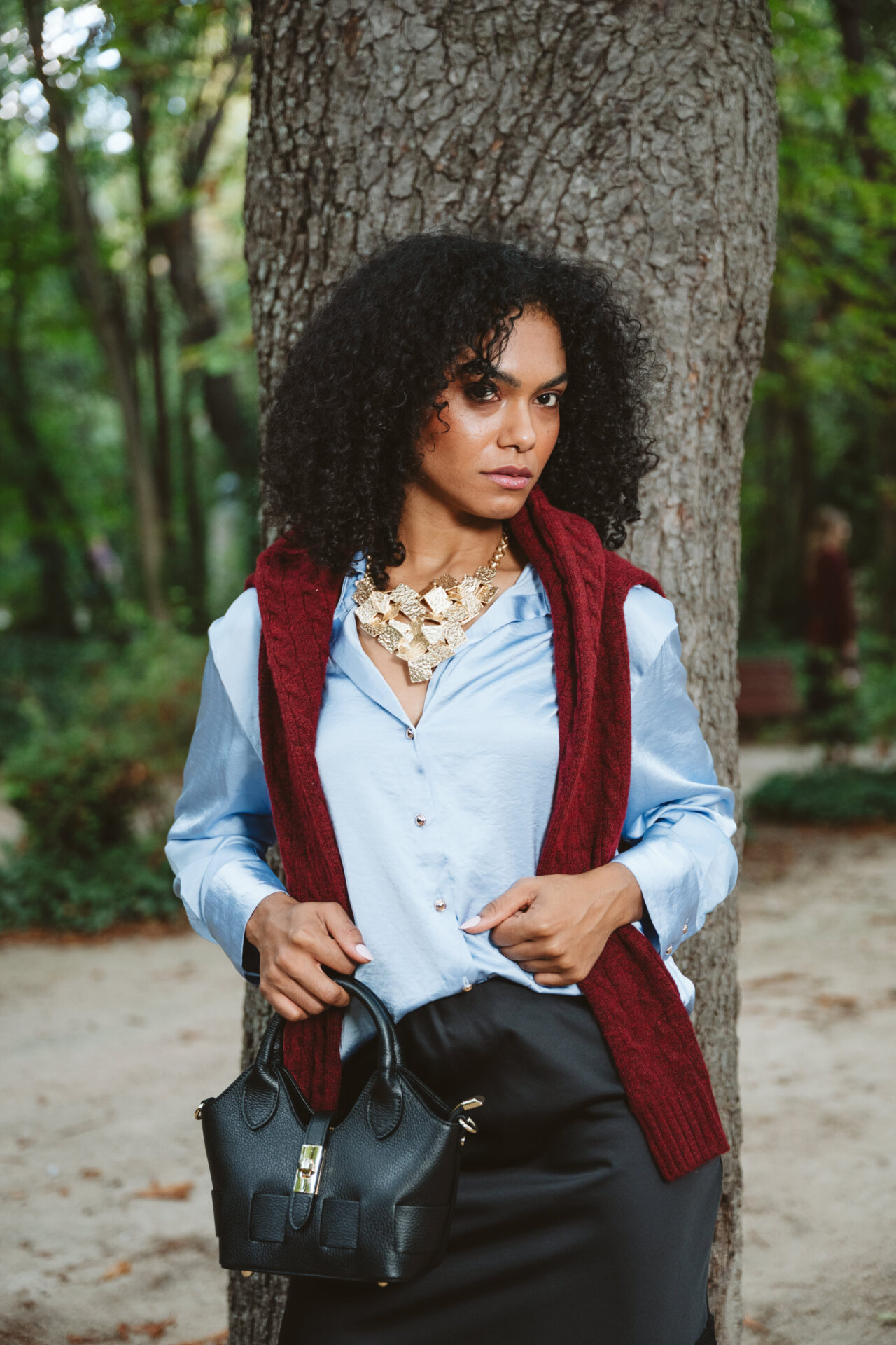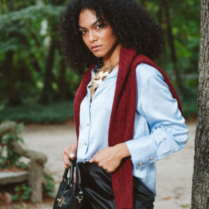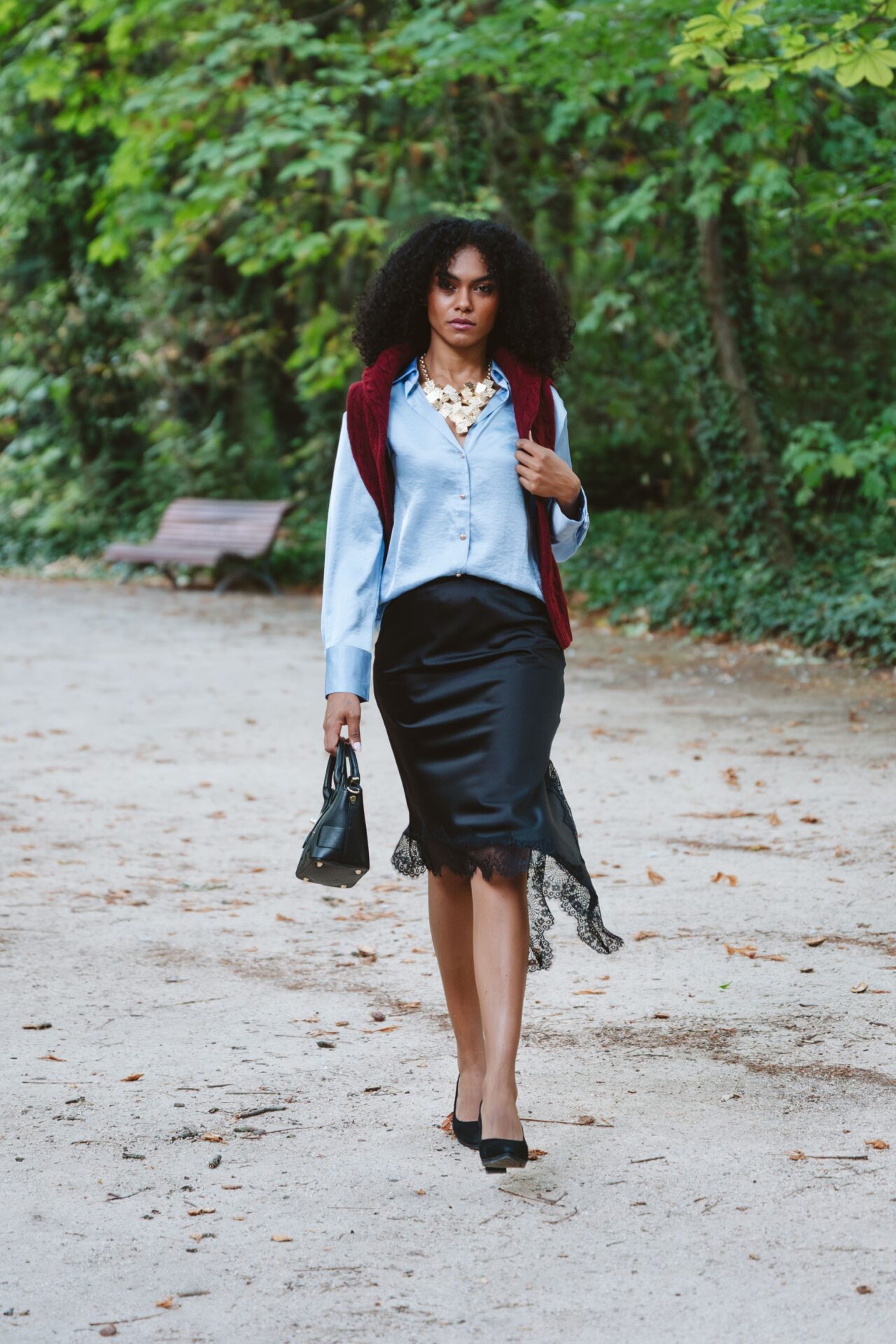 Camisa satinada azul celeste de manga larga. Con cuello en pico y abotonada de arriba a abajo. Botón en los puños.