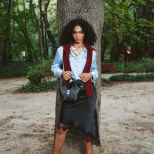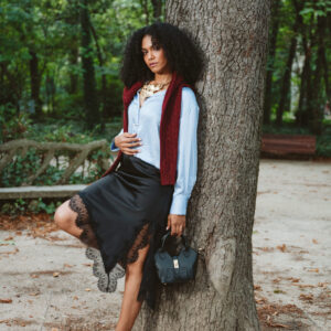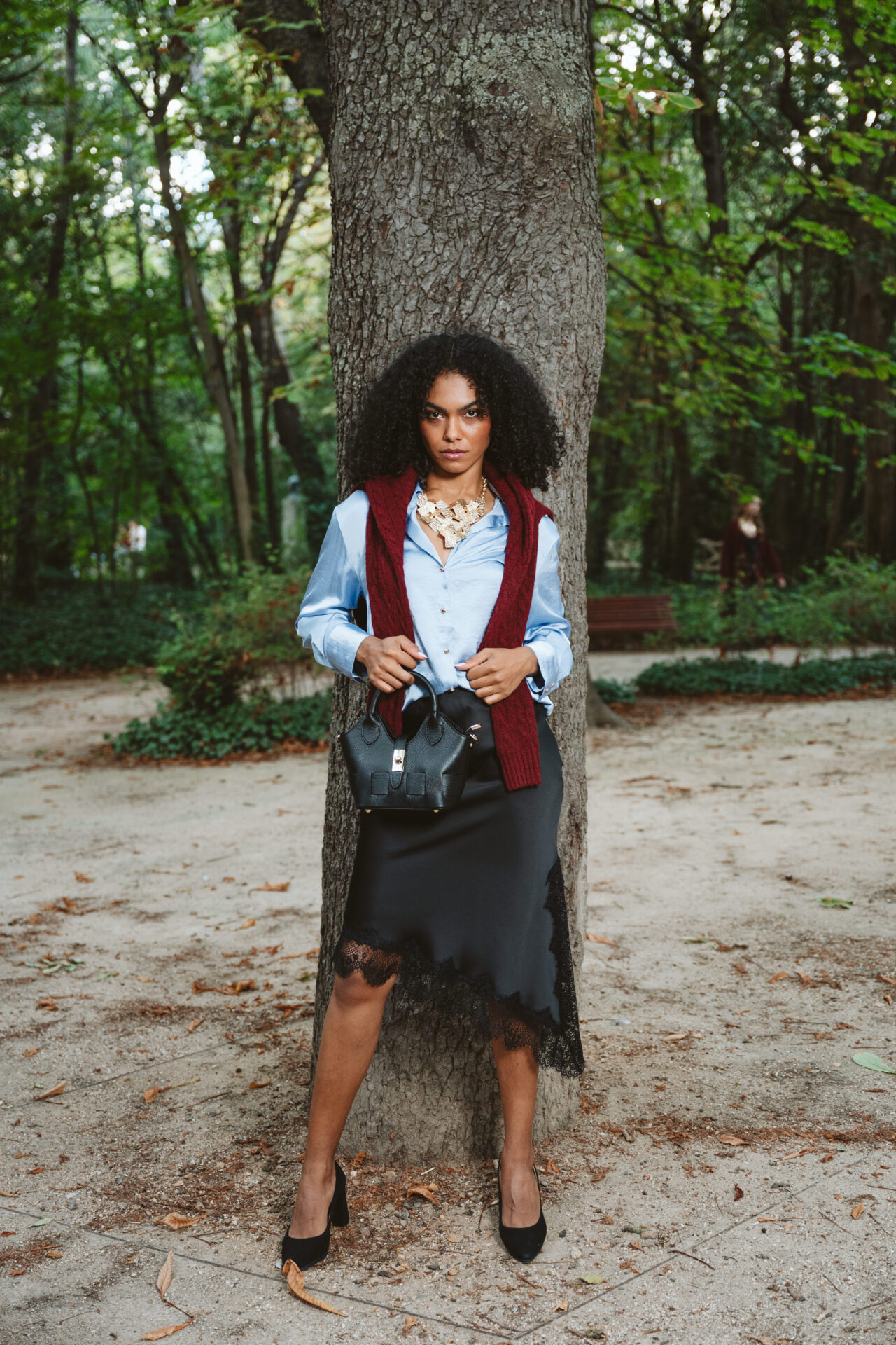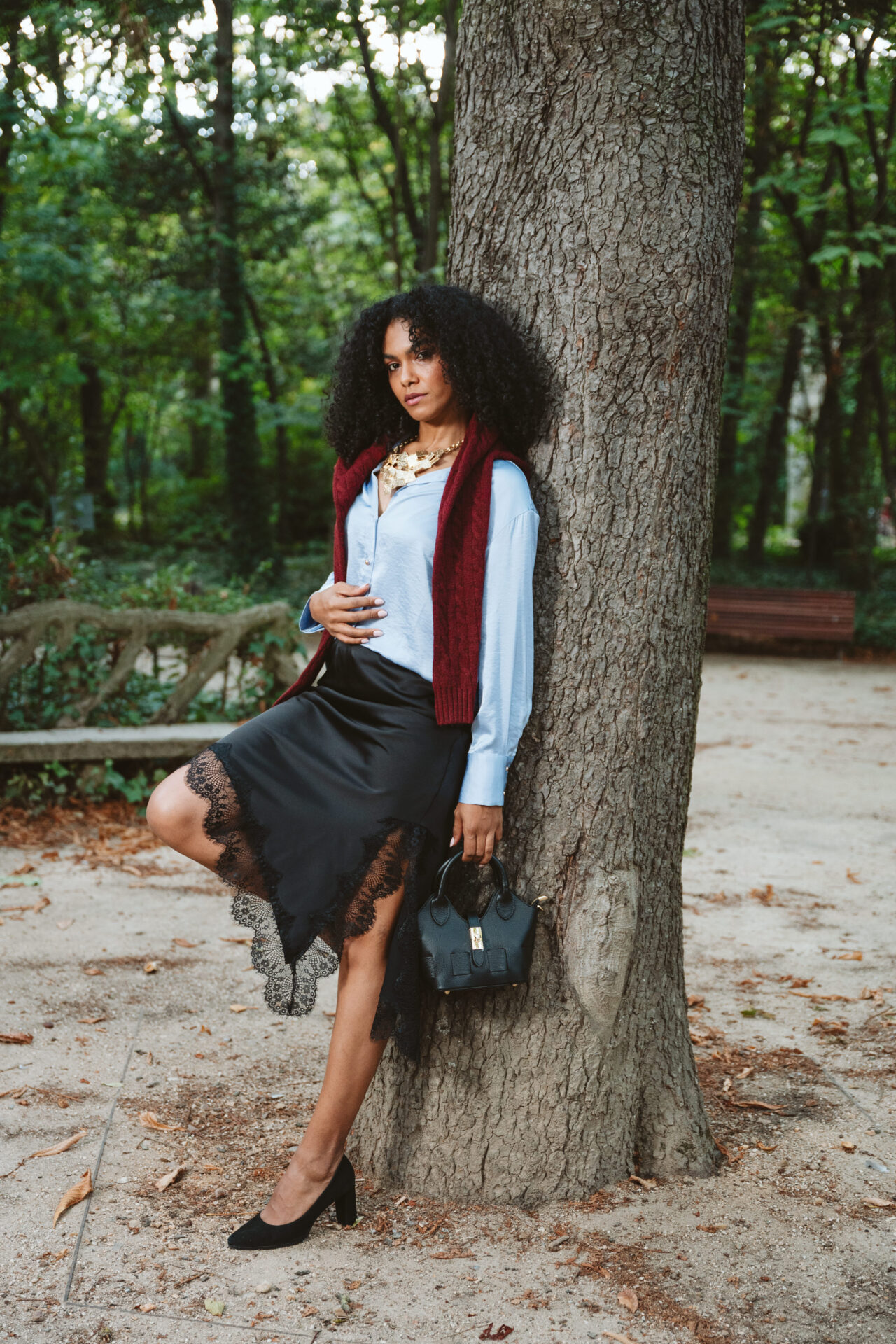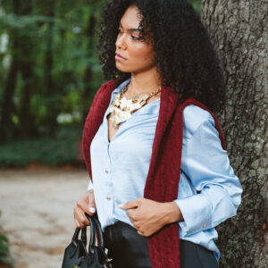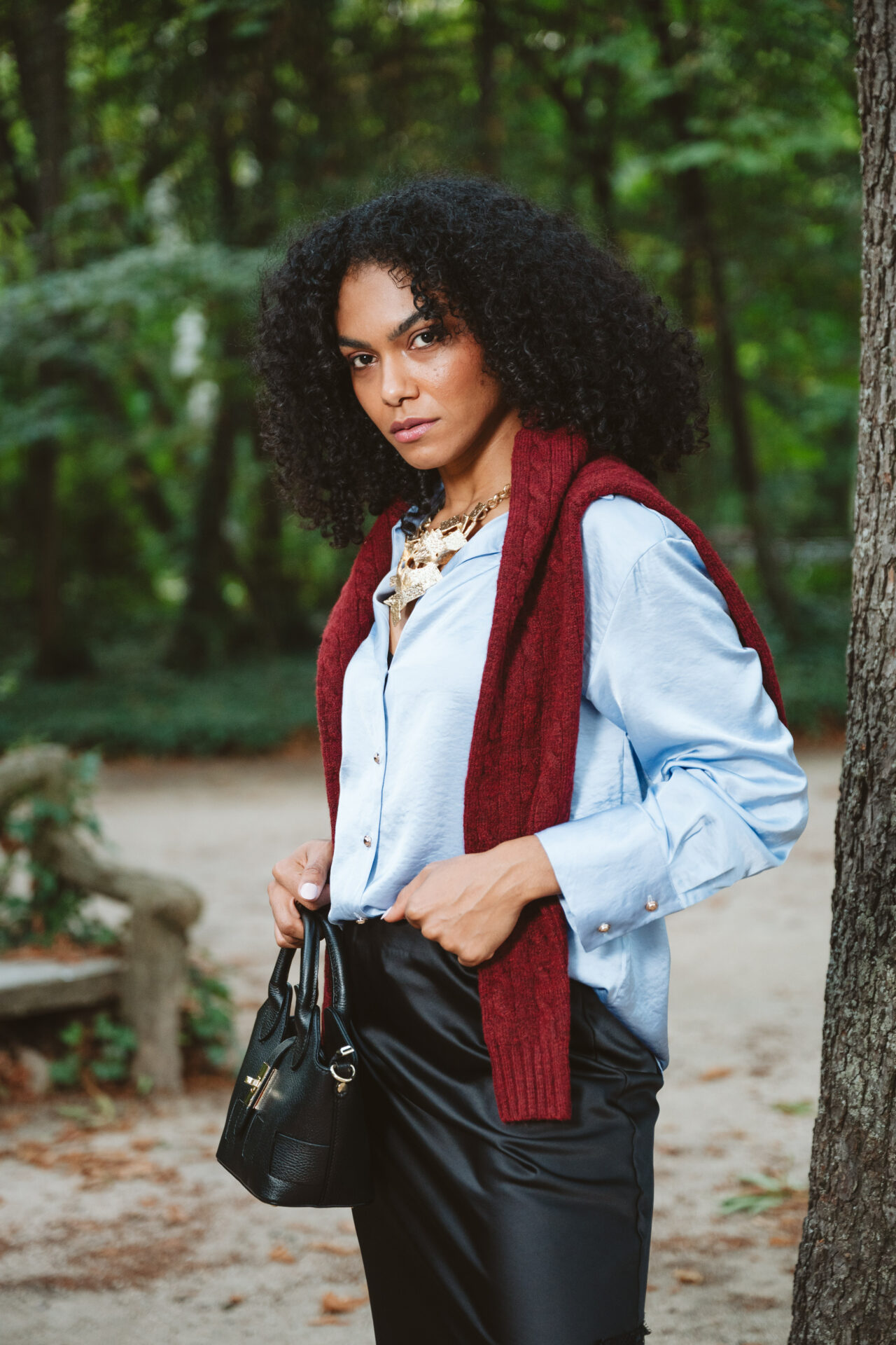 Camisa satinada azul celeste de manga larga. Con cuello en pico y abotonada de arriba a abajo. Botón en los puños.