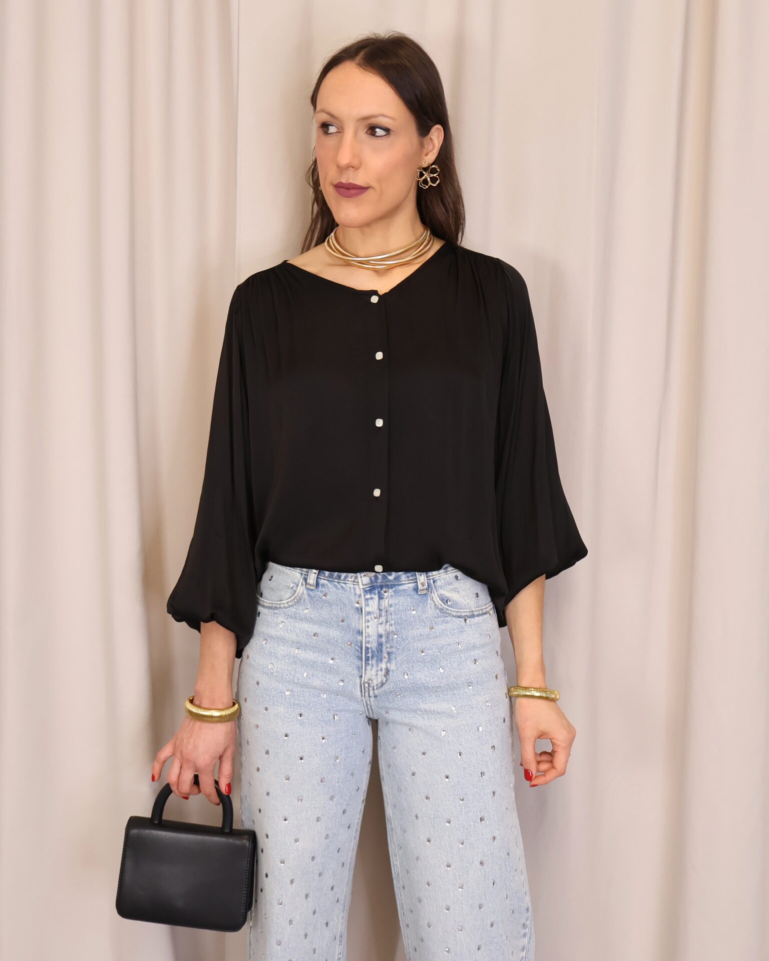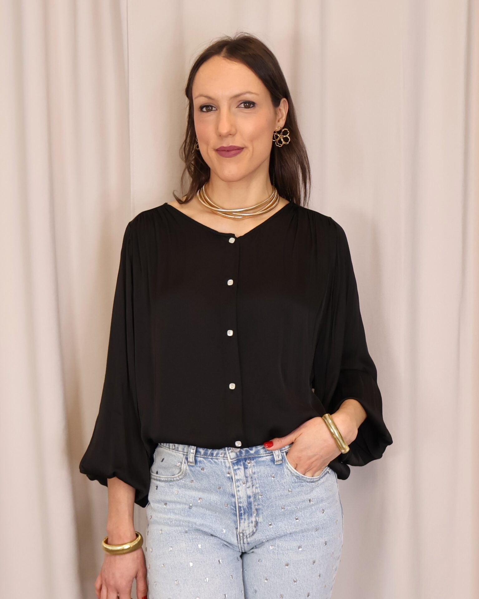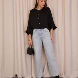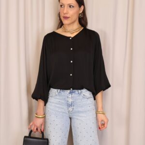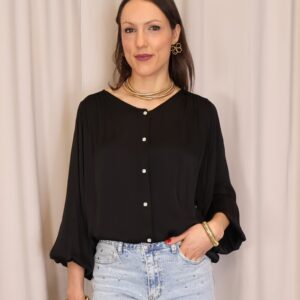 Camisa satinada negra de manga larga. Con cuello redondo y abotonada de arriba a abajo. Goma en los puños. Ligeramente más larga en la part trasera
