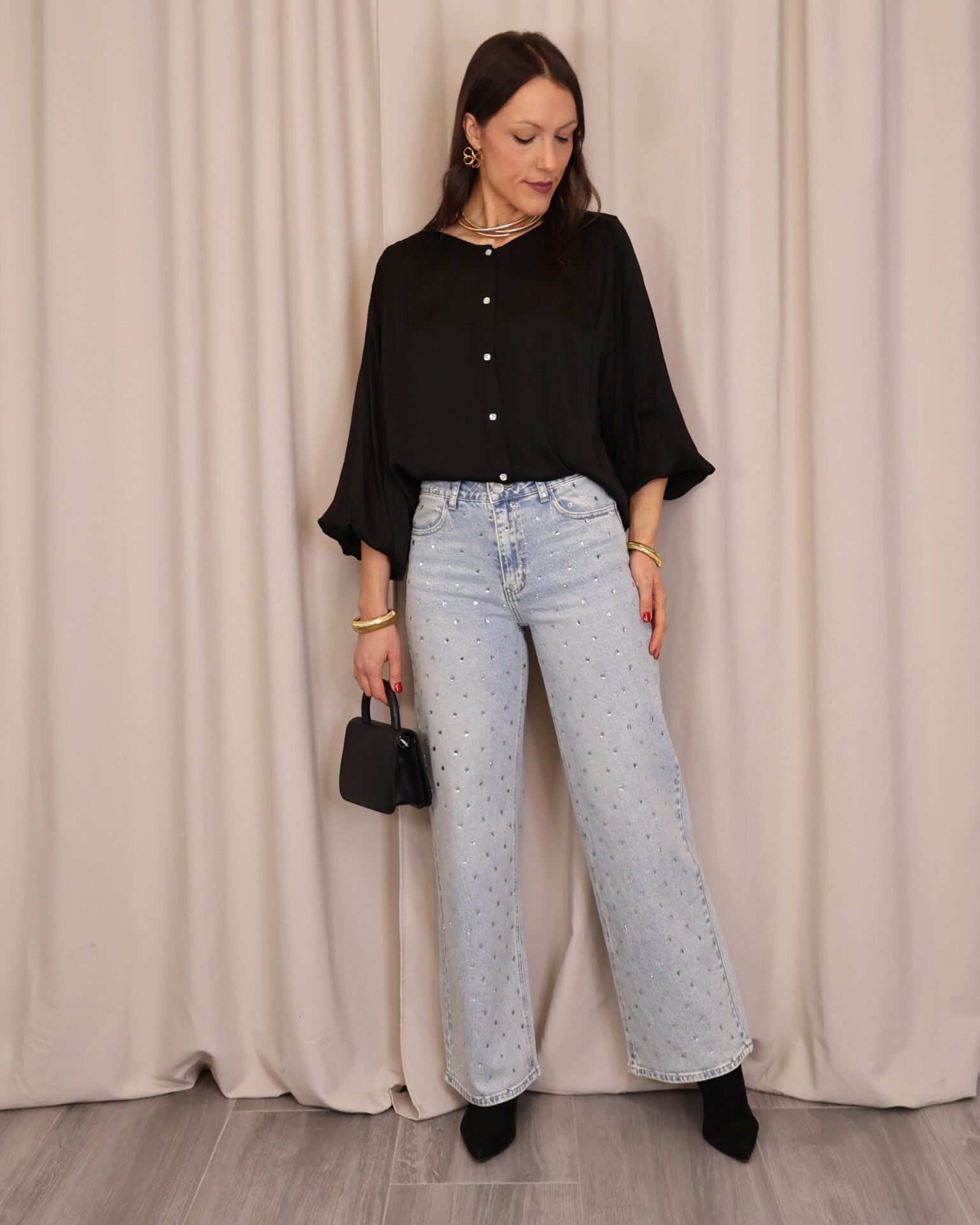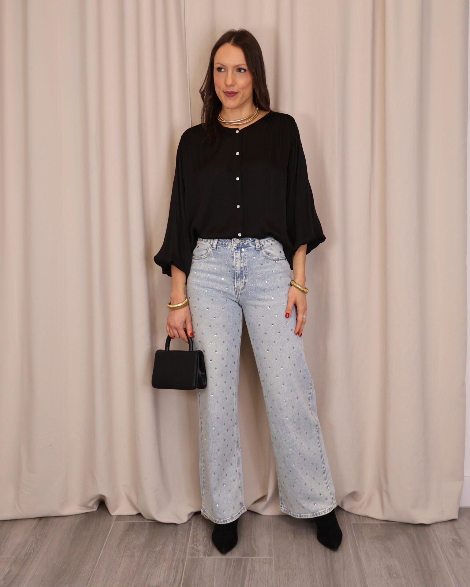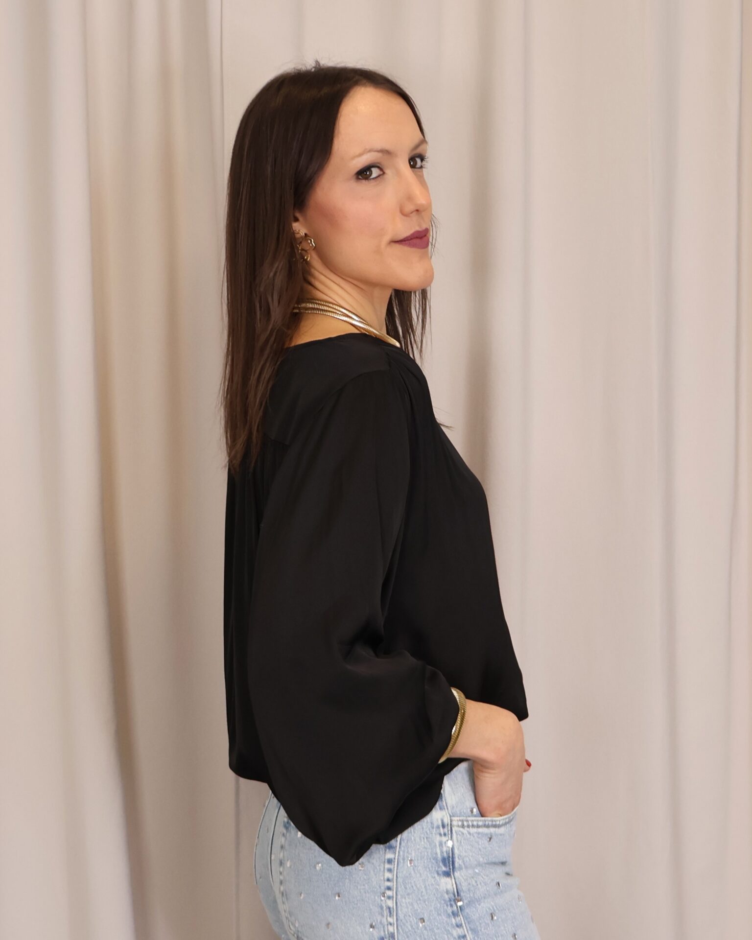 Camisa satinada negra de manga larga. Con cuello redondo y abotonada de arriba a abajo. Goma en los puños. Ligeramente más larga en la part trasera