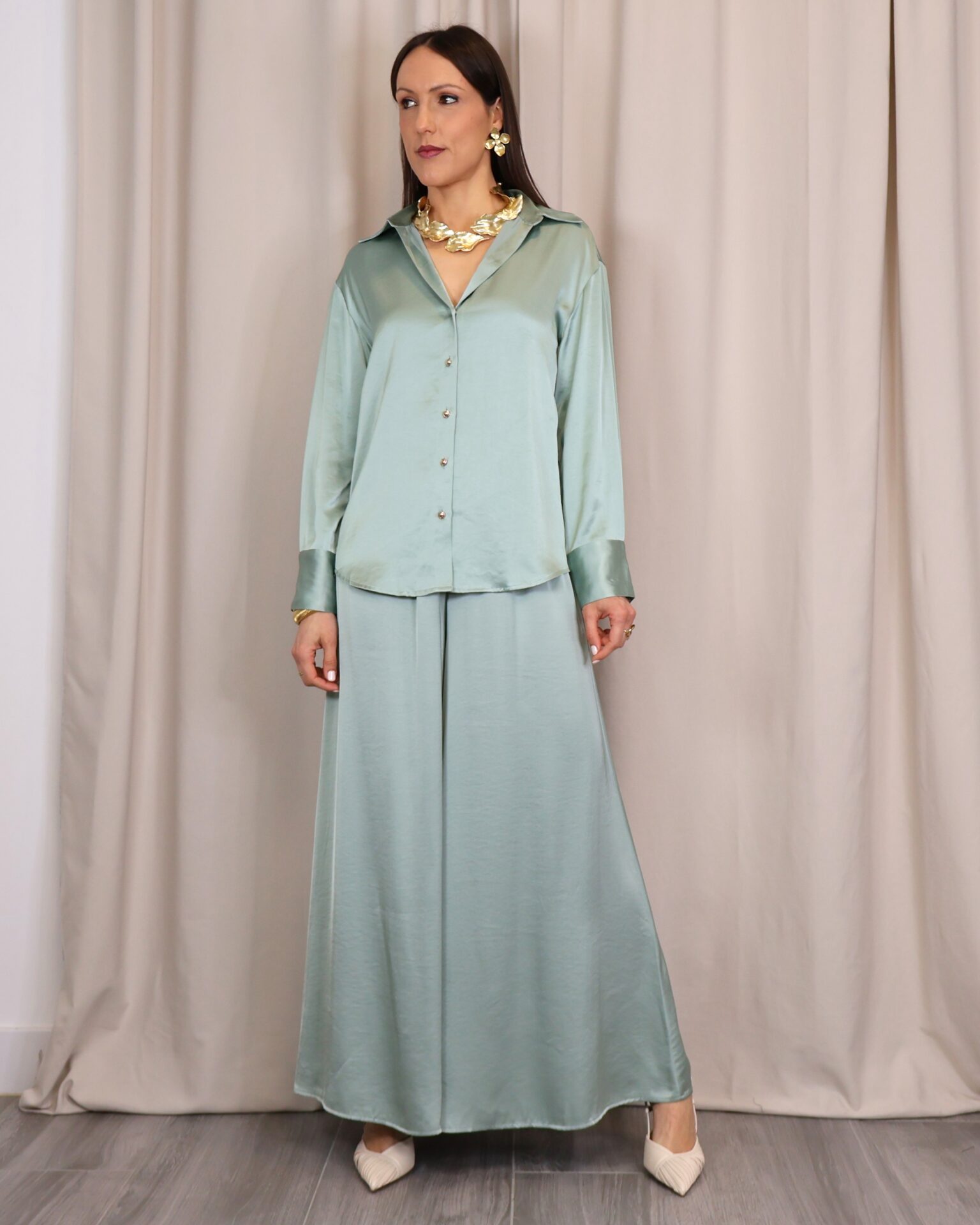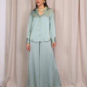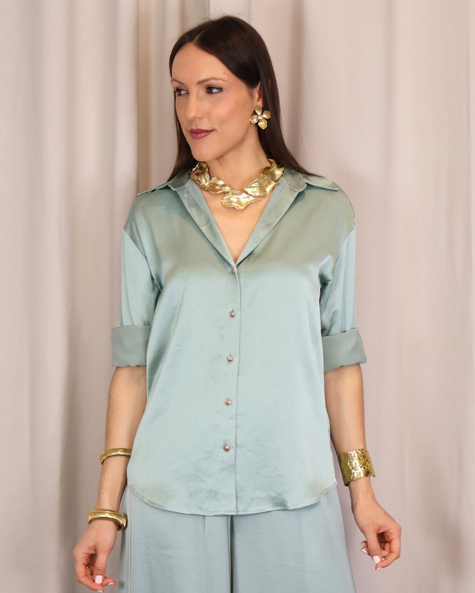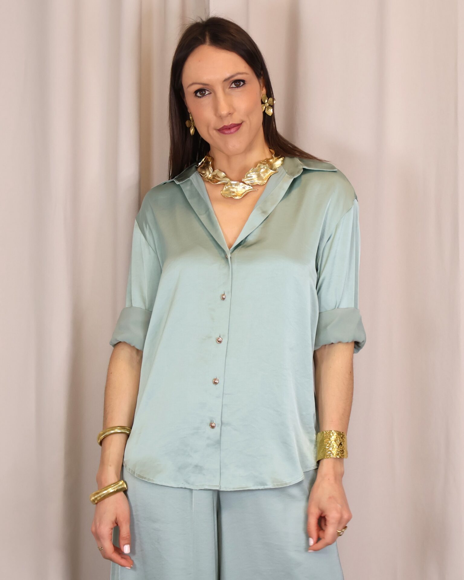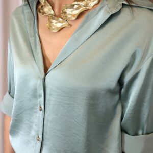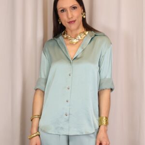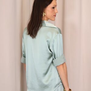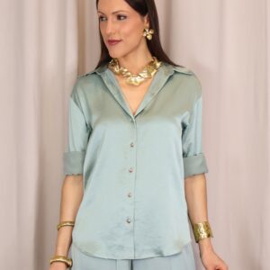 Camisa satinada en color verde agua, una prenda elegante y versátil que aporta un toque sofisticado a cualquier conjunto. Diseñada con manga larga y un favorecedor cuello en pico, estiliza la figura y realza el escote con sutileza. Su cierre abotonado de arriba a abajo permite llevarla tanto de forma formal como más desenfadada. Los puños con doble botón añaden un acabado cuidado y refinado, ideal para looks de día o de noche.