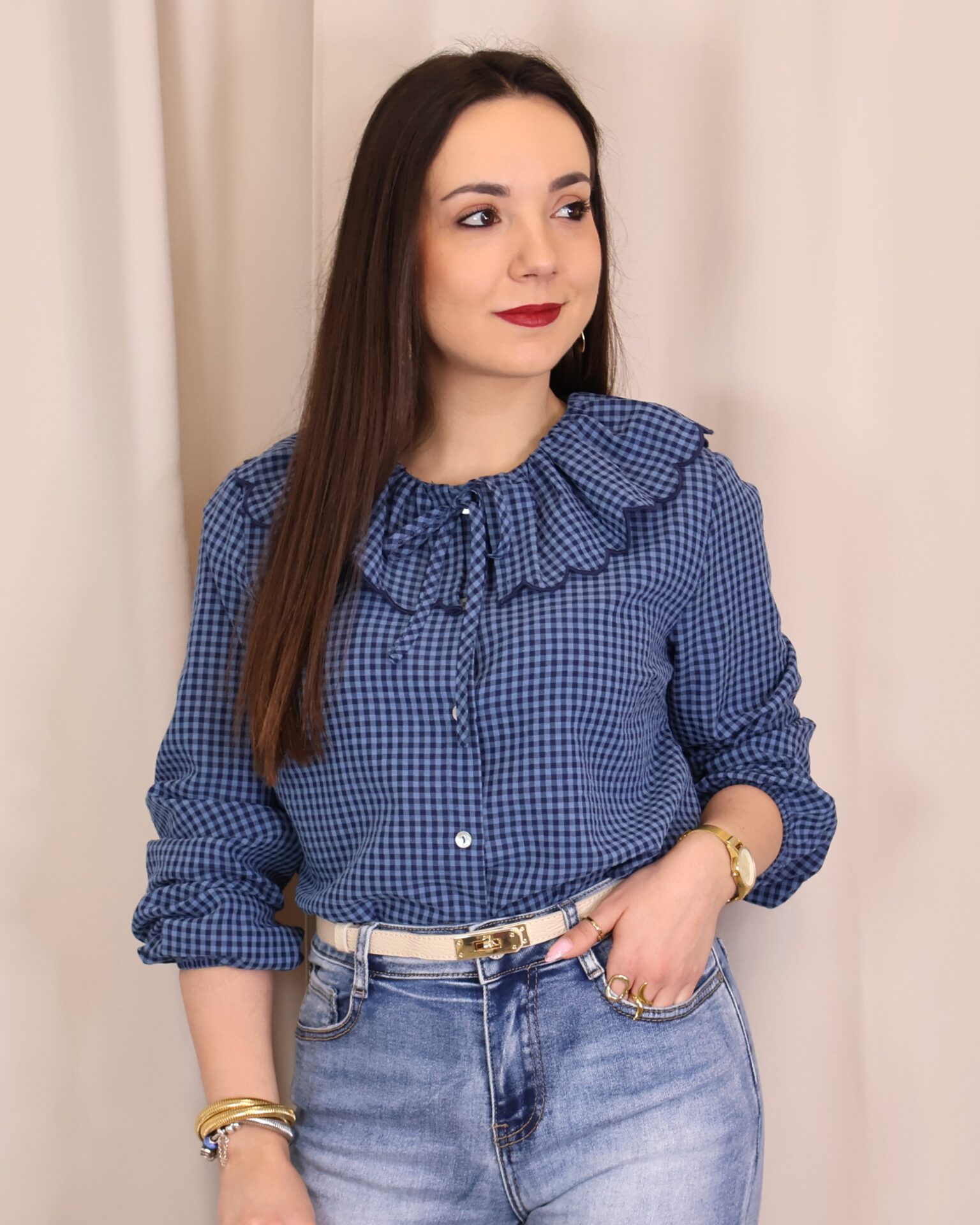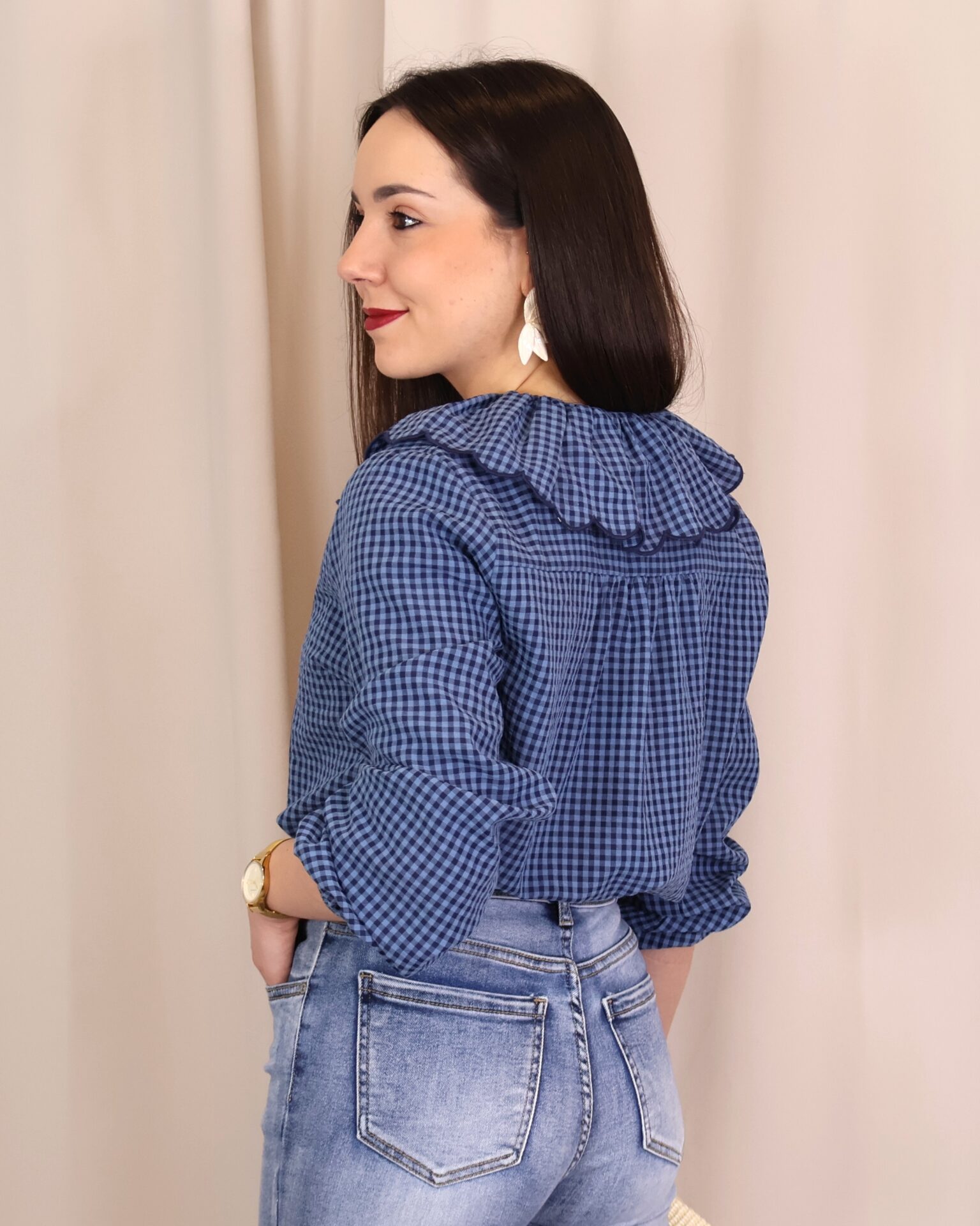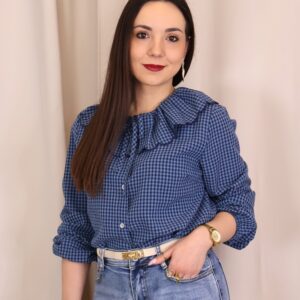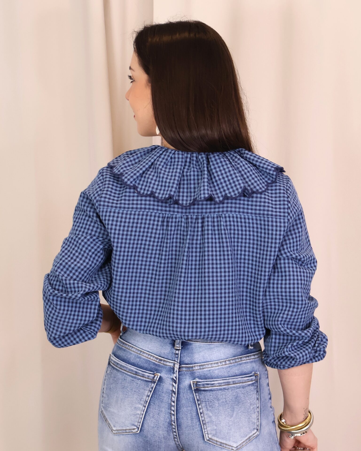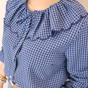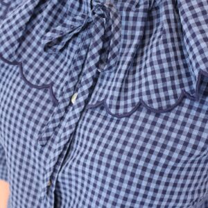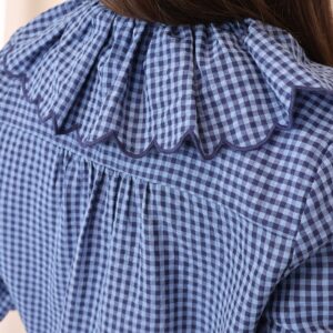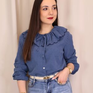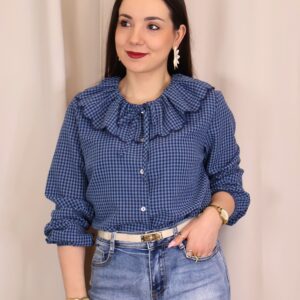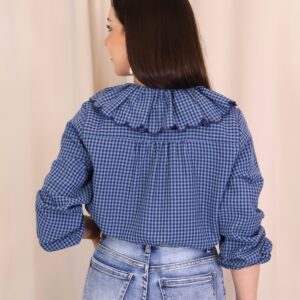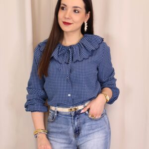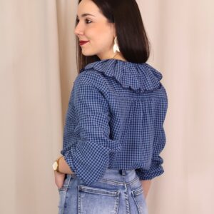 Camisa de estilo romántico en tejido ligero con estampado de cuadros vichy en tonos azules. Destaca por su amplio cuello con volante ondulado en todo el contorno (delantero y trasero) y lazada fina en el cuello, además de cierre frontal con botones. De manga larga con puños con goma y acabado ligeramente fruncido, es una prenda femenina y versátil ideal para looks de diario con un toque especial.